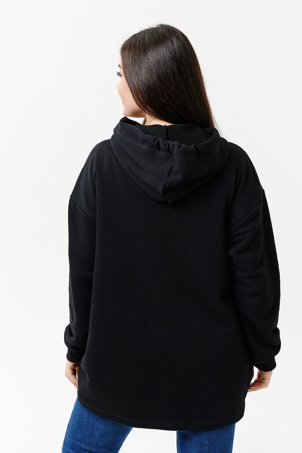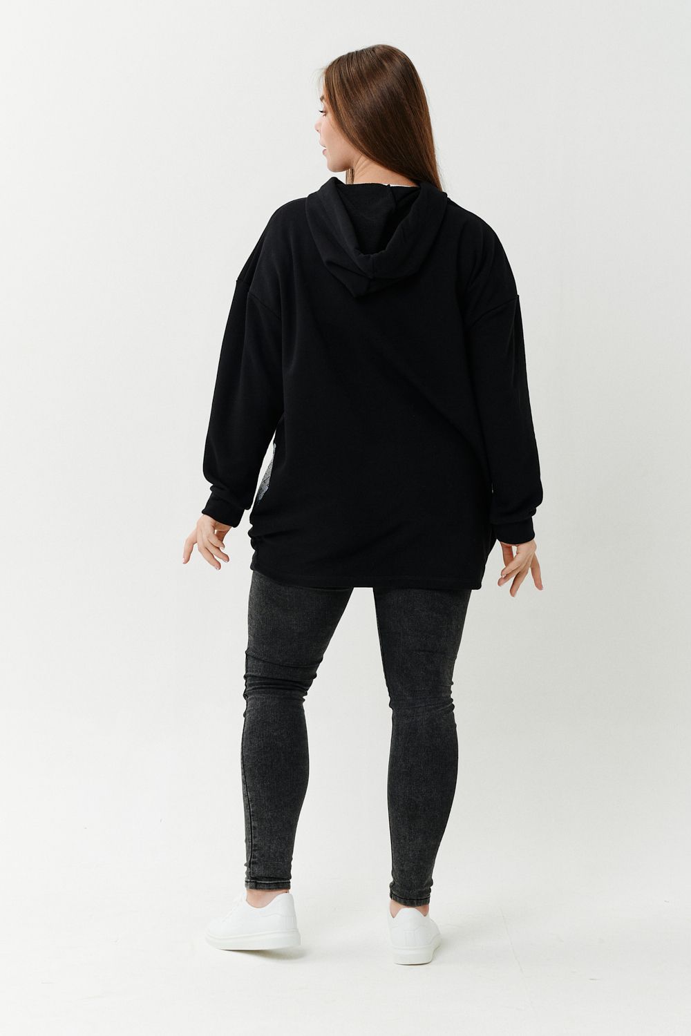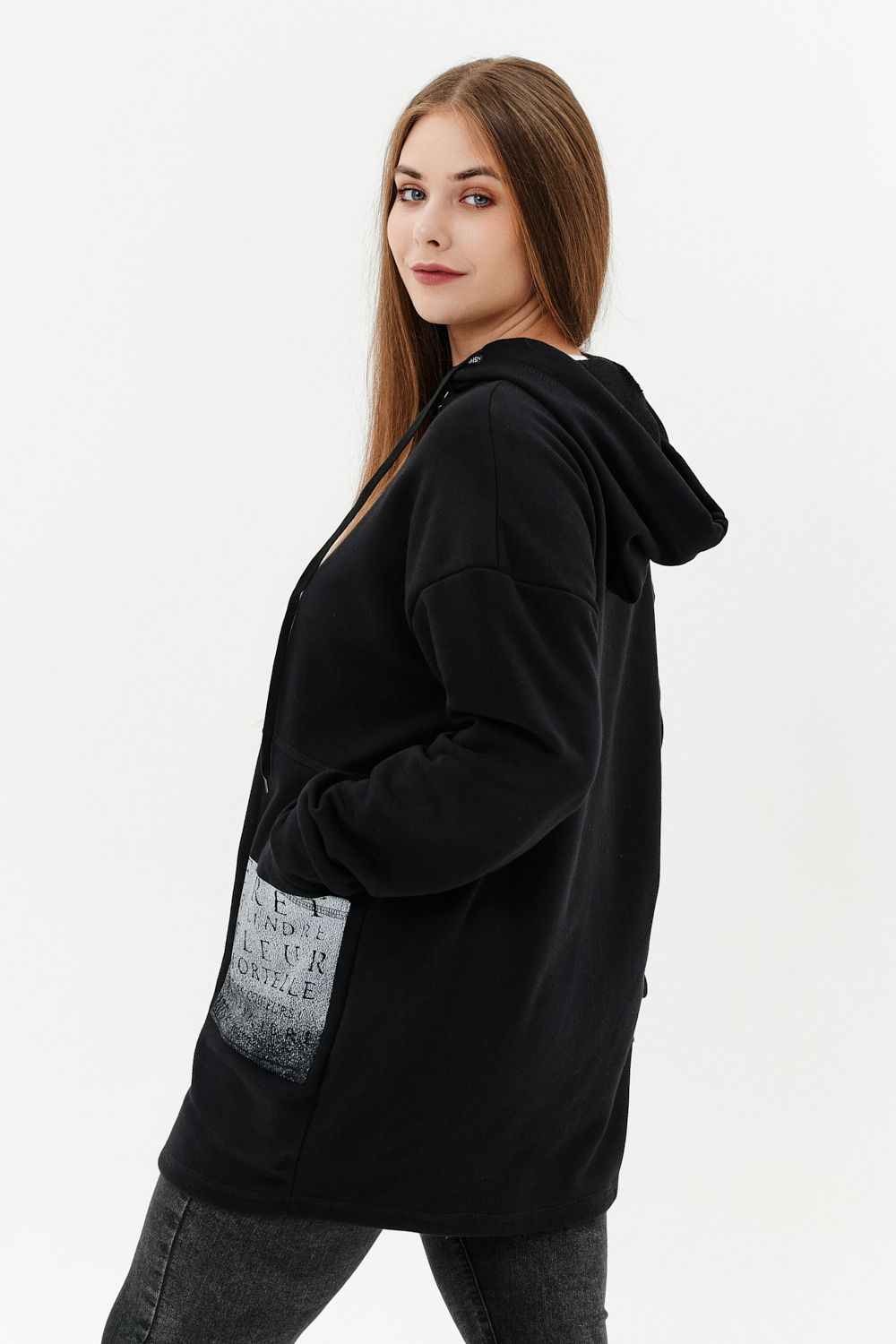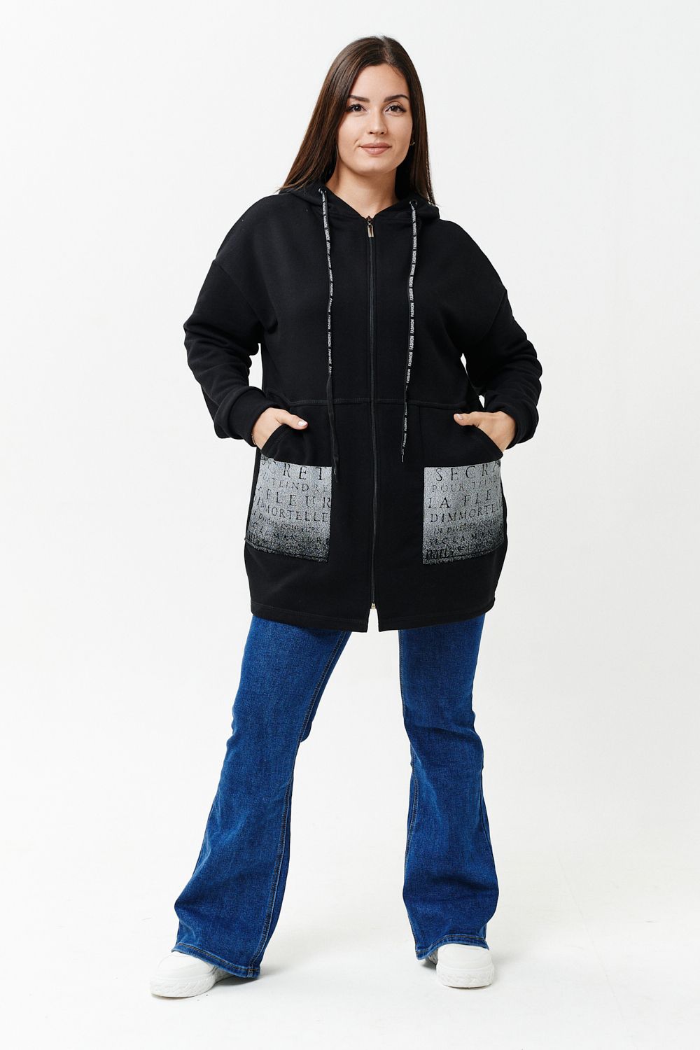 Толстовка женская прямого силуэта до линии бедер, в нижней части заужена по бокам. Рукав втачной с заниженной линией плеча, с манжетой. Капюшон с люверсами и декоративными шнурками с надписью. Застежка на тесьму-молнию. В нижней части полочки два накладных кармана со стильным принтом. Материал - футер 3-х нитка петля.