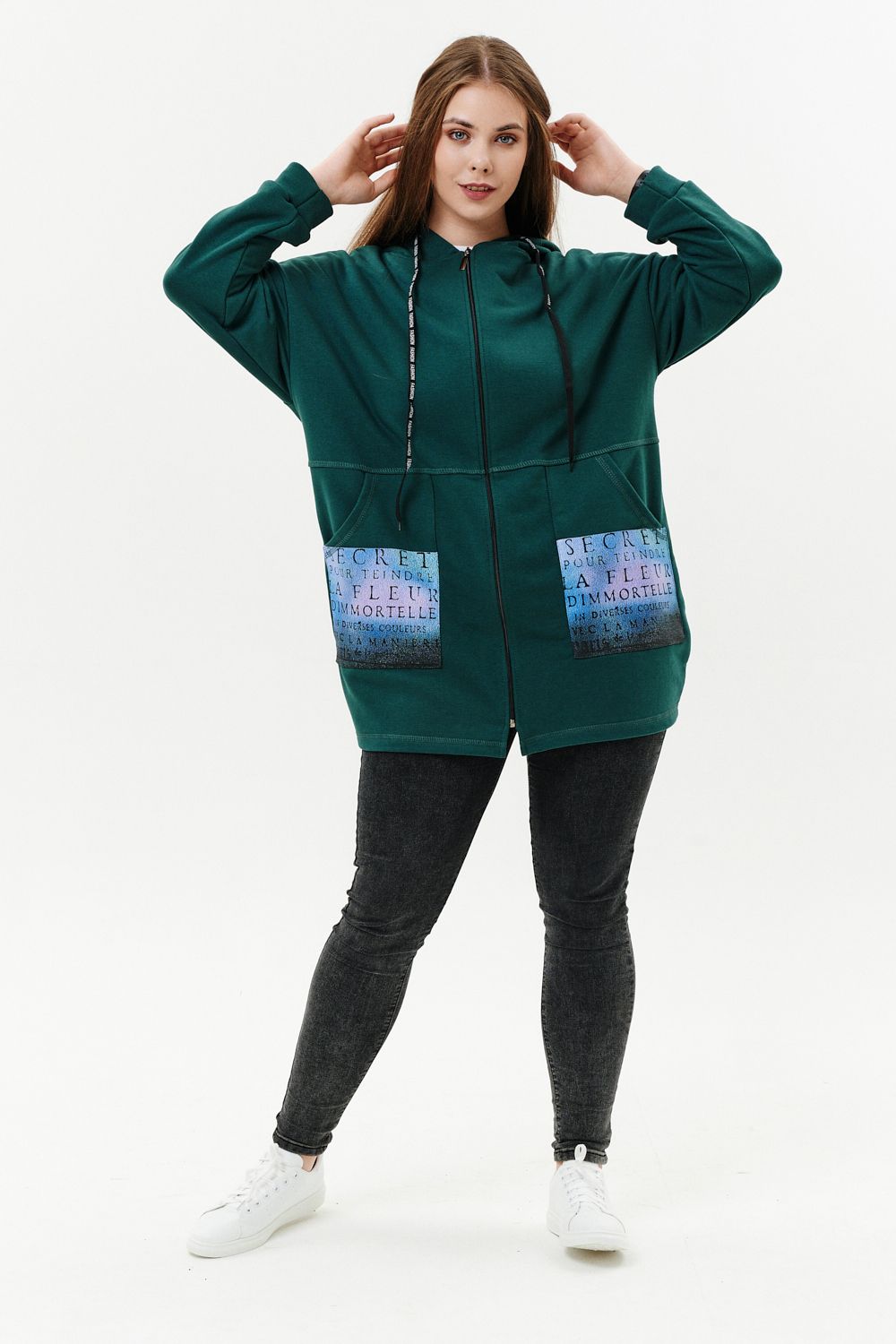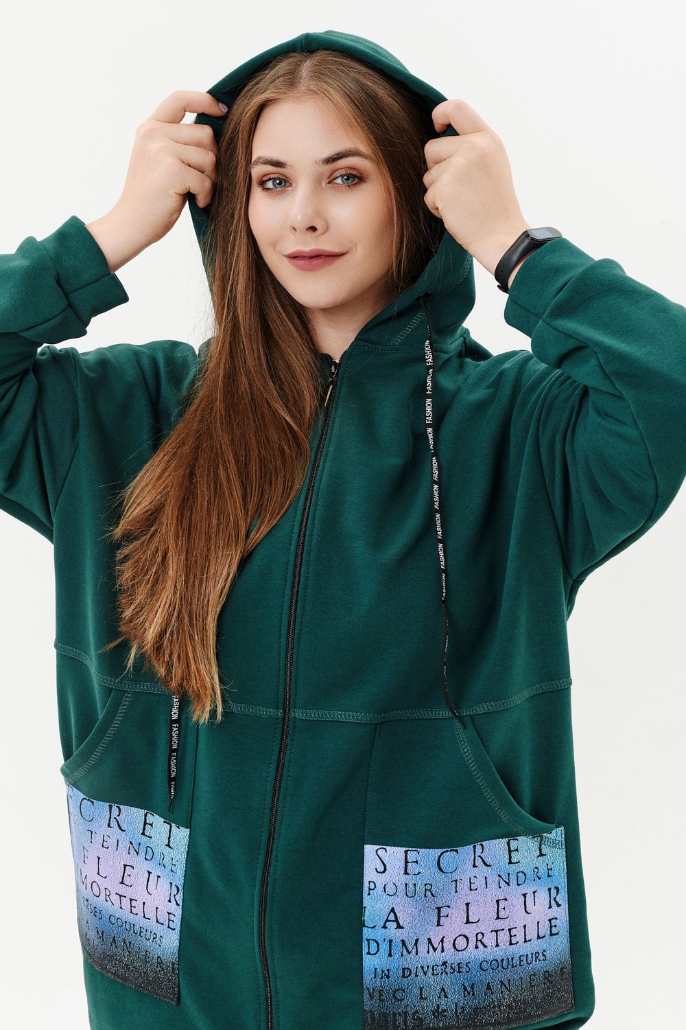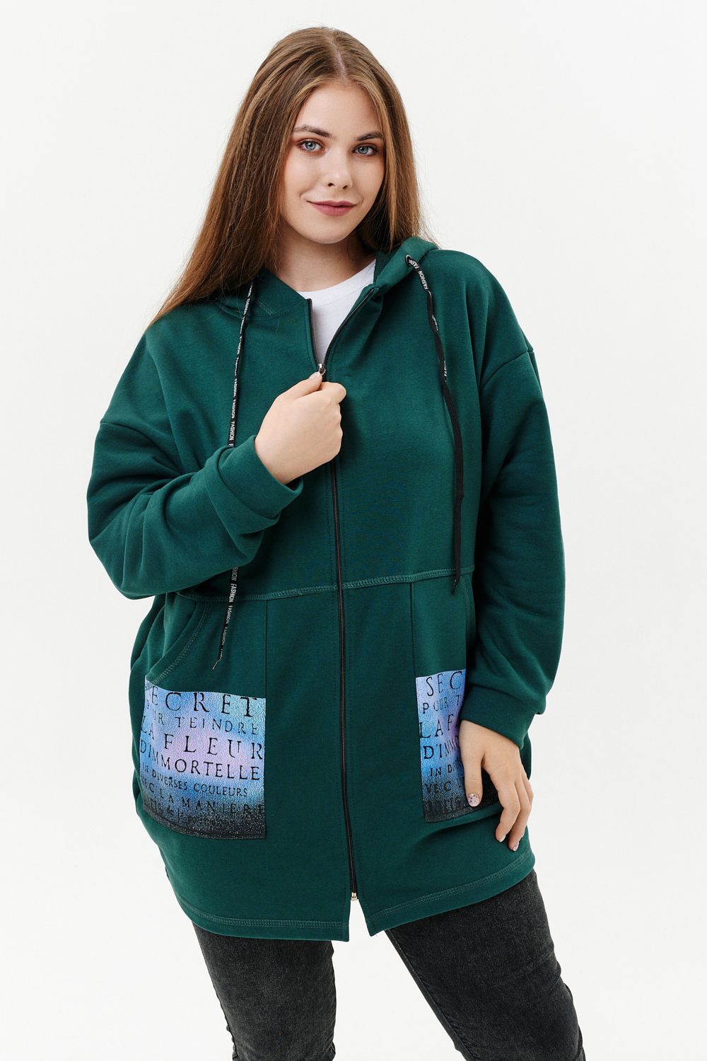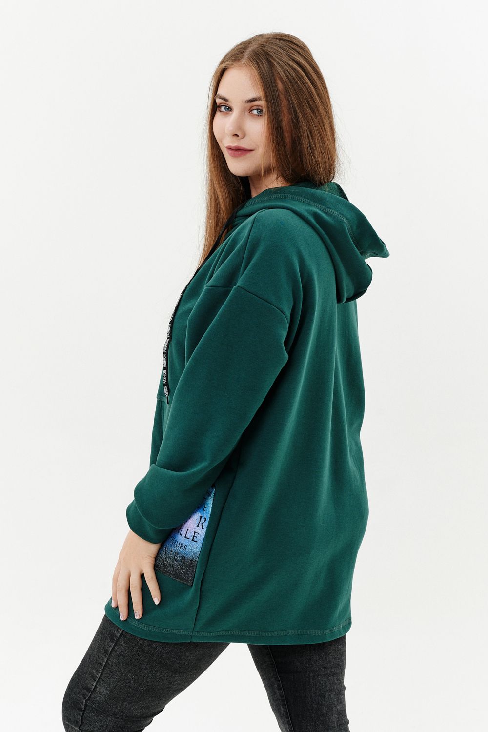Толстовка женская прямого силуэта до линии бедер, в нижней части заужена по бокам. Рукав втачной с заниженной линией плеча, с манжетой. Капюшон с люверсами и декоративными шнурками с надписью. Застежка на тесьму-молнию. В нижней части полочки два накладных кармана со стильным принтом. Материал - футер 3-х нитка петля.