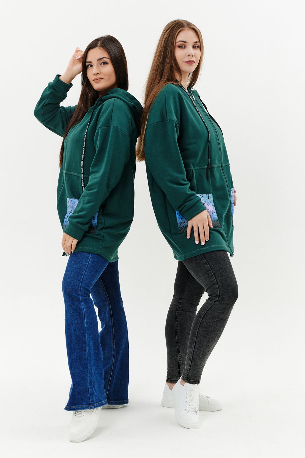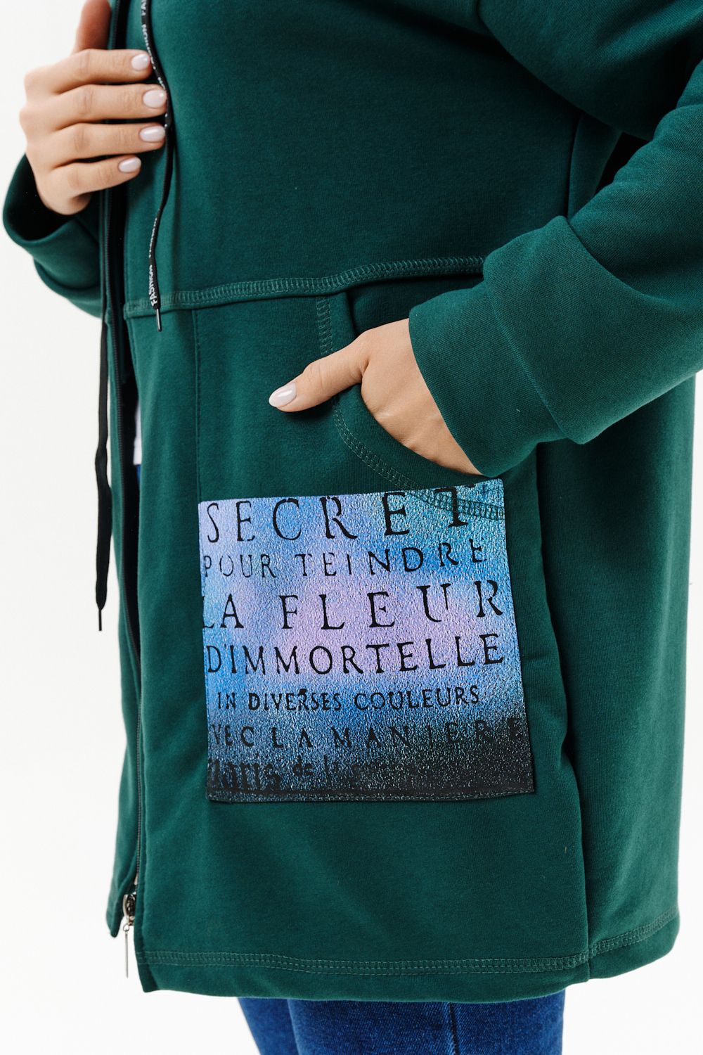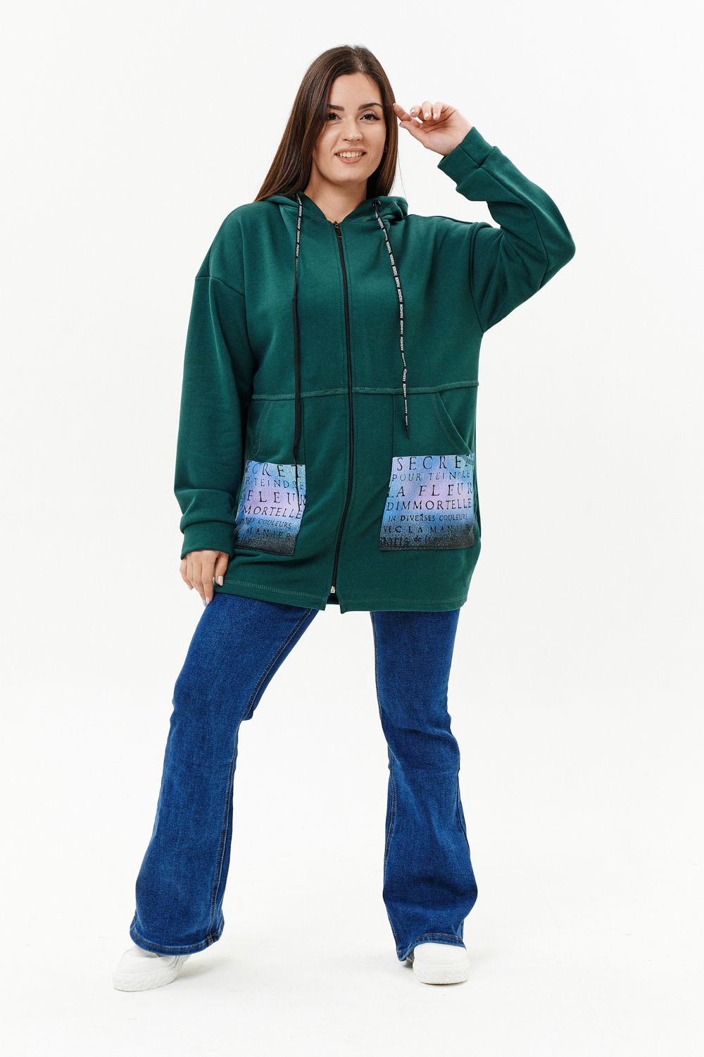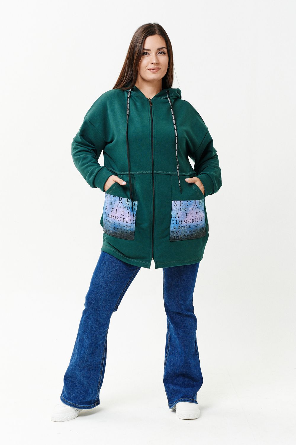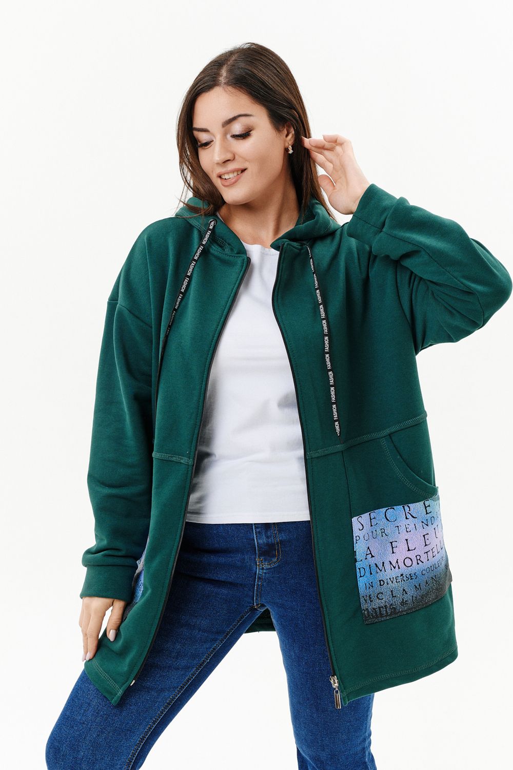 Толстовка женская прямого силуэта до линии бедер, в нижней части заужена по бокам. Рукав втачной с заниженной линией плеча, с манжетой. Капюшон с люверсами и декоративными шнурками с надписью. Застежка на тесьму-молнию. В нижней части полочки два накладных кармана со стильным принтом. Материал - футер 3-х нитка петля.