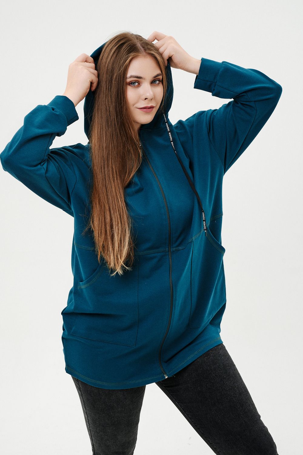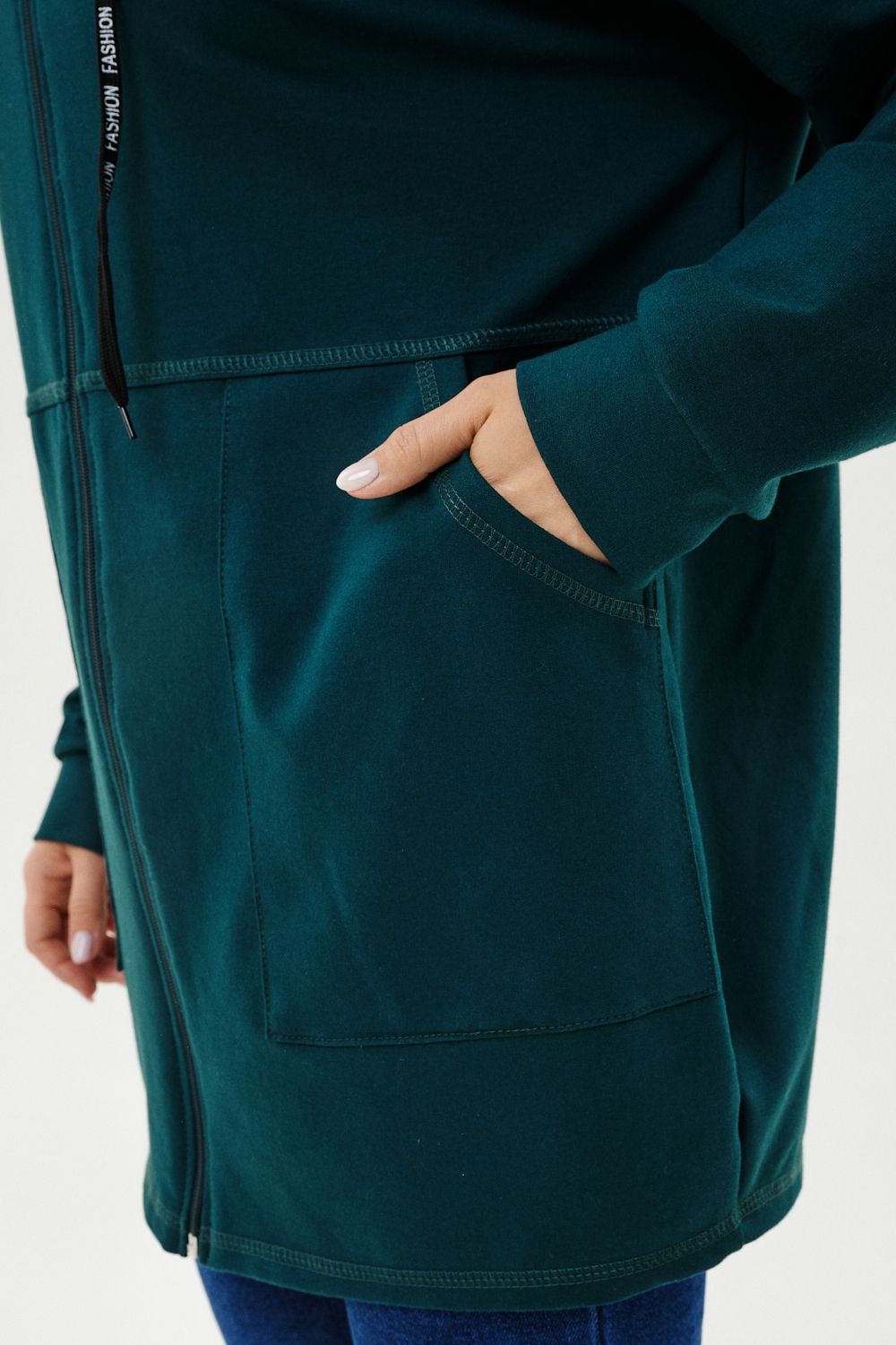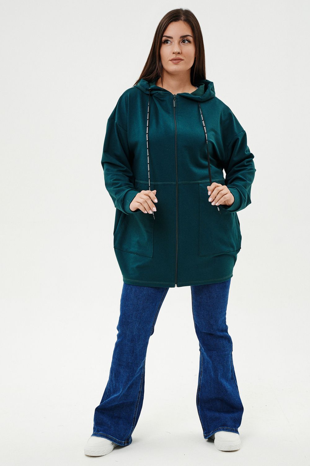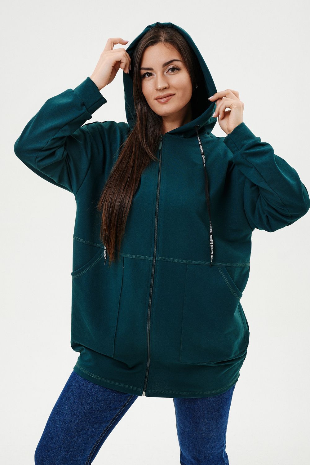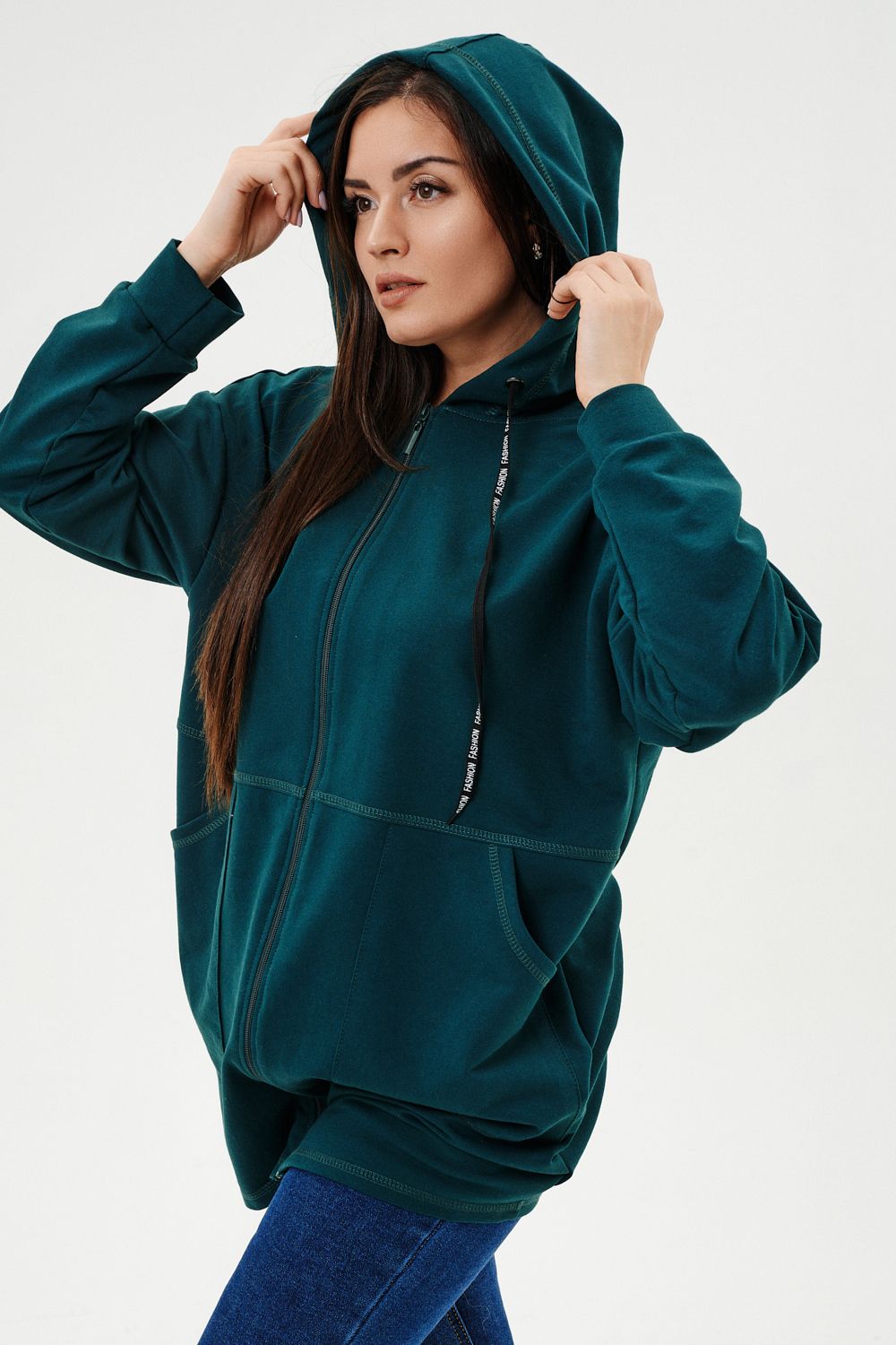 Толстовка женская прямого силуэта до линии бедер, в нижней части заужена по бокам. Рукав втачной с заниженной линией плеча, с манжетой. Капюшон с люверсами и декоративными шнурками. Застежка на тесьму-молнию. В нижней части полочки два накладных кармана. Цвет изумруд в разных оттенках.