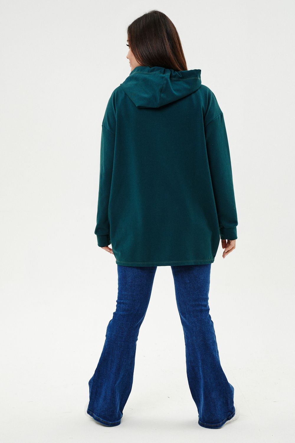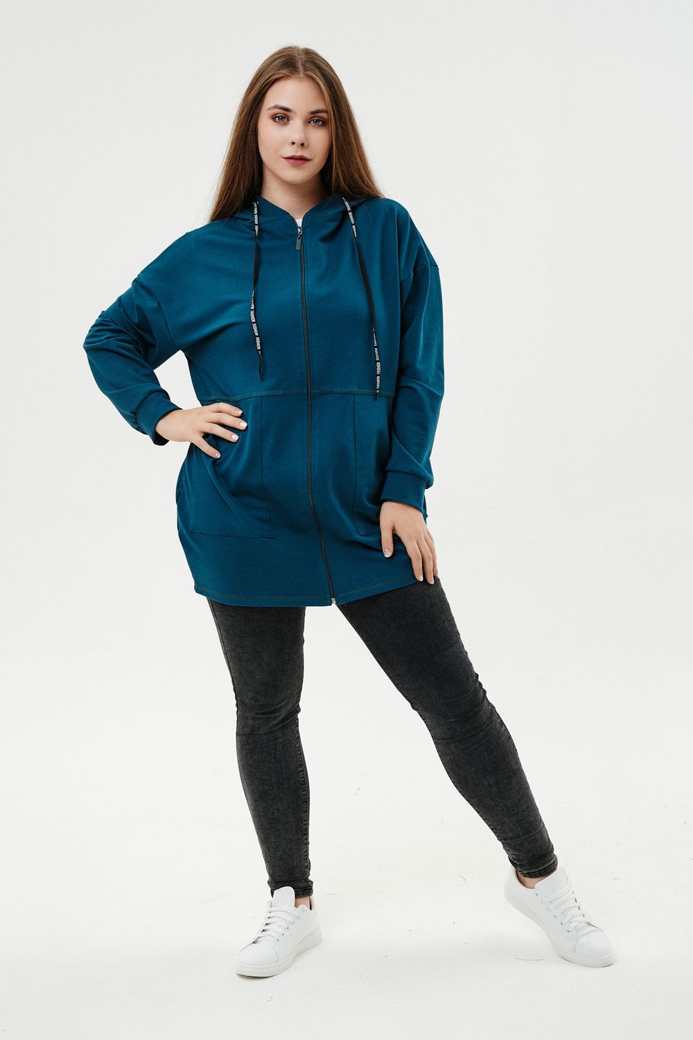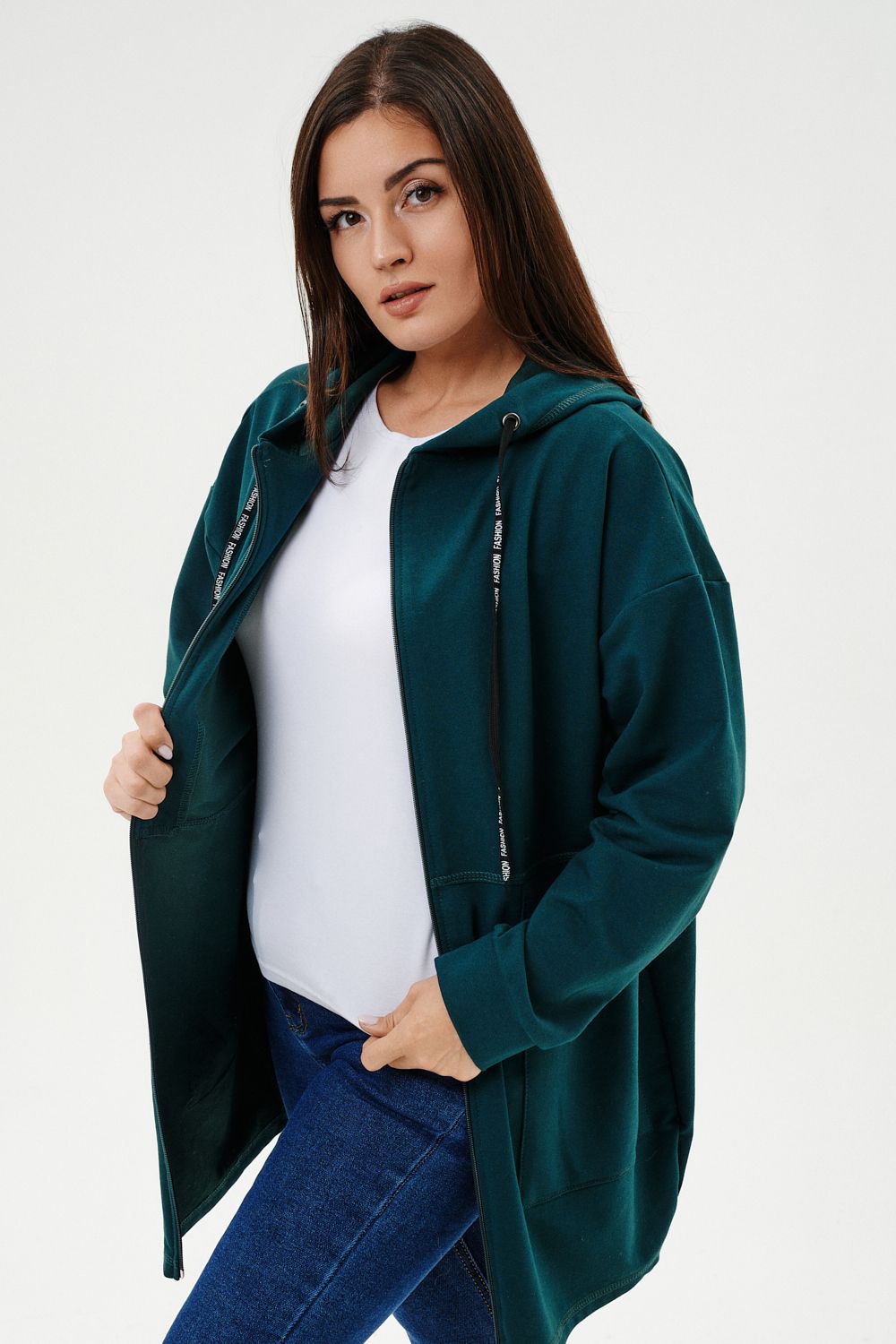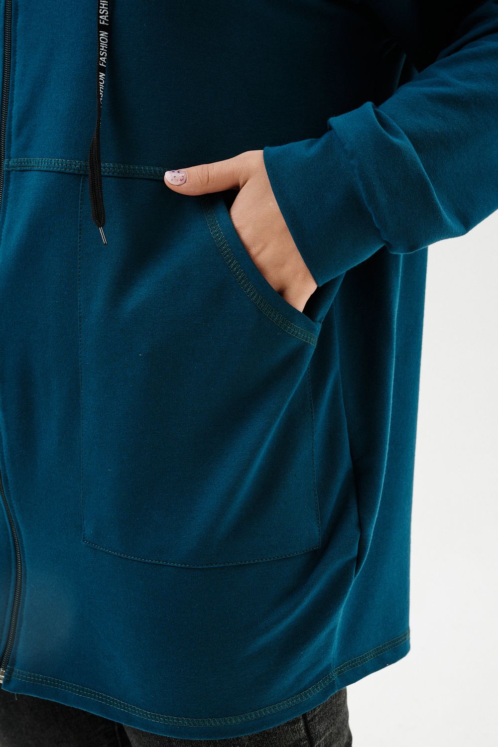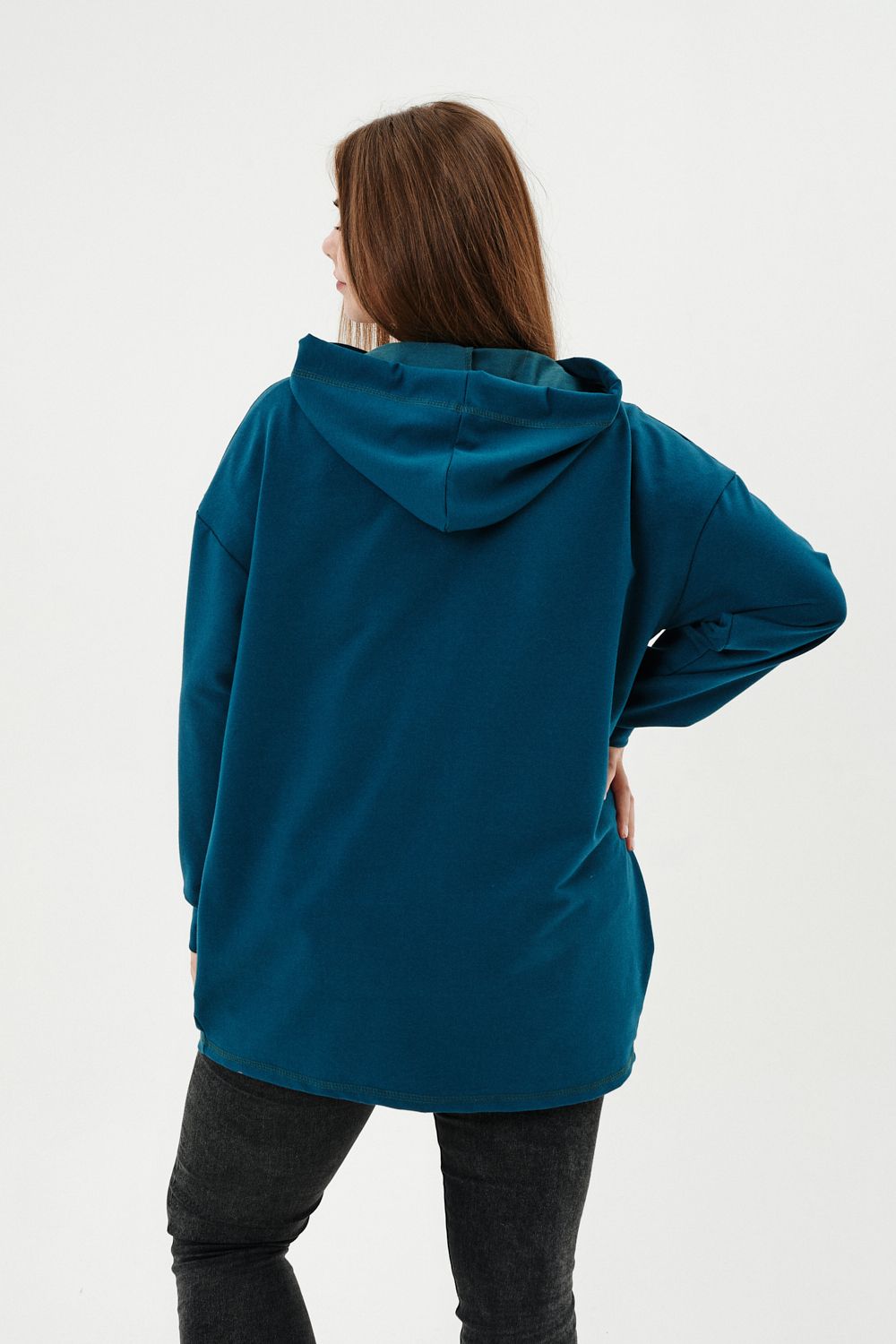 Толстовка женская прямого силуэта до линии бедер, в нижней части заужена по бокам. Рукав втачной с заниженной линией плеча, с манжетой. Капюшон с люверсами и декоративными шнурками. Застежка на тесьму-молнию. В нижней части полочки два накладных кармана. Цвет изумруд в разных оттенках.