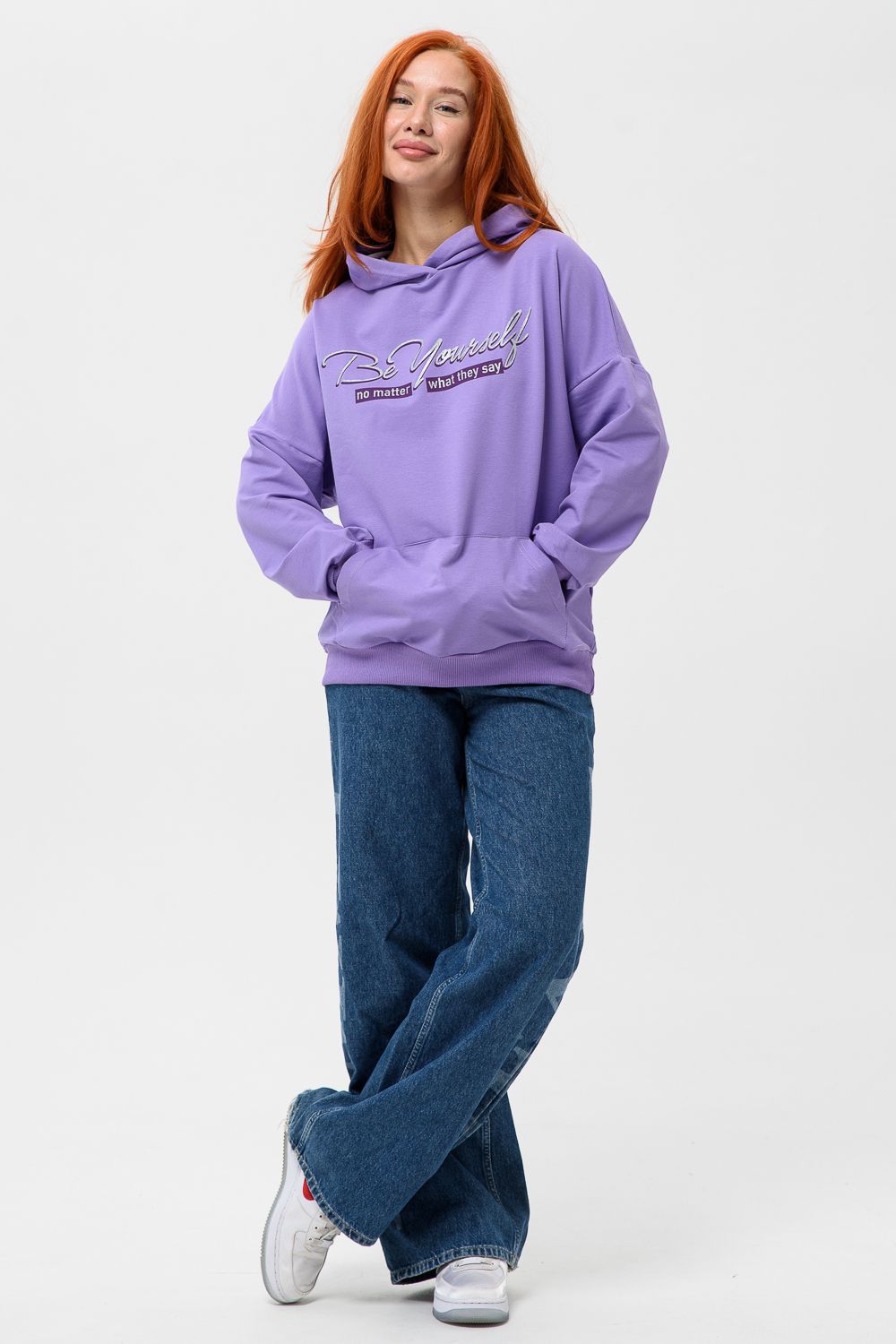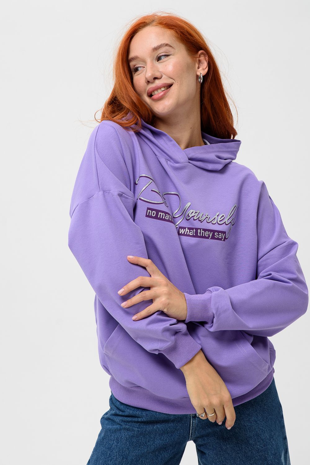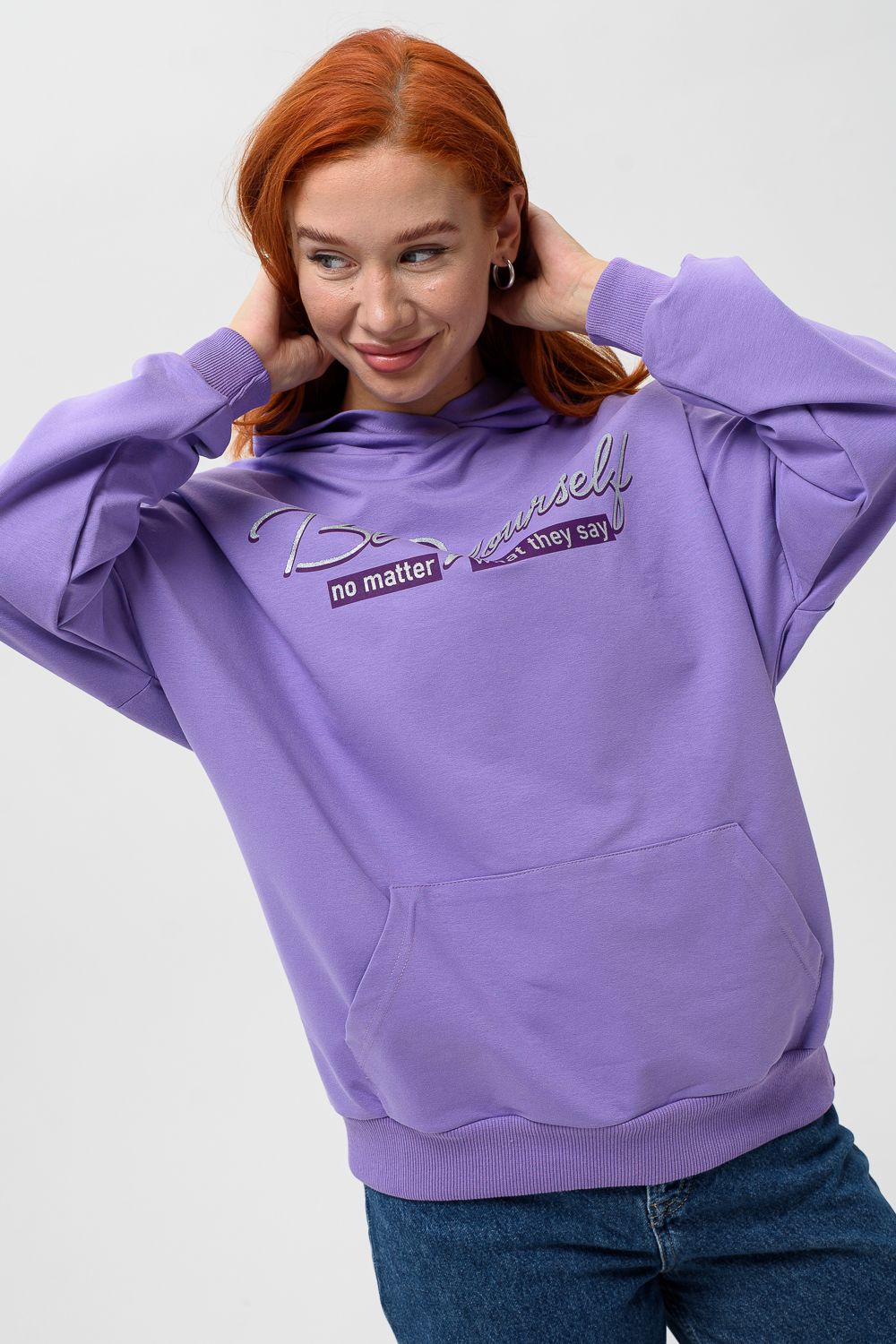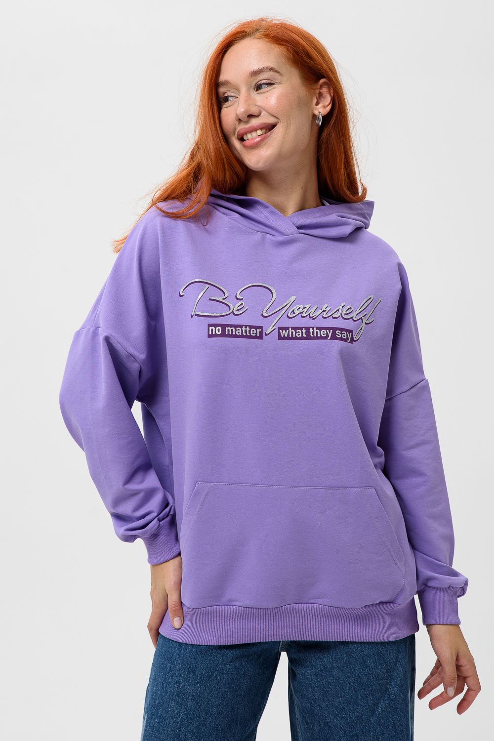 Фиолетовая мода. Слегка удлинённая толстовка в спортивном стиле с карманом кенгуру и капюшоном. Изделие выполнено из футера без начёса. Перевод текста:"Будь самим собой и не важно что о тебе говорят." Линия плеча спущена, рукава удлинённые. В измерениях длина рукава указана от шва втачивания капюшона. Манжеты и низ толстовки обработаны плотной резинкой кашкорсе.