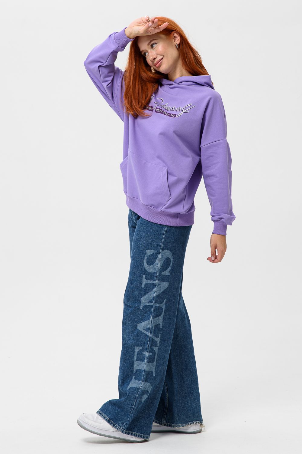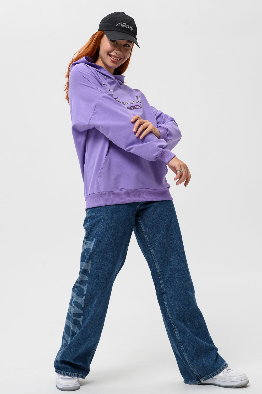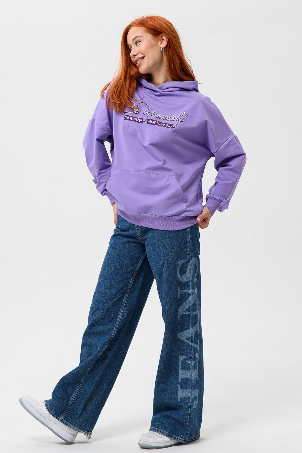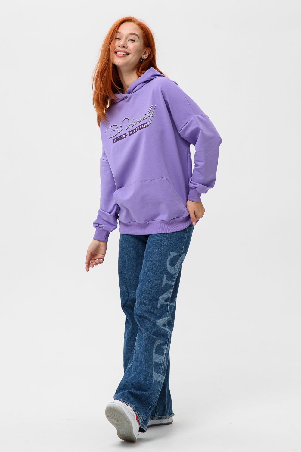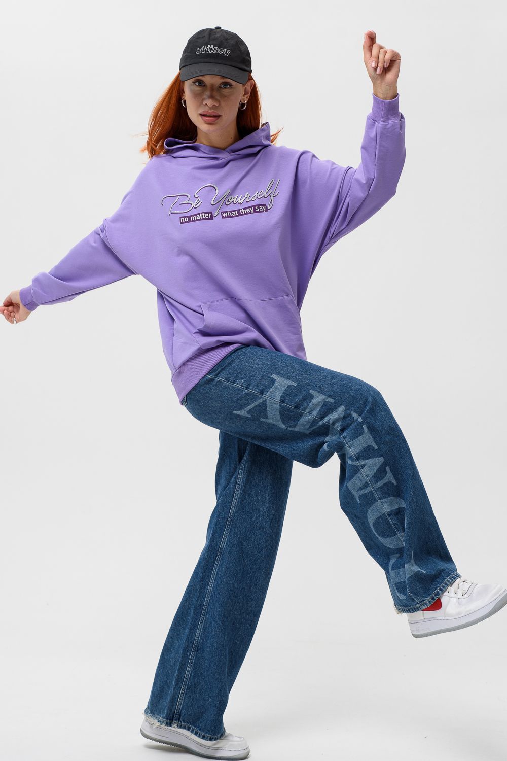 Фиолетовая мода. Слегка удлинённая толстовка в спортивном стиле с карманом кенгуру и капюшоном. Изделие выполнено из футера без начёса. Перевод текста:"Будь самим собой и не важно что о тебе говорят." Линия плеча спущена, рукава удлинённые. В измерениях длина рукава указана от шва втачивания капюшона. Манжеты и низ толстовки обработаны плотной резинкой кашкорсе.
