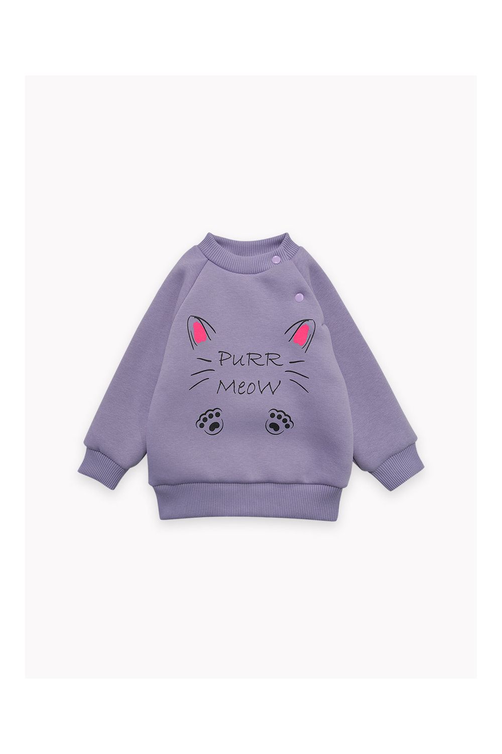 Толстовка "Cat" для девочки, предназначена для носки в прохладных помещениях и прогулки на улице, выполнена из мягкого футера с начёсом. Толстовка на эластичном поясе, рукава покроя реглан на манжетах, застёжка по шву рукава-реглан на клёпки. Принт, нанесённый методом шелкографии на ткани.