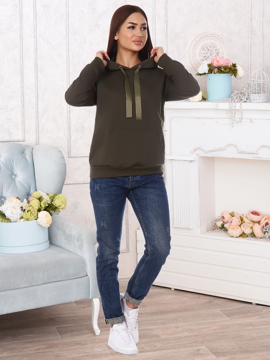 Толстовка женская из набивного футера с двойным капюшоном, длинным рукавом. На детали переда накладной карман-кенгуру. Манжеты и пояс из кашкорсе. В капюшоне декоративная лента.