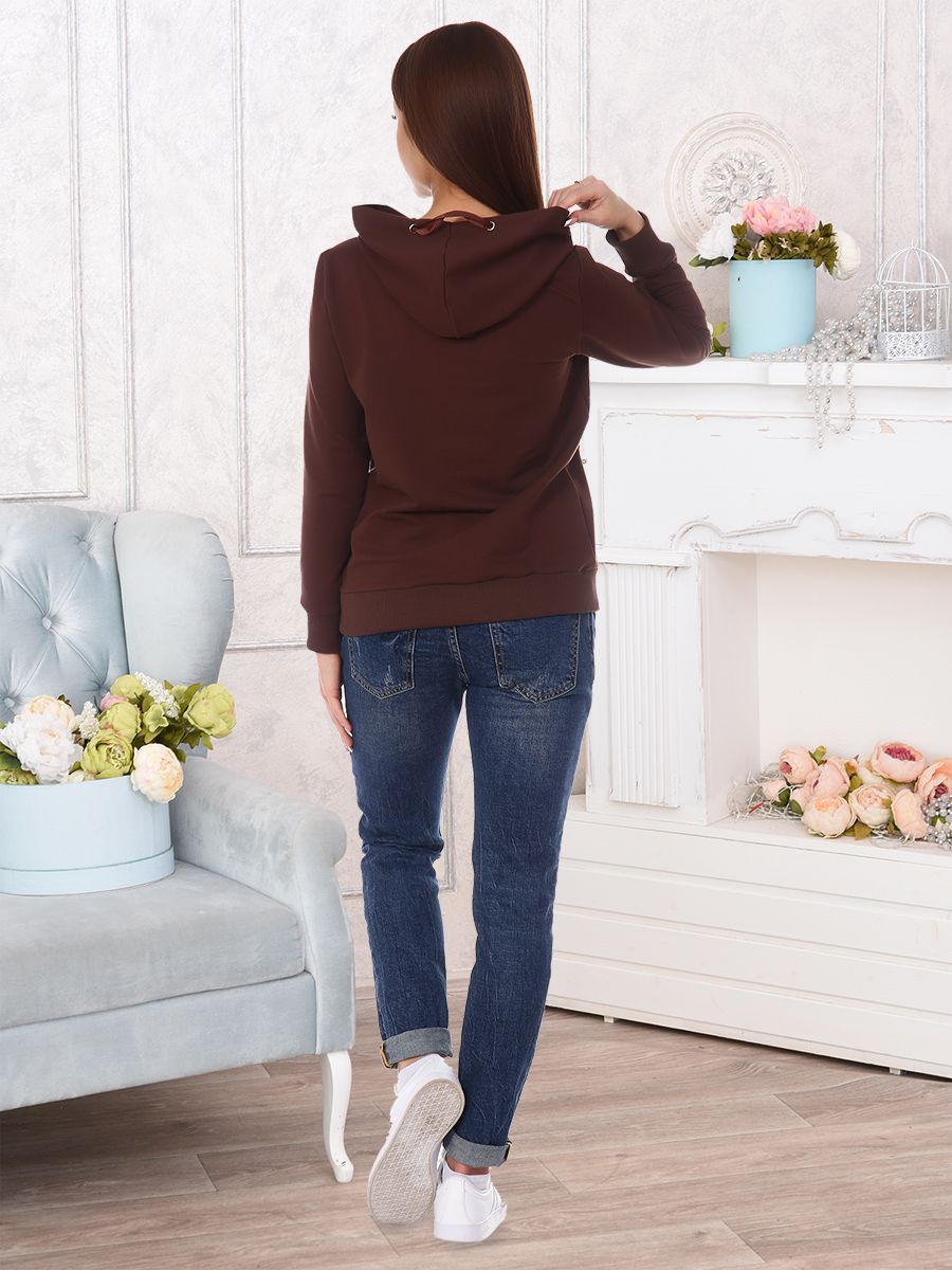 Толстовка женская из набивного футера с двойным капюшоном, длинным рукавом. На детали переда накладной карман-кенгуру. Манжеты и пояс из кашкорсе. В капюшоне декоративная лента.