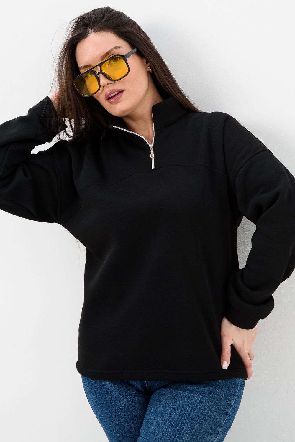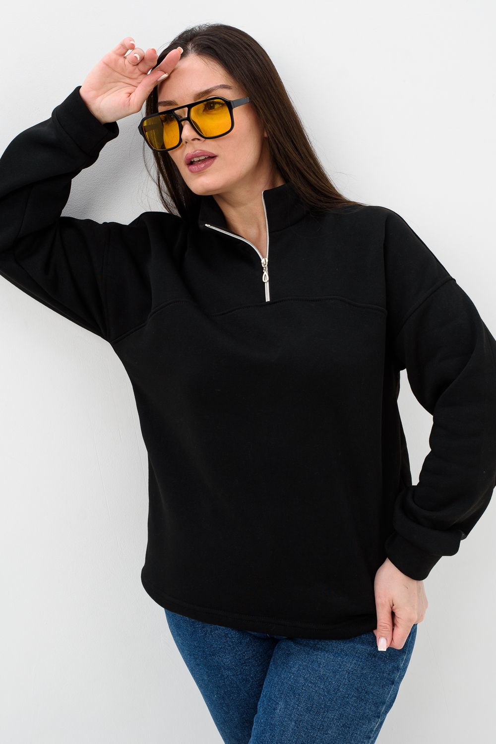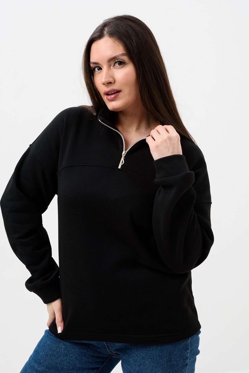 Женская толстовка из футера 2-х нитки. Длинный рукав на манжете обеспечивает тепло, прилегающий низ защищает от ветра. Особое внимание привлекает горло на молнии, которое не только добавляет функциональности, но и становится стильным акцентом в общем образе. Легко сочетается с различными элементами гардероба, создавая множество интересных образов. Толстовка - это практичный элемент вашего гардероба, который поможет вам чувствовать себя уверенно и комфортно в любое время года. (размер на модели 44-46)