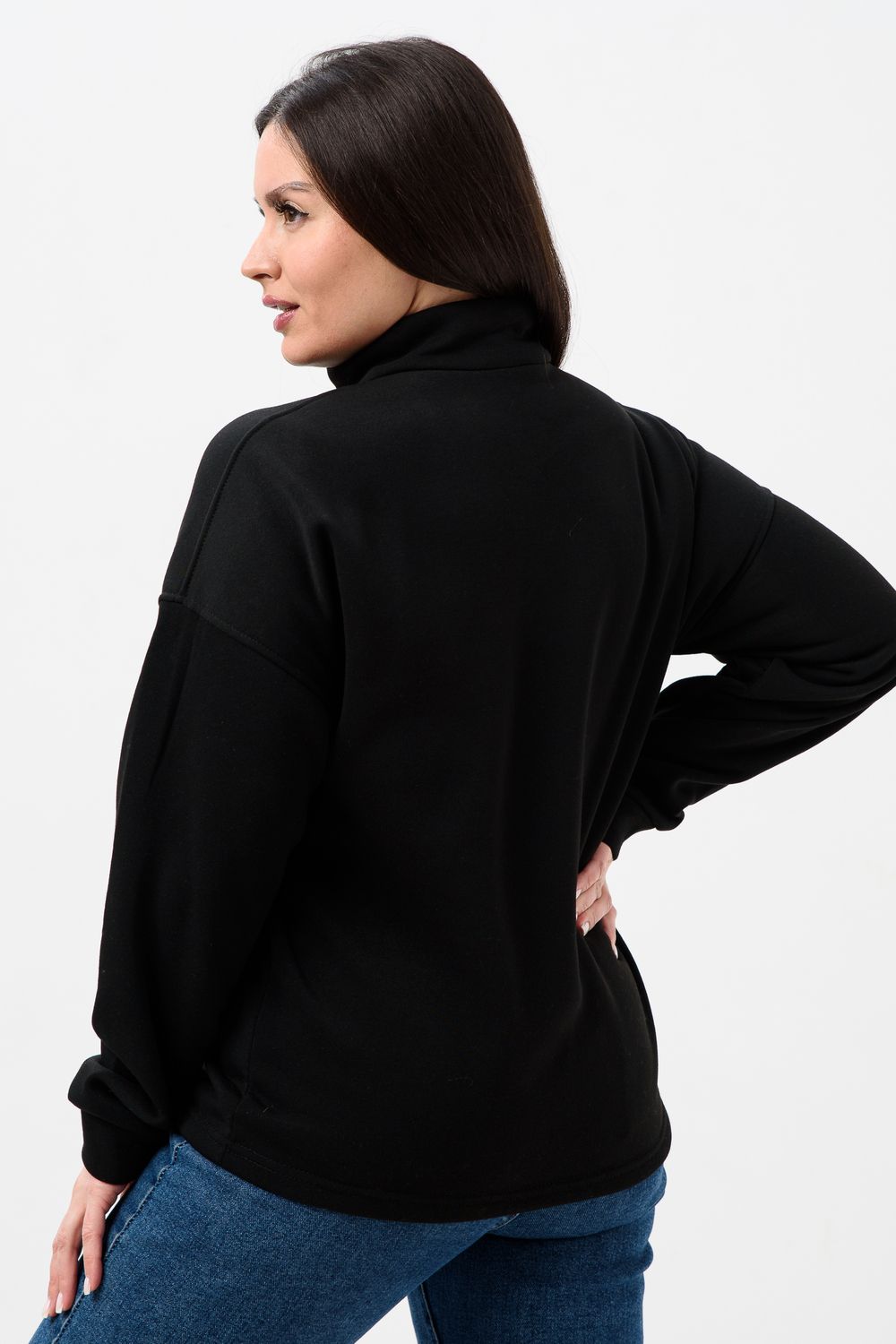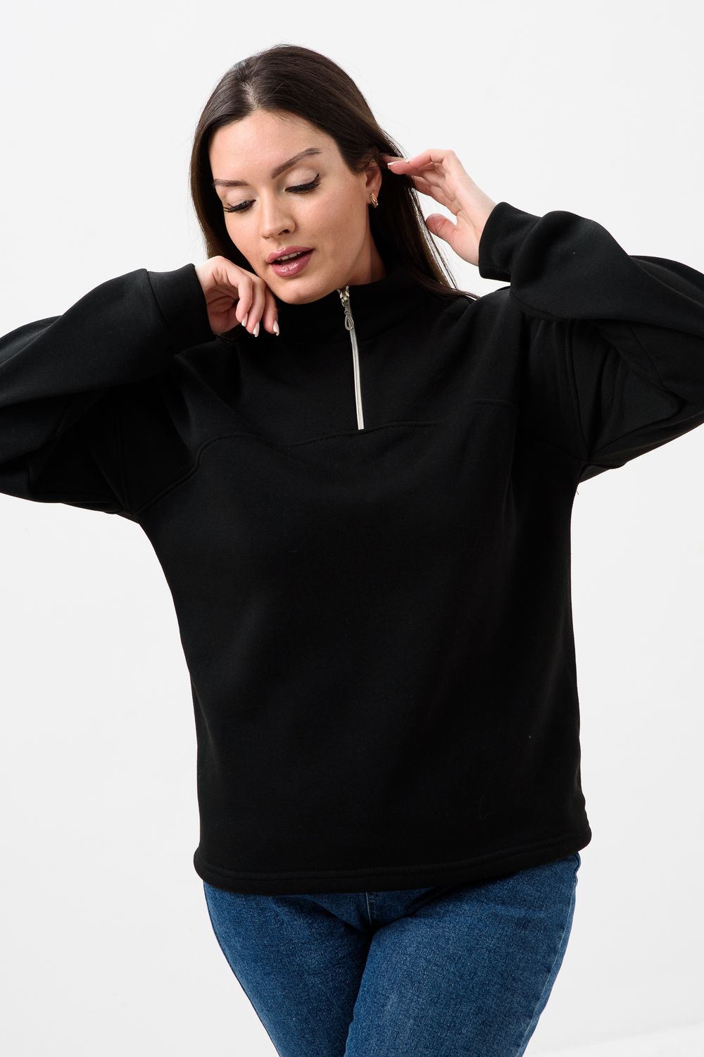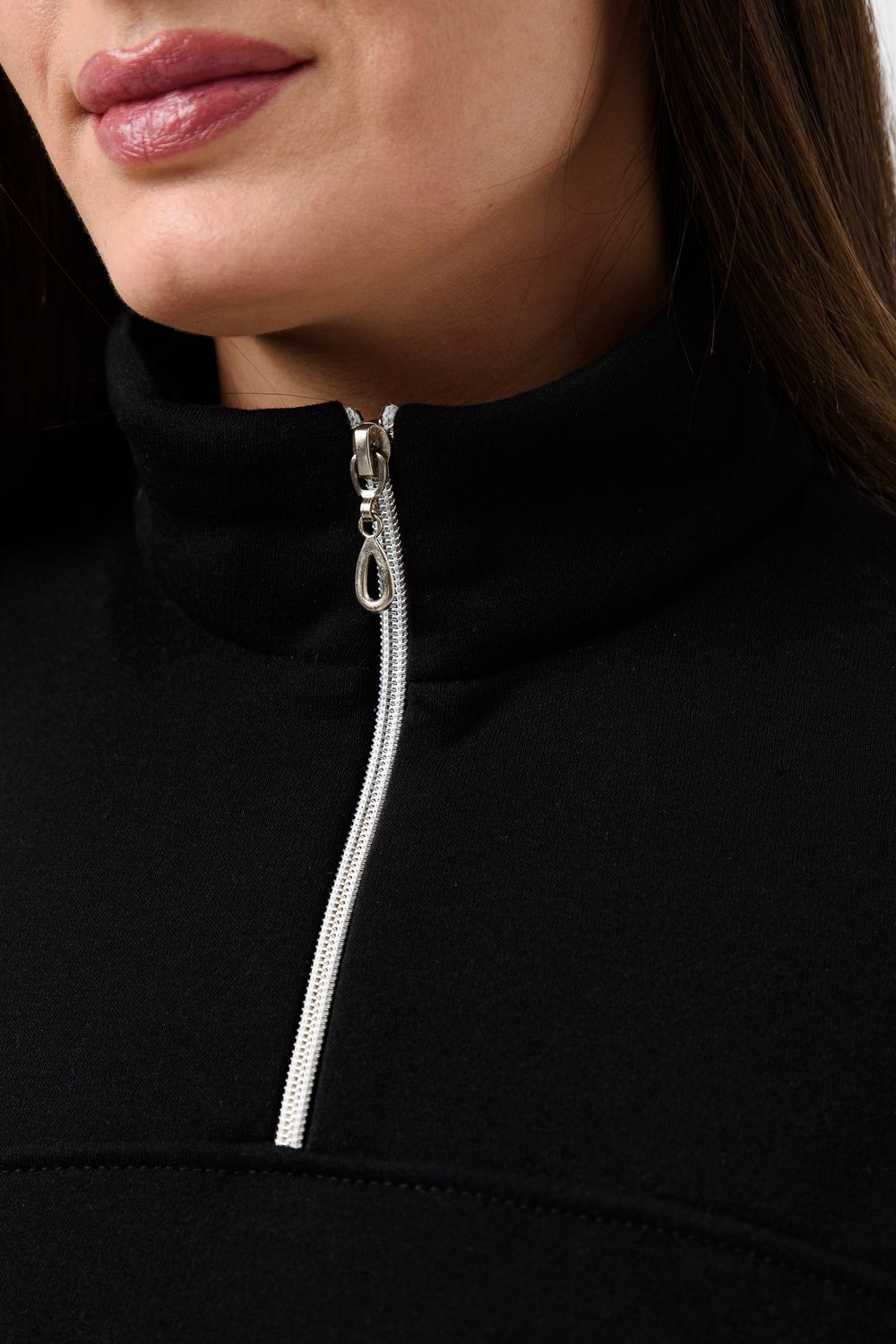 Женская толстовка из футера 2-х нитки. Длинный рукав на манжете обеспечивает тепло, прилегающий низ защищает от ветра. Особое внимание привлекает горло на молнии, которое не только добавляет функциональности, но и становится стильным акцентом в общем образе. Легко сочетается с различными элементами гардероба, создавая множество интересных образов. Толстовка - это практичный элемент вашего гардероба, который поможет вам чувствовать себя уверенно и комфортно в любое время года. (размер на модели 44-46)
