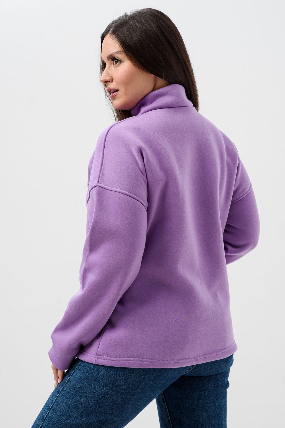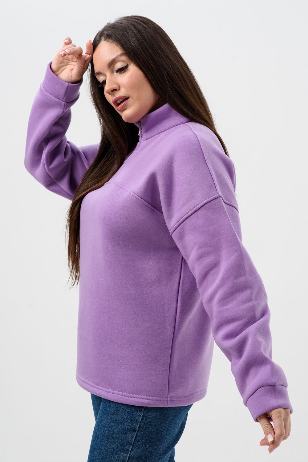 Женская толстовка из футера 2-х нитки. Длинный рукав на манжете обеспечивает тепло, прилегающий низ защищает от ветра. Особое внимание привлекает горло на молнии, которое не только добавляет функциональности, но и становится стильным акцентом в общем образе. Легко сочетается с различными элементами гардероба, создавая множество интересных образов. Толстовка - это практичный элемент вашего гардероба, который поможет вам чувствовать себя уверенно и комфортно в любое время года. (размер на модели 44-46)