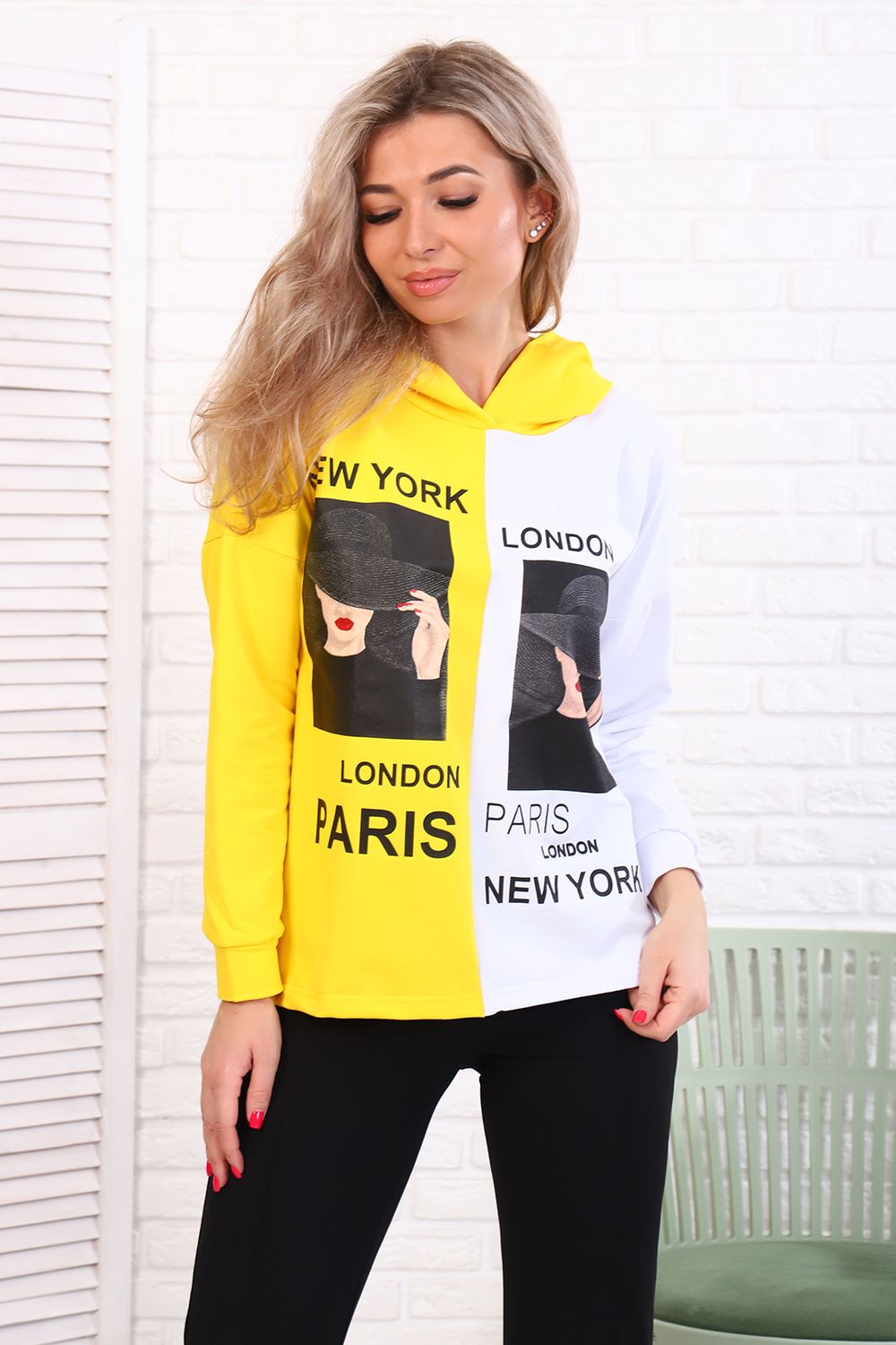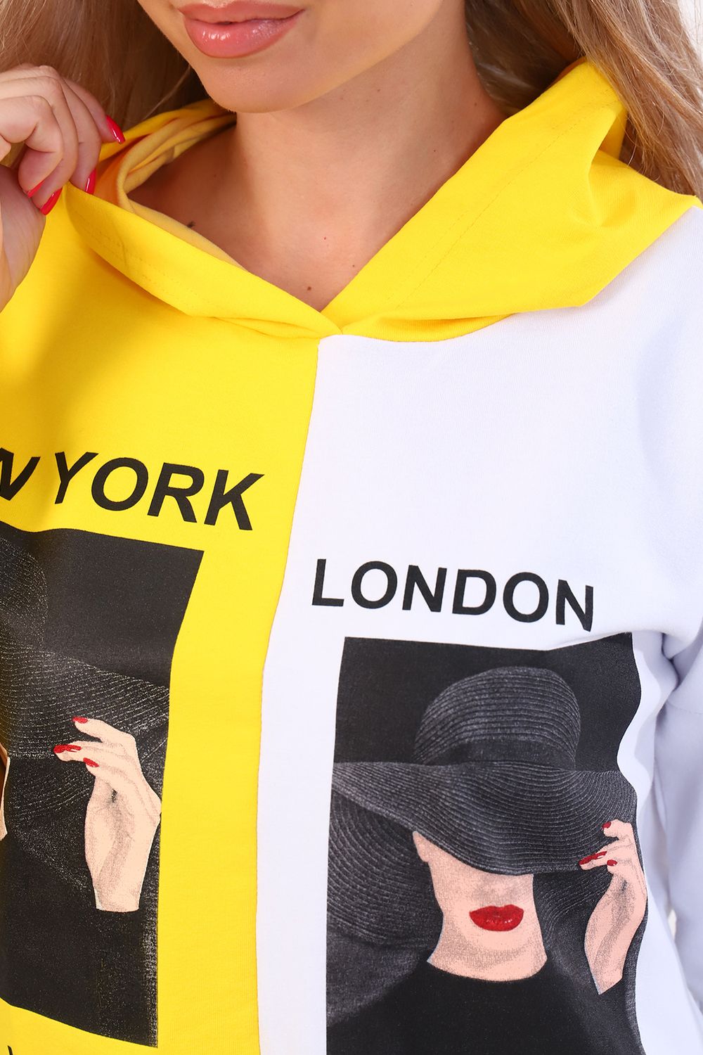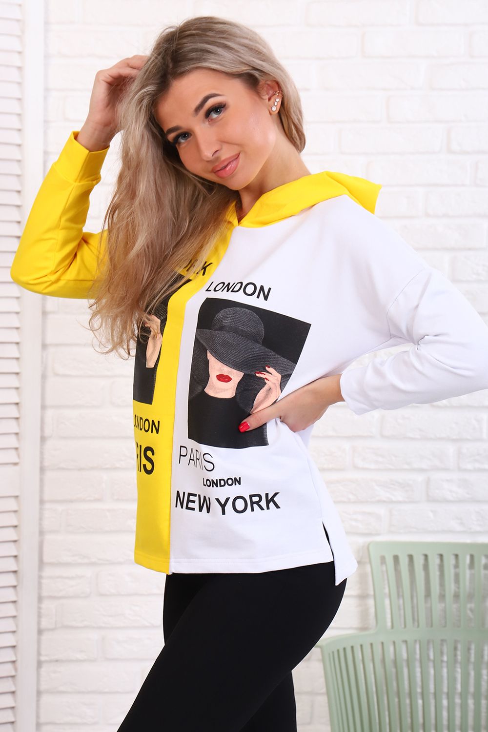 Толстовка женская со спущенным плечом, втачным длинным рукавом на манжете, с капюшоном. На детали переда печать.