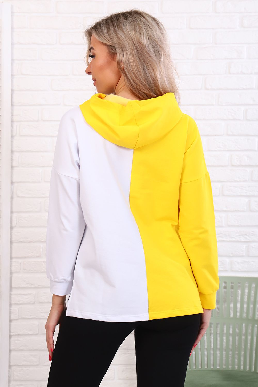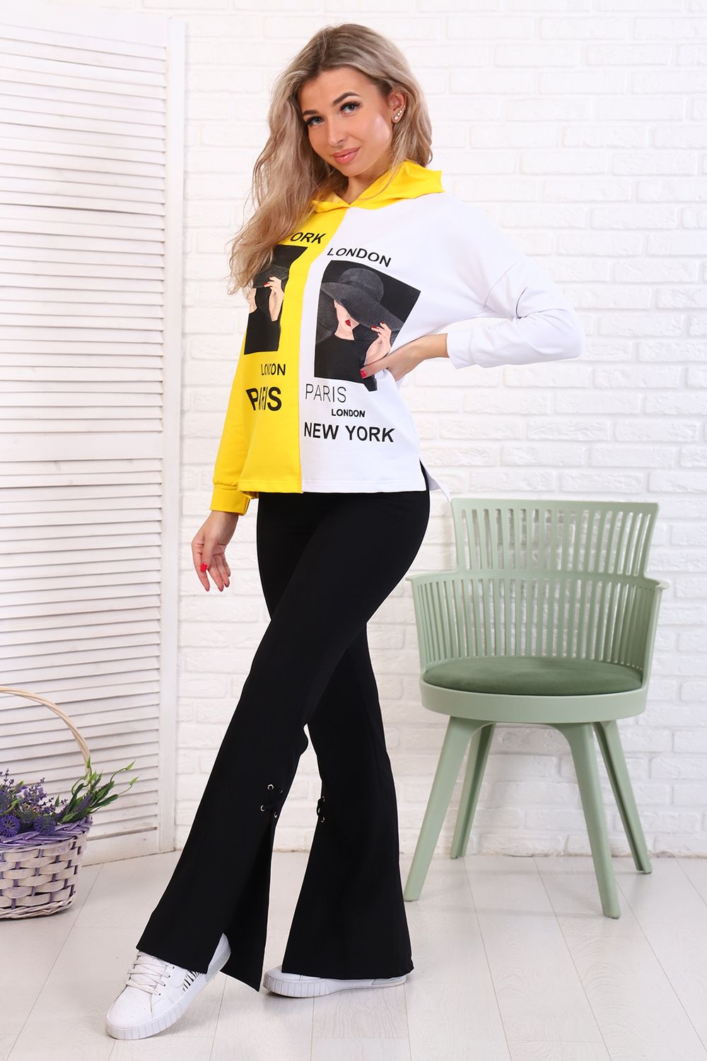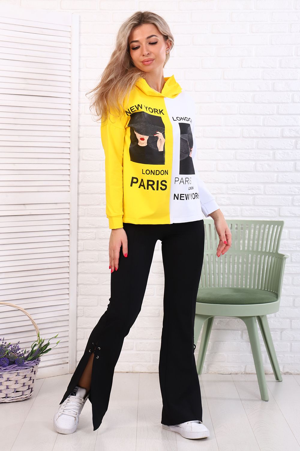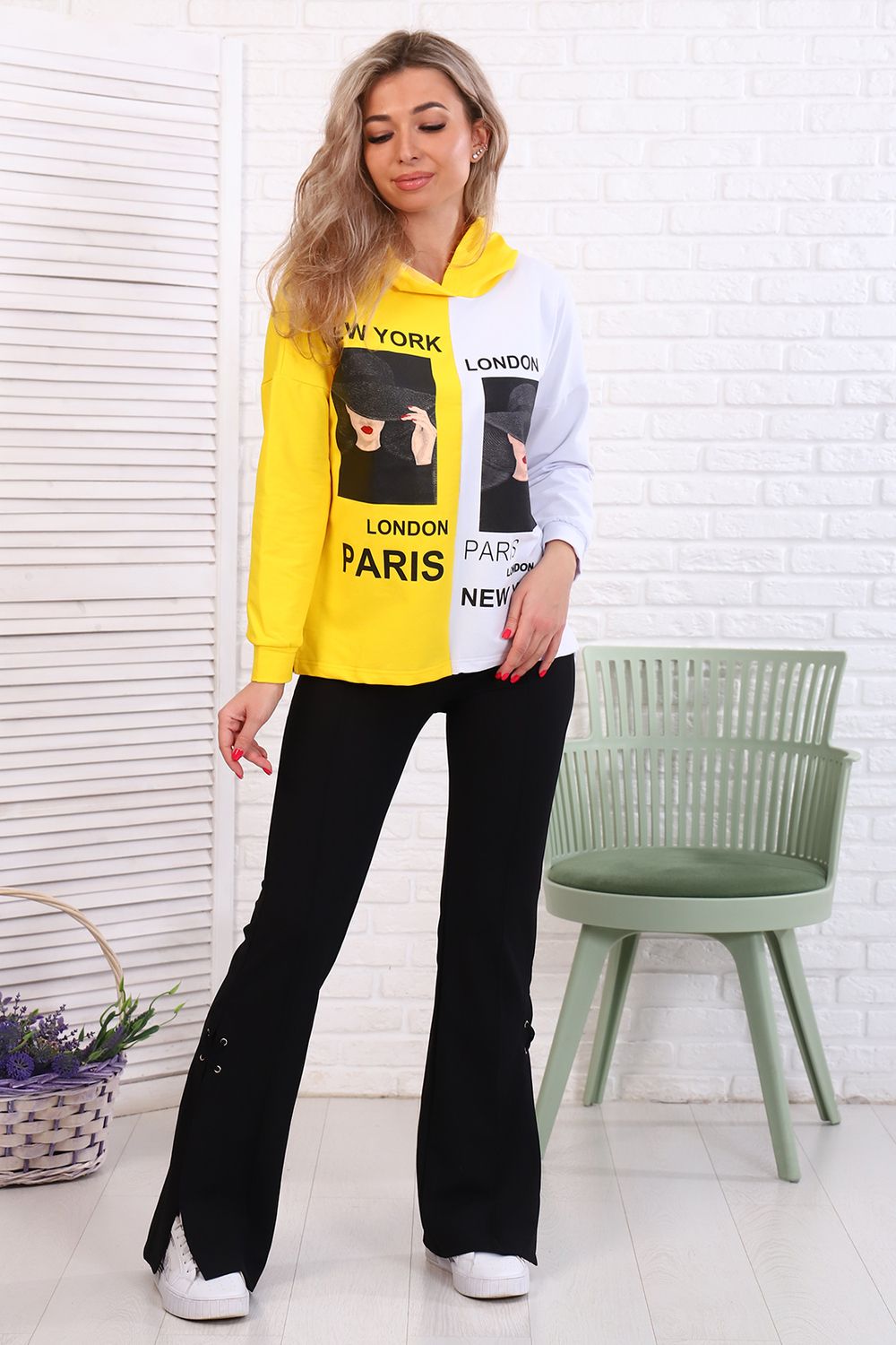 Толстовка женская со спущенным плечом, втачным длинным рукавом на манжете, с капюшоном. На детали переда печать.