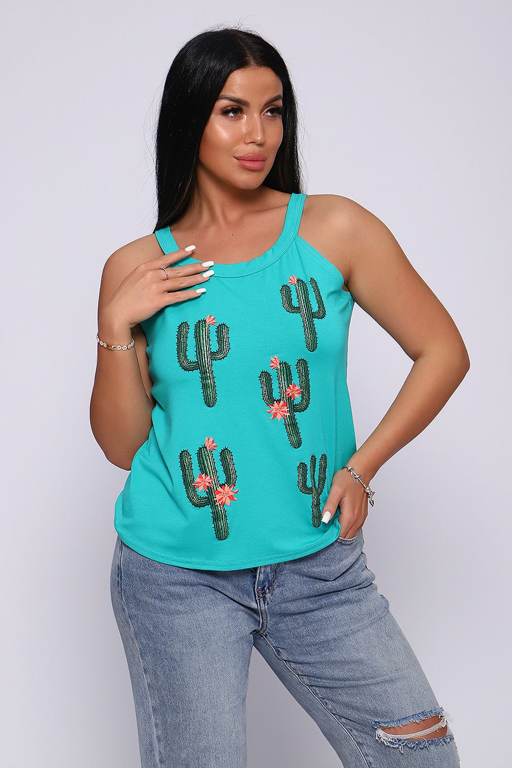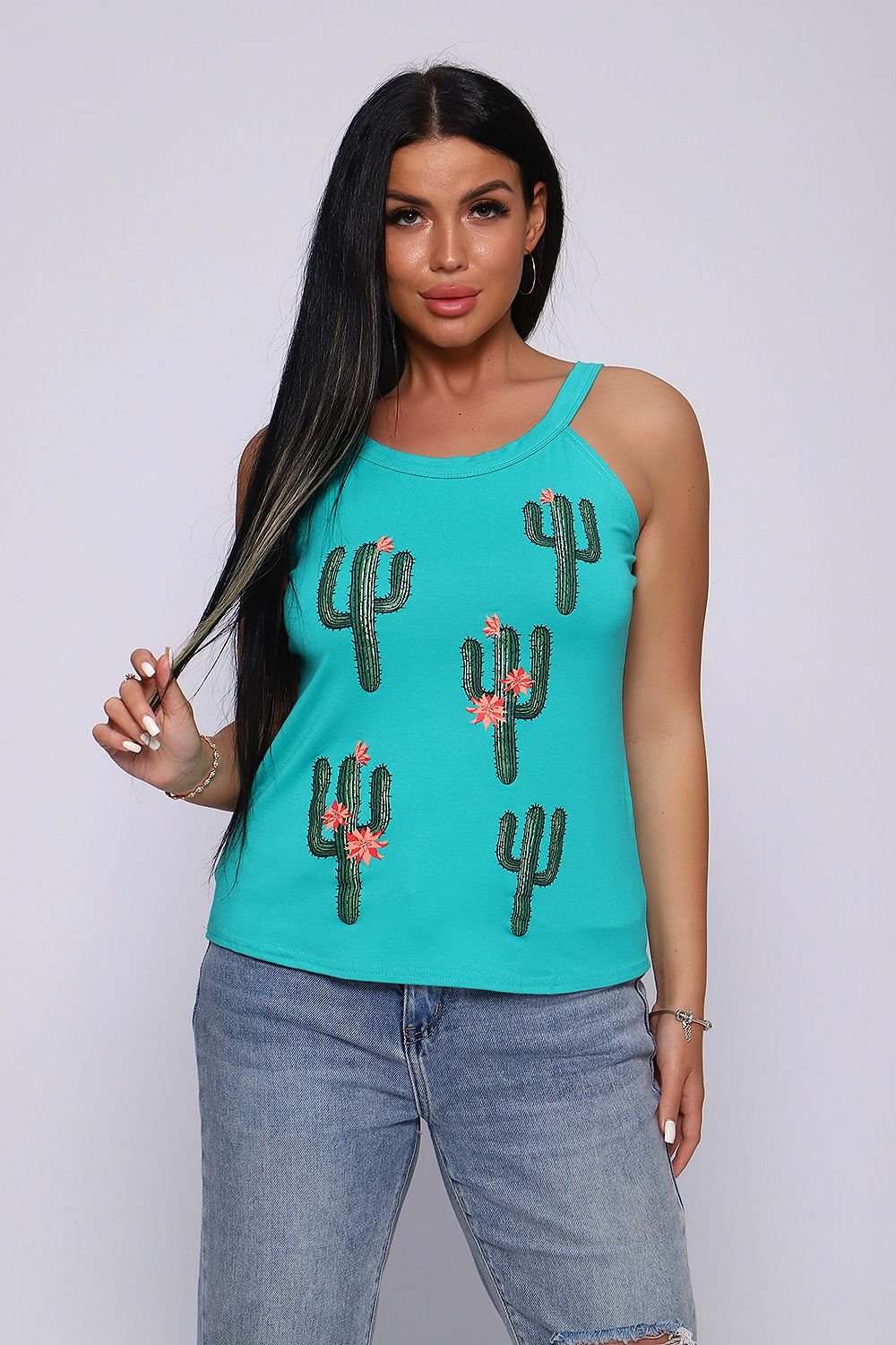 Топ женский с оригинальным принтом. Летний сезон дает возможность насладиться легким вариантом топа с широкими бретелями, выполненным из струящейся вискозы. Ткань- необыкновенно легкая, воздушная, приятная к телу, не сковывает движений, деликатно облегая фигуру. Цветовая гамма данной модели позволит соответствовать окружающей яркости природы, луговому раздолью, морским пляжам.