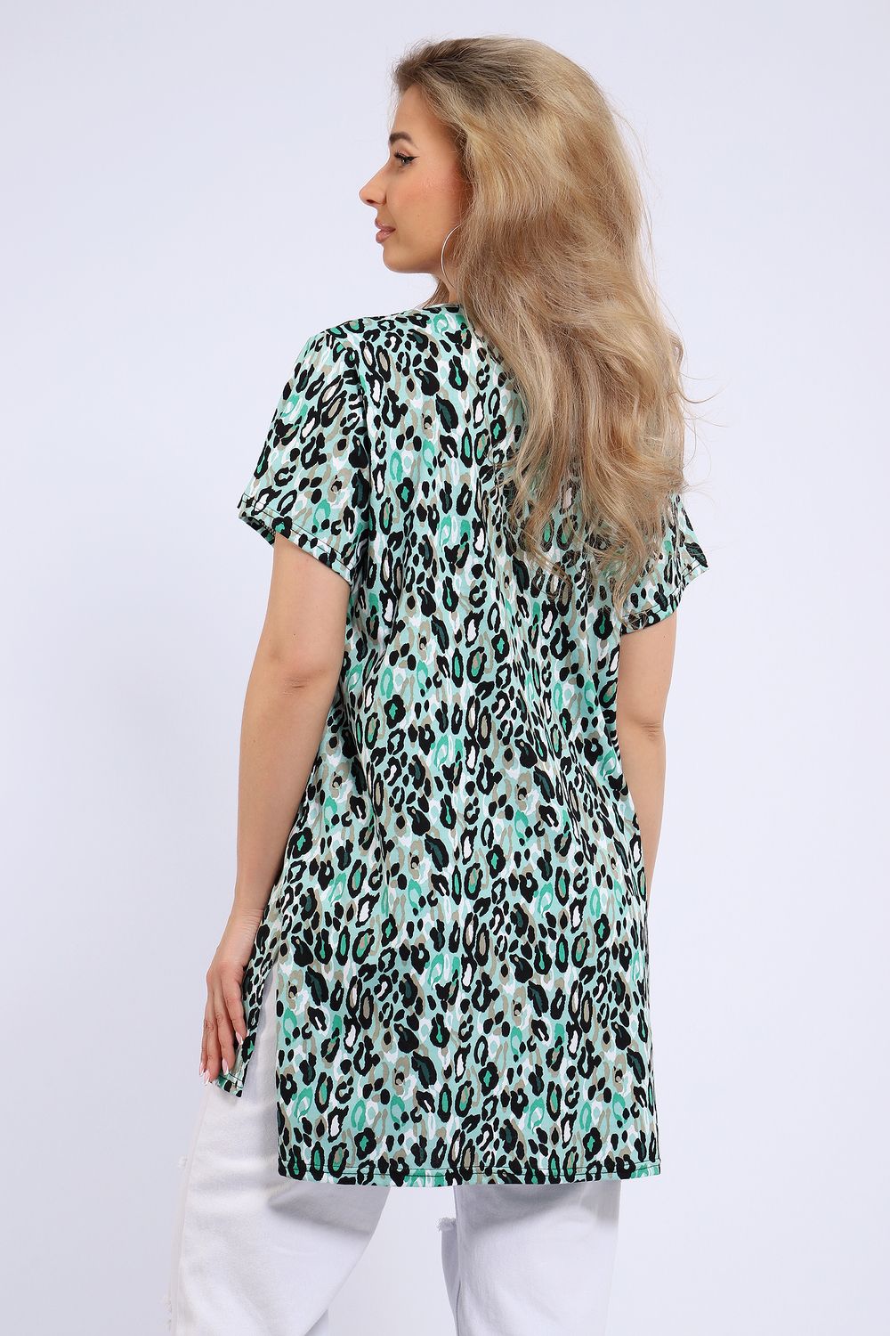 Туника женская свободного кроя выполнена из кулирки 100% хлопок оригинальной расцветки. Спинка удлиненная, по бокам большие разрезы, горловина обработана кантом, низ изделия и рукава подшиты. Туника идеально подойдет как для дома, так и для отдыха.