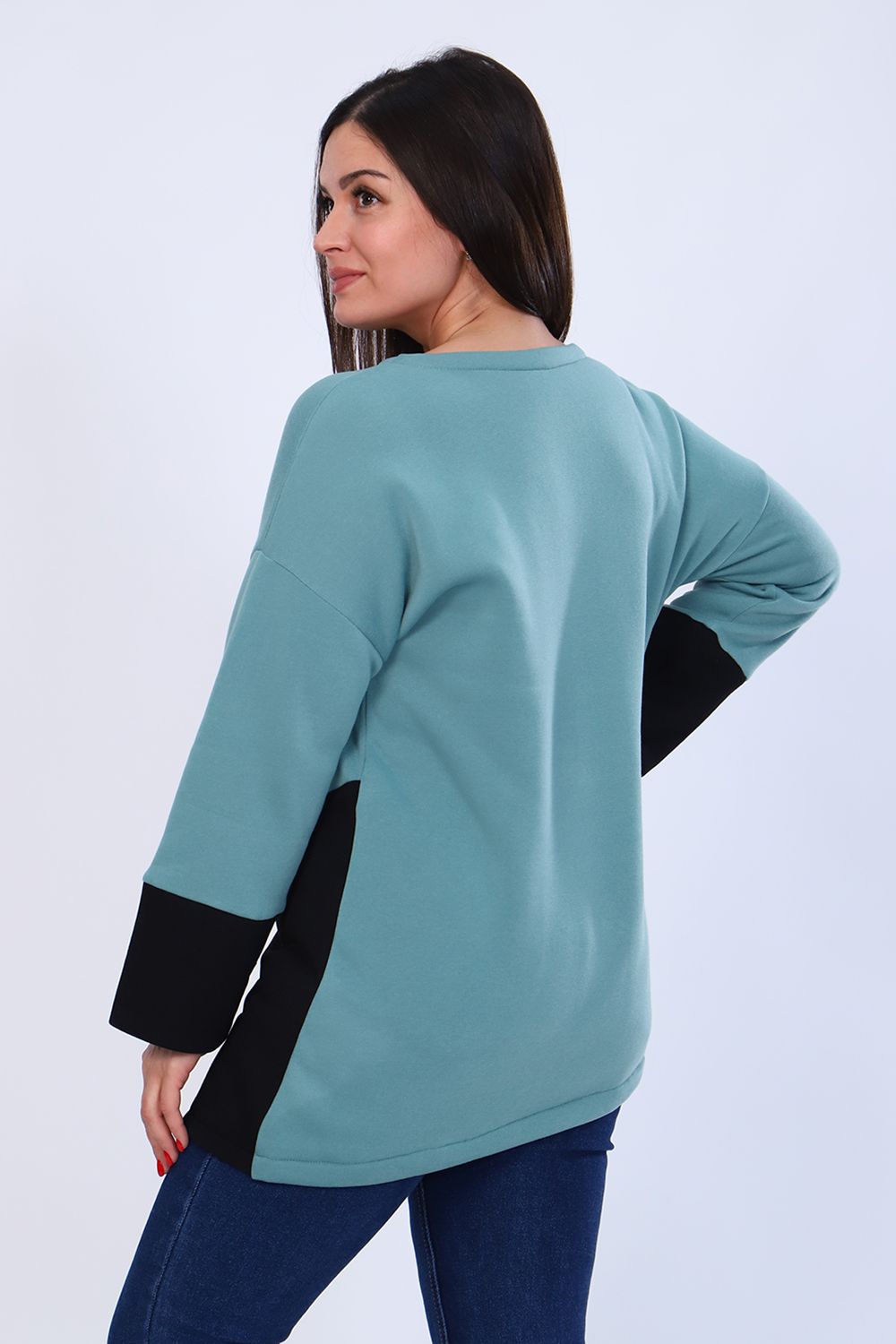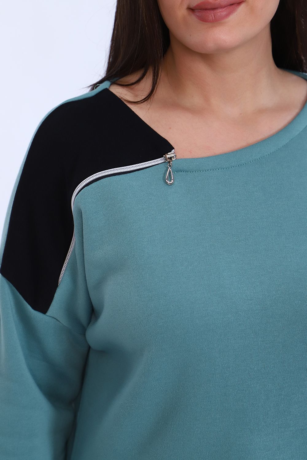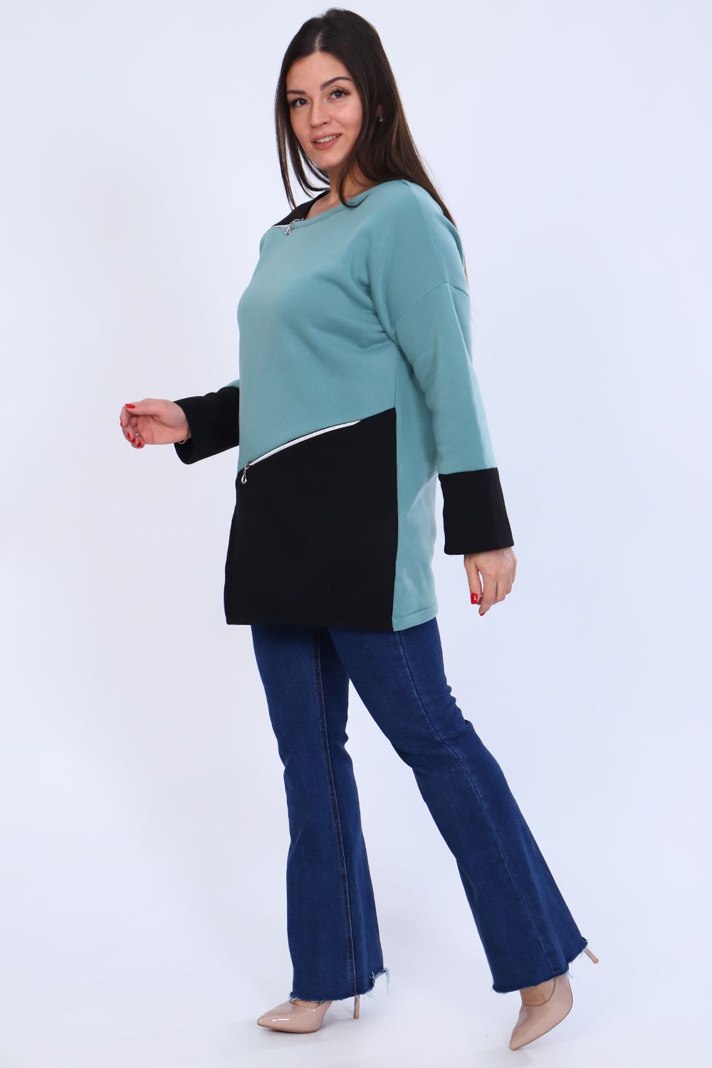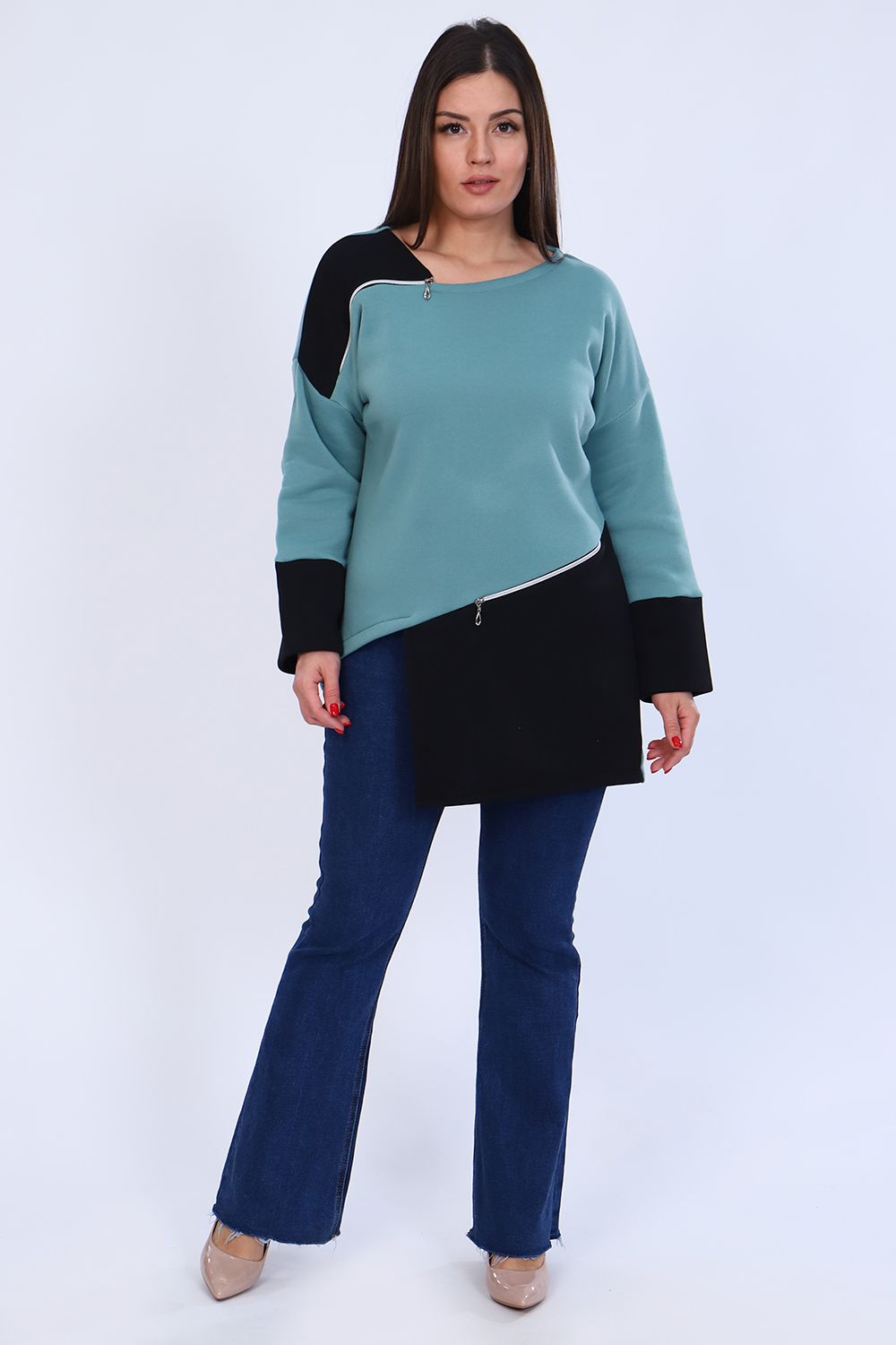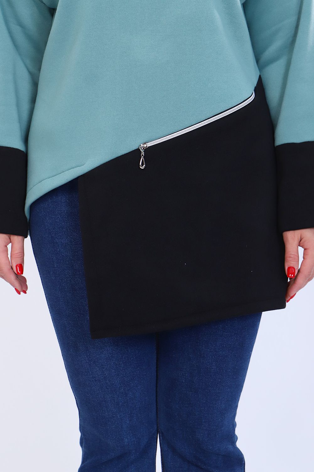 Туника женская, комбинированная, прямого силуэта, спущенный рукав 3/4 с широкими манжетами, длина рукава от шва. Горловина с обтачкой, справа декорирована втачной молнией. Фигурный v-образный низ декорирован вшивной молнией. Удобно и практично.
