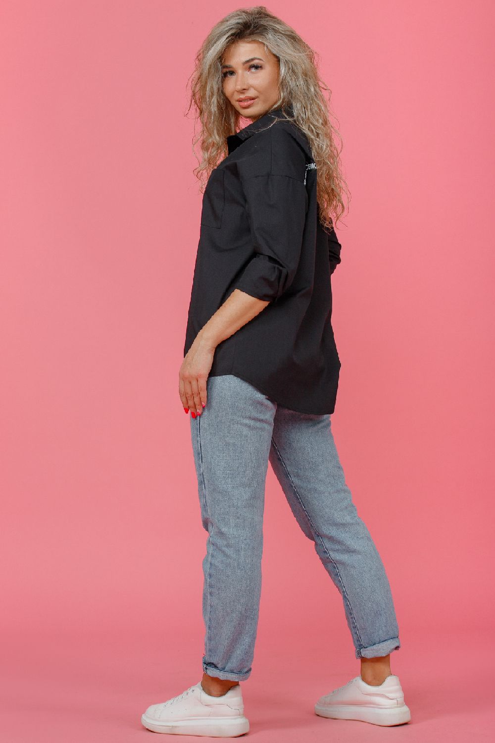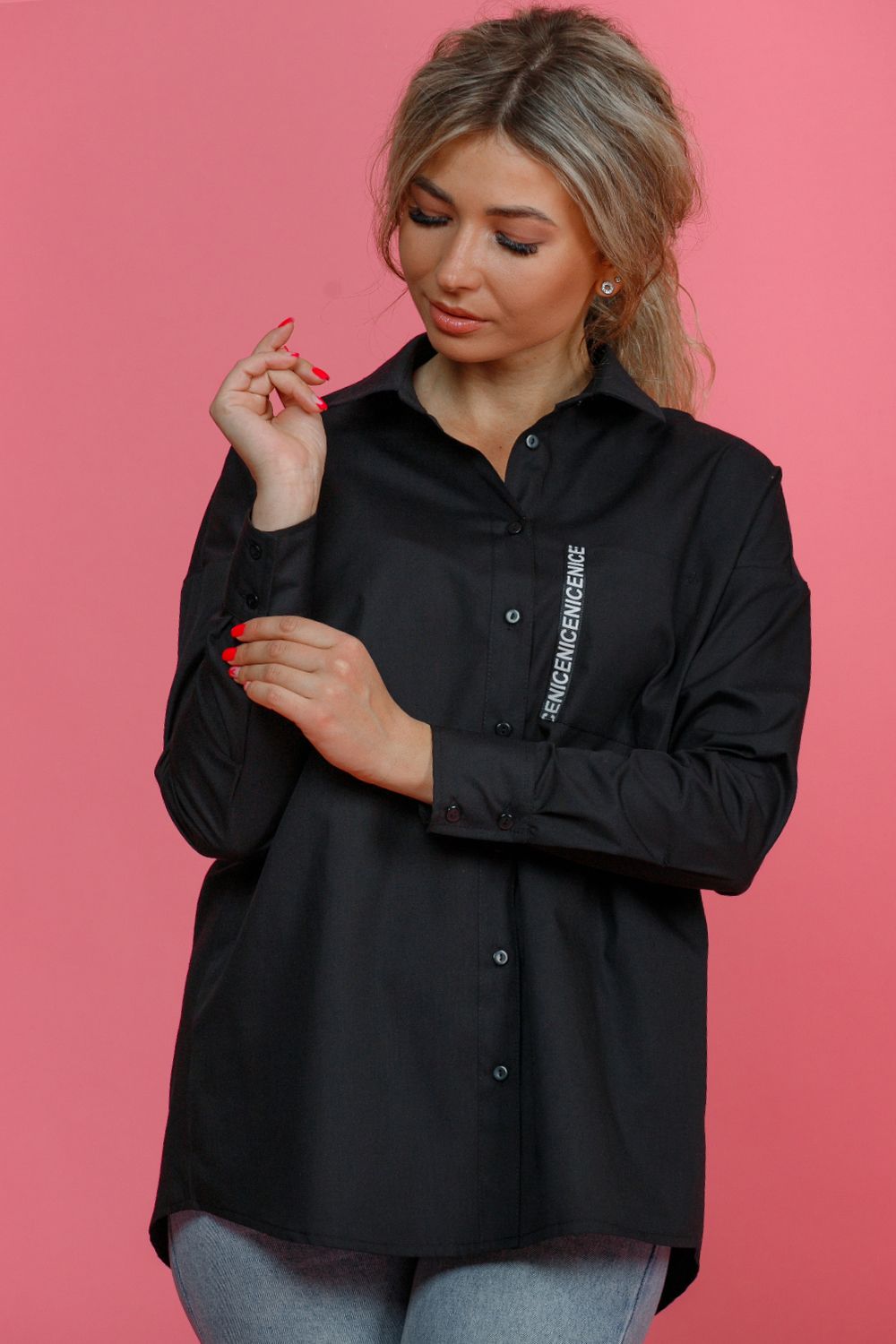 Рубашка оверсайз на пуговицах, с воротником, рукав длинный с манжетом, низ рубашки закругленный (спинка на 2 см длиннее полочки), 2 кармана на груди, на левом кармане и на кокетке на спине нашита отделочная черно-белая лента. Длина рукава измерена от плечевого шва