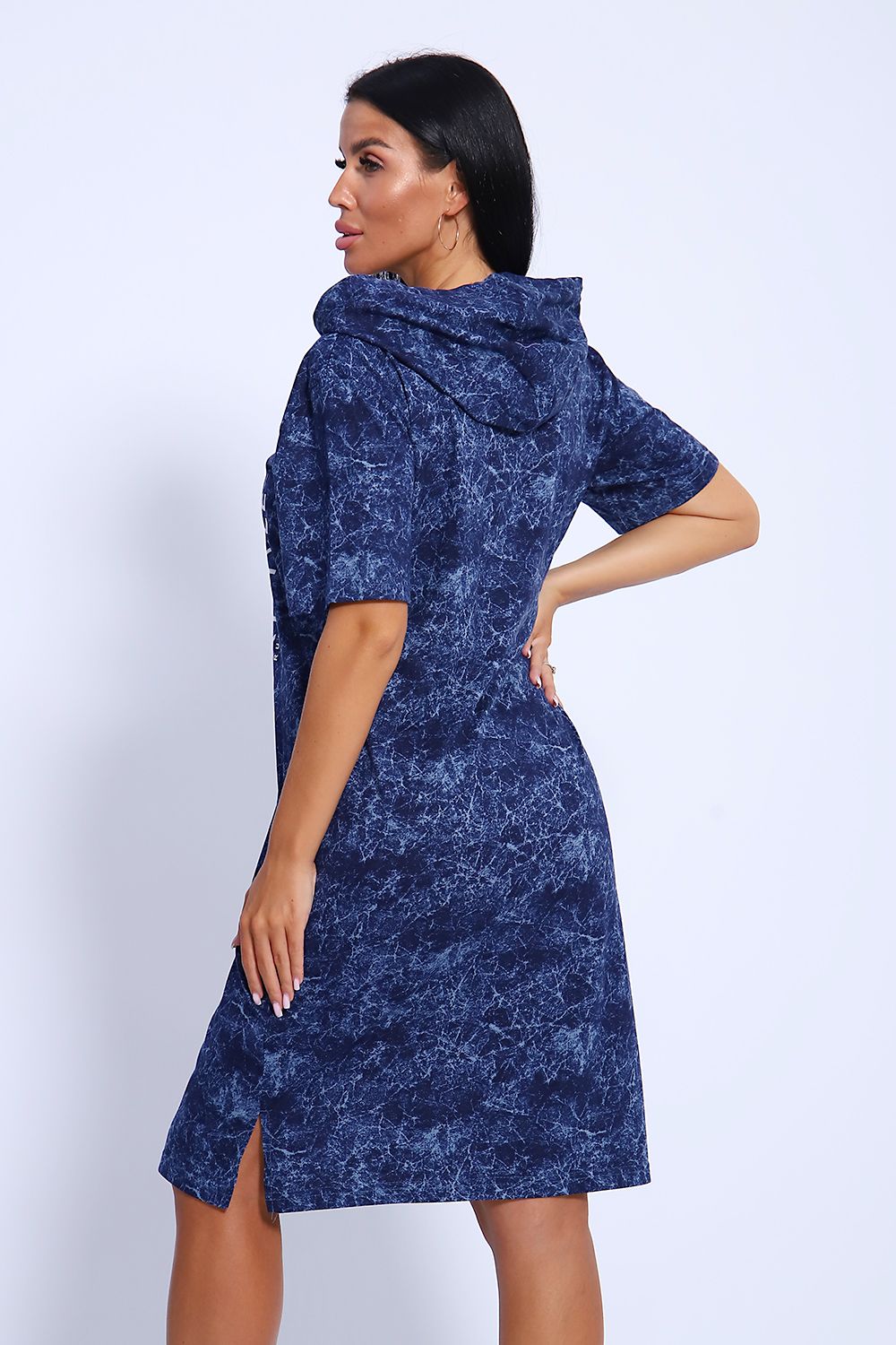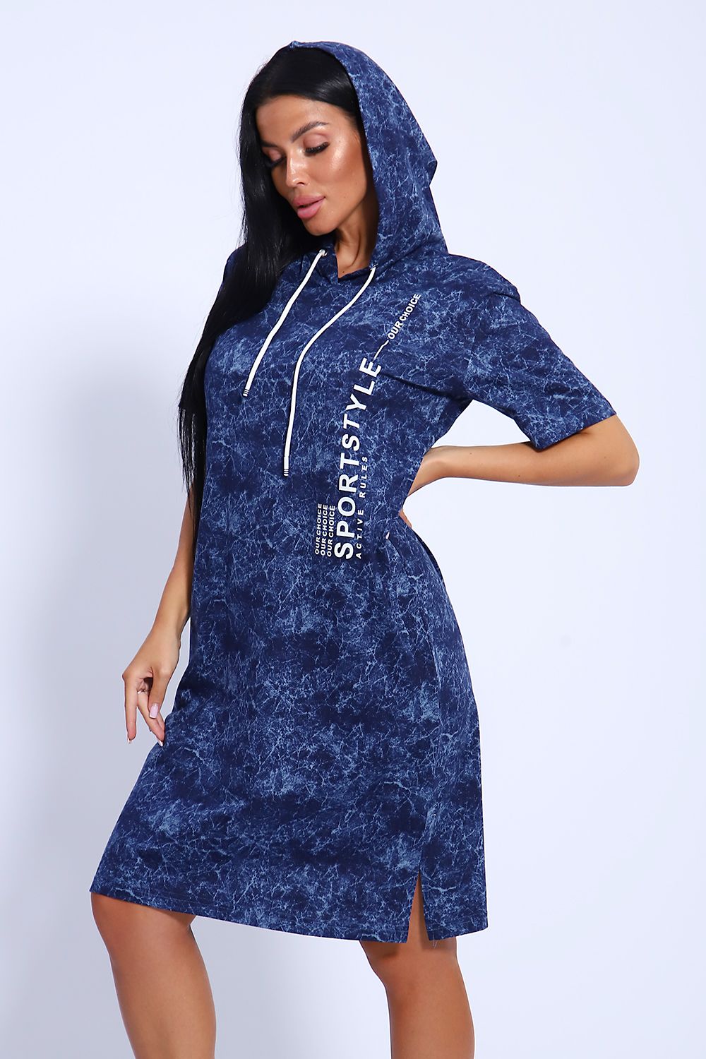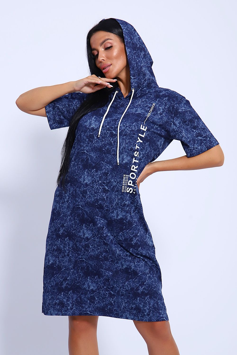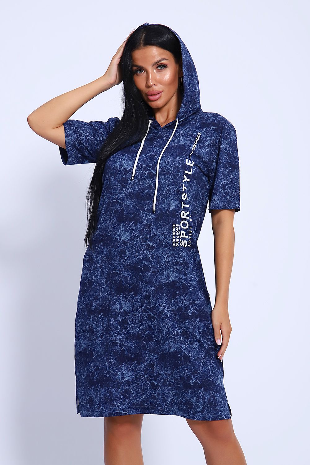Женская туника из легкого трикотажного материала тонкого хлопка - кулирки. Свободная, спортивная, с капюшоном, объем которого регулируется атласной лентой контрастного цвета. Тунику вполне можно использовать как летний вечерний костюм, как повседневный домашний наряд или как легкое праздничное или офисное платье. Благодаря свободному крою, туника отлично подойдет полным и пышным женщинам, беременным девушкам и кормящим мамам. Рисунок ткани имитирует "вареную" джинсовку, актуален всегда и придает изделию особый шик. Карманы спрятаны в боковых швах для вашего удобства.