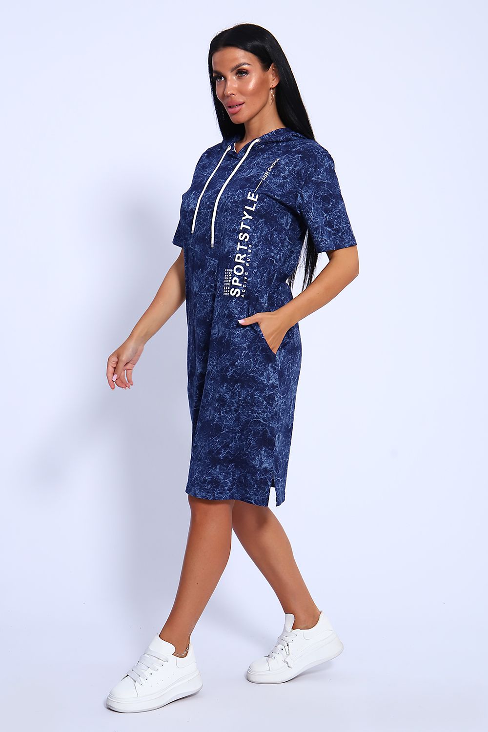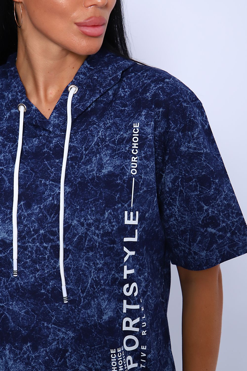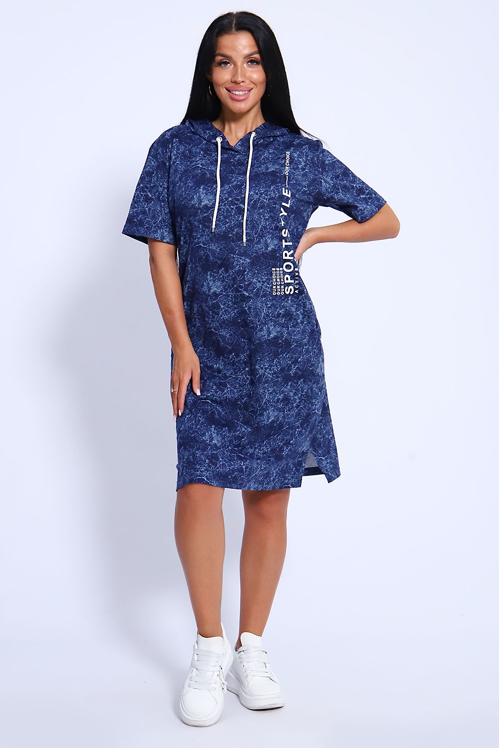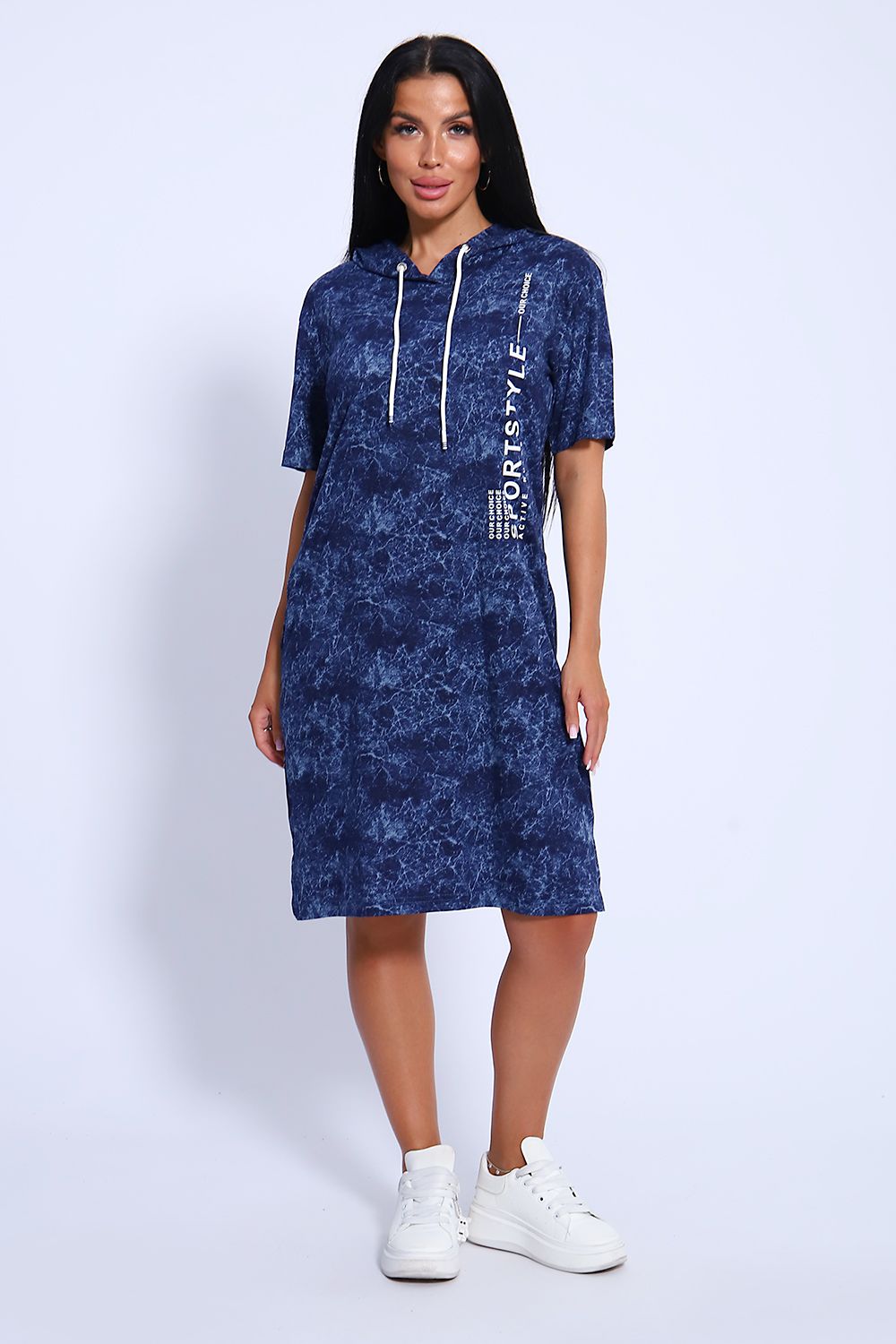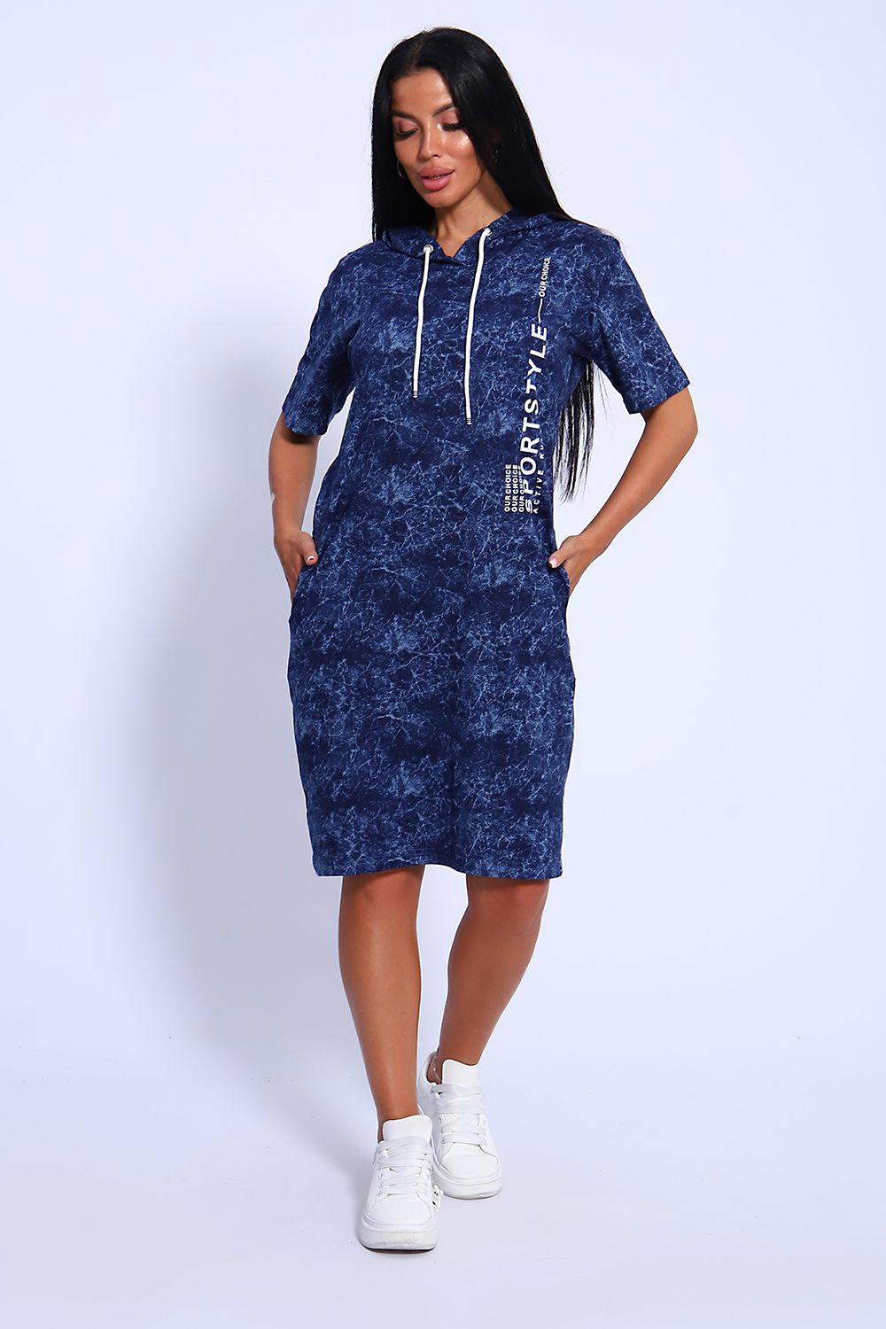 Женская туника из легкого трикотажного материала тонкого хлопка - кулирки. Свободная, спортивная, с капюшоном, объем которого регулируется атласной лентой контрастного цвета. Тунику вполне можно использовать как летний вечерний костюм, как повседневный домашний наряд или как легкое праздничное или офисное платье. Благодаря свободному крою, туника отлично подойдет полным и пышным женщинам, беременным девушкам и кормящим мамам. Рисунок ткани имитирует "вареную" джинсовку, актуален всегда и придает изделию особый шик. Карманы спрятаны в боковых швах для вашего удобства.