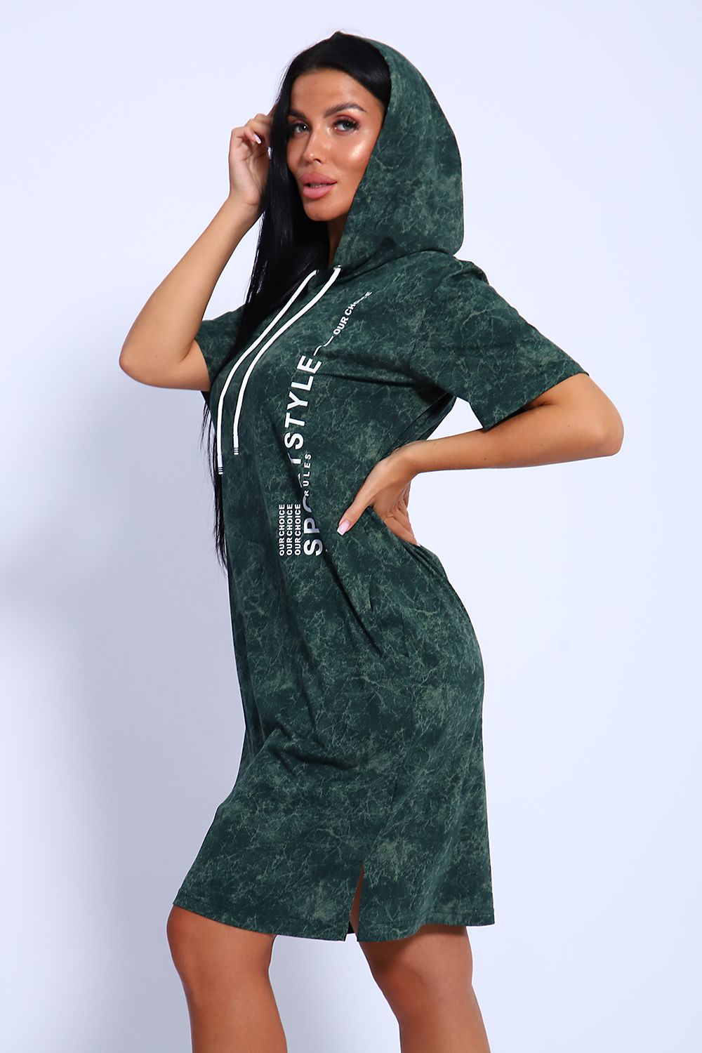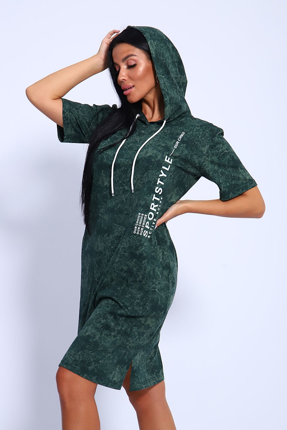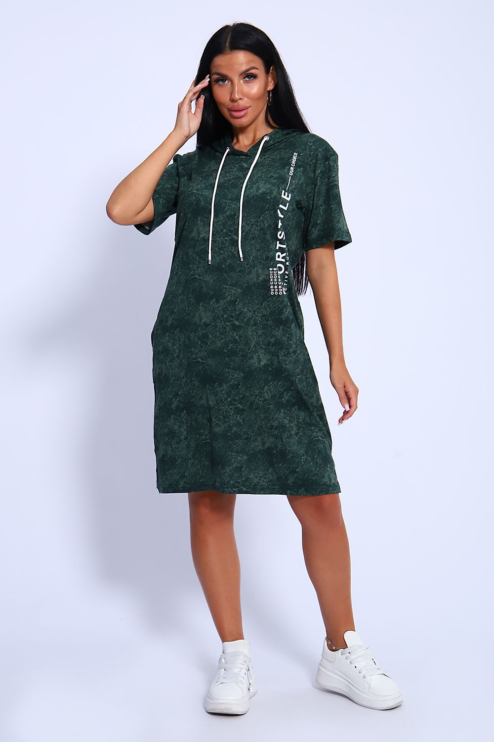 Женская туника из легкого трикотажного материала тонкого хлопка - кулирки. Свободная, спортивная, с капюшоном, объем которого регулируется атласной лентой контрастного цвета. Тунику вполне можно использовать как летний вечерний костюм, как повседневный домашний наряд или как легкое праздничное или офисное платье. Благодаря свободному крою, туника отлично подойдет полным и пышным женщинам, беременным девушкам и кормящим мамам. Рисунок ткани имитирует "вареную" джинсовку, актуален всегда и придает изделию особый шик. Карманы спрятаны в боковых швах для вашего удобства.
