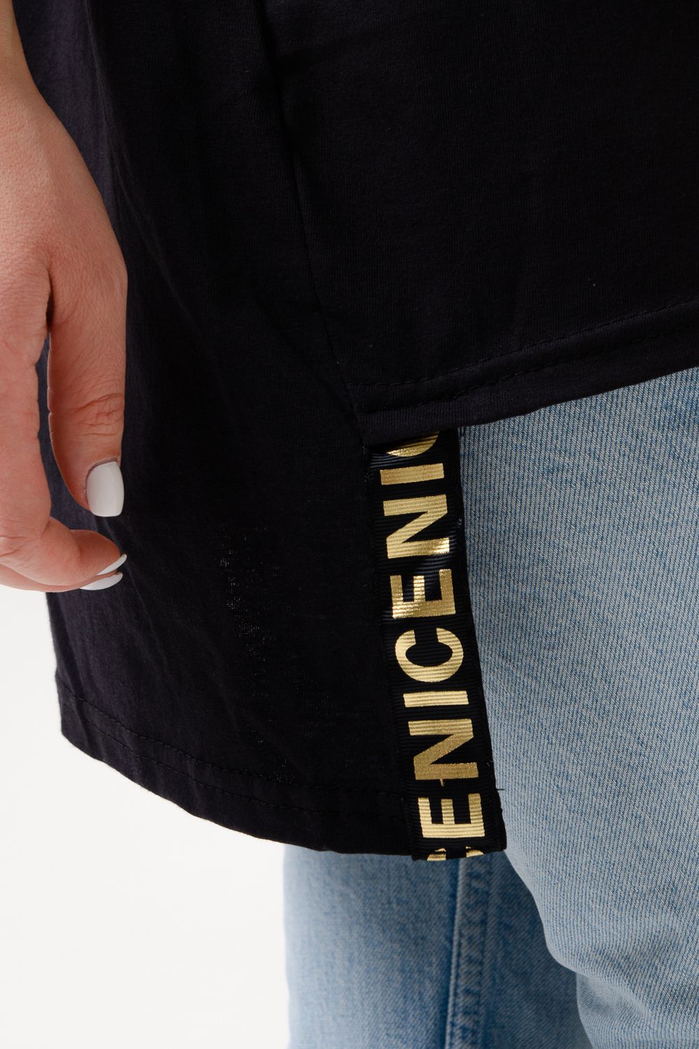 Туника женская. На полочке принт. По низу изделия отделка – тесьма.