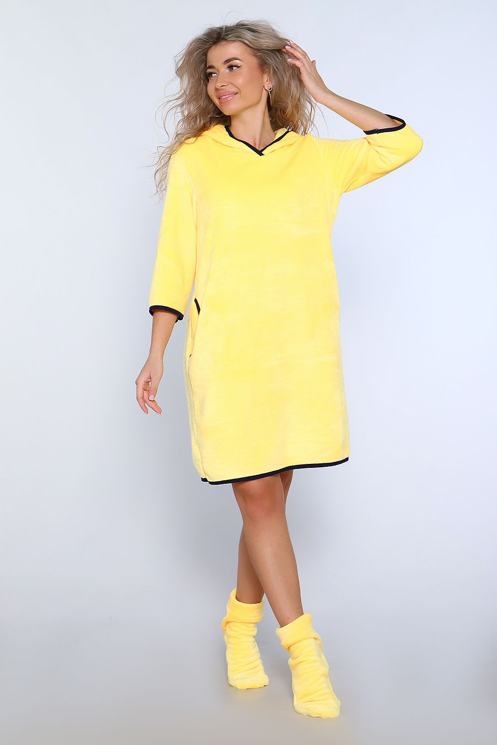 Туника женская из велсофта с капюшоном обработанный окантовкой, в боковых швах карманы, длина до колена. Туника очень приятная к телу, мягкая, легкая как пух. А для любимых покупателей мы сделали подарок, в пакетике положили носочки тоже такие же мягкие. Хороших Вам покупок и прекрасного настроения. Размеры у туник сдвоены 40-42,44-46,48-50,52-54.