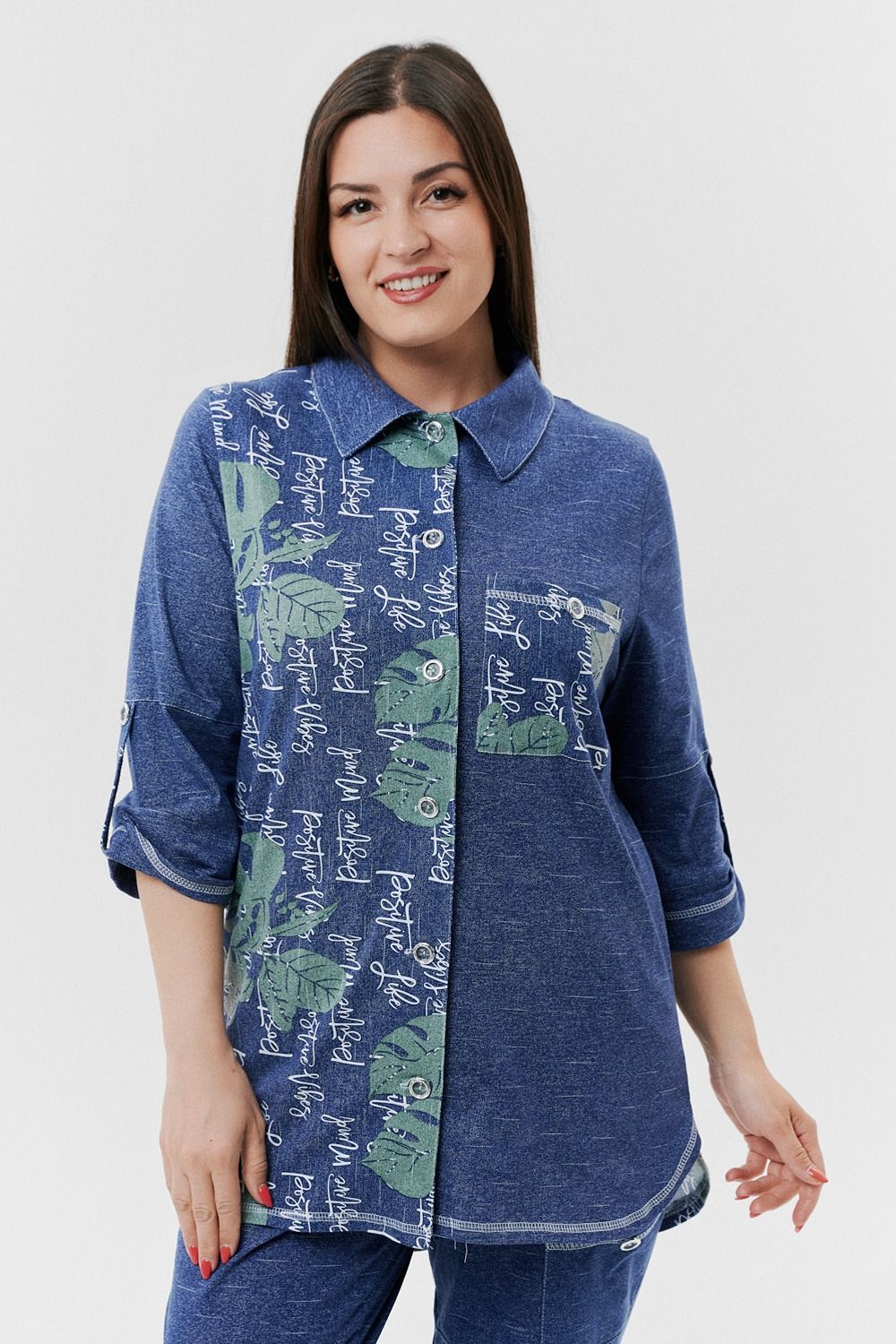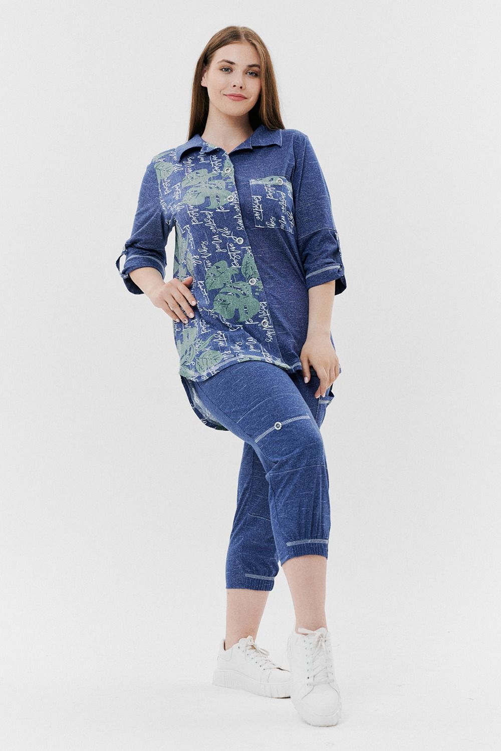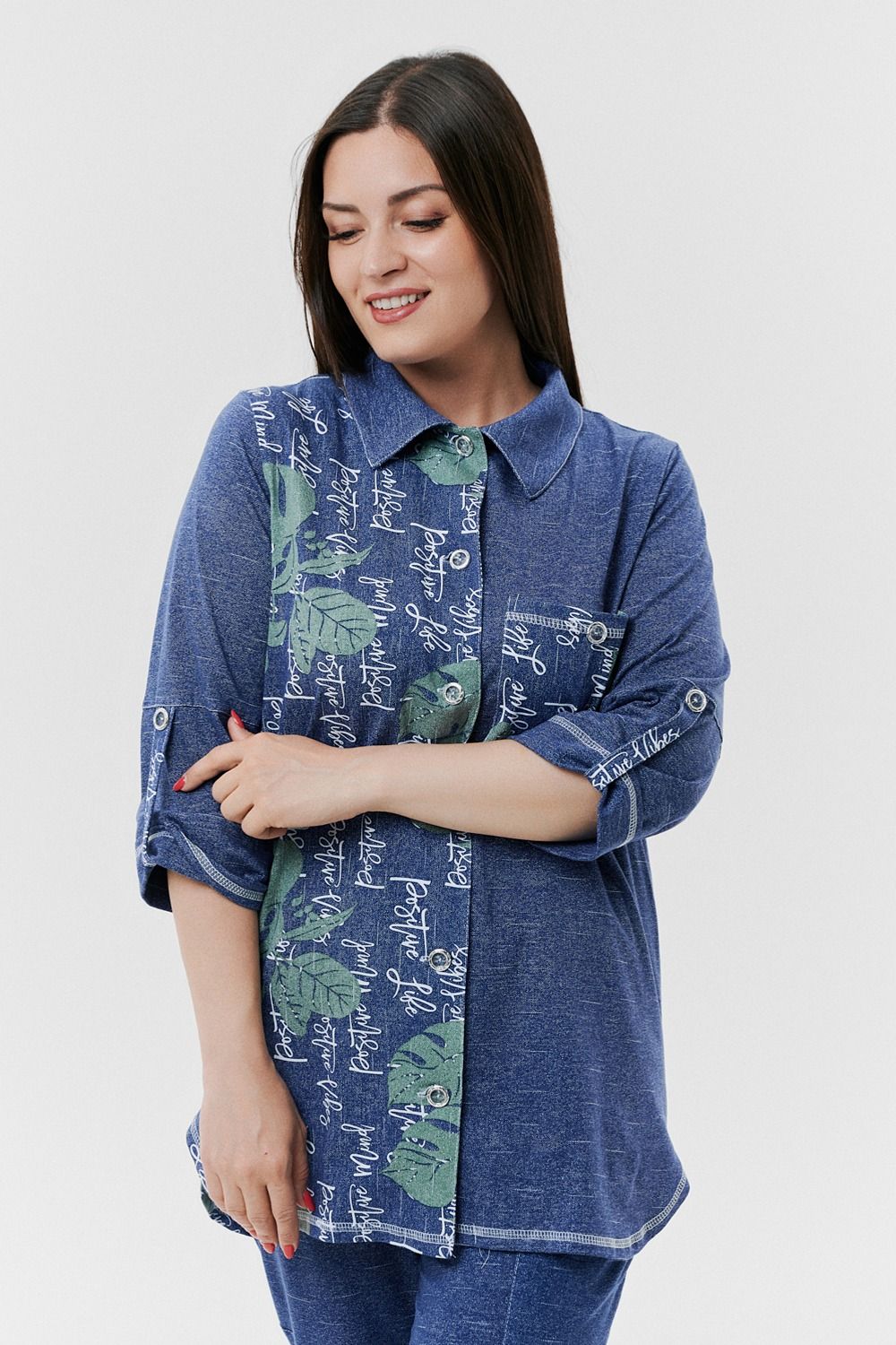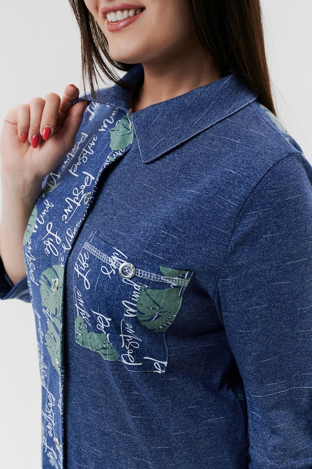 Туника женская прямого силуэта с отложным воротником. Застежка на петли-пуговицы. Рукав втачной, длина 3/4 с манжетой и хлястом. Низ туники фигурный, спинка несколько длиннее полочки. На полочке нагрудный карман.