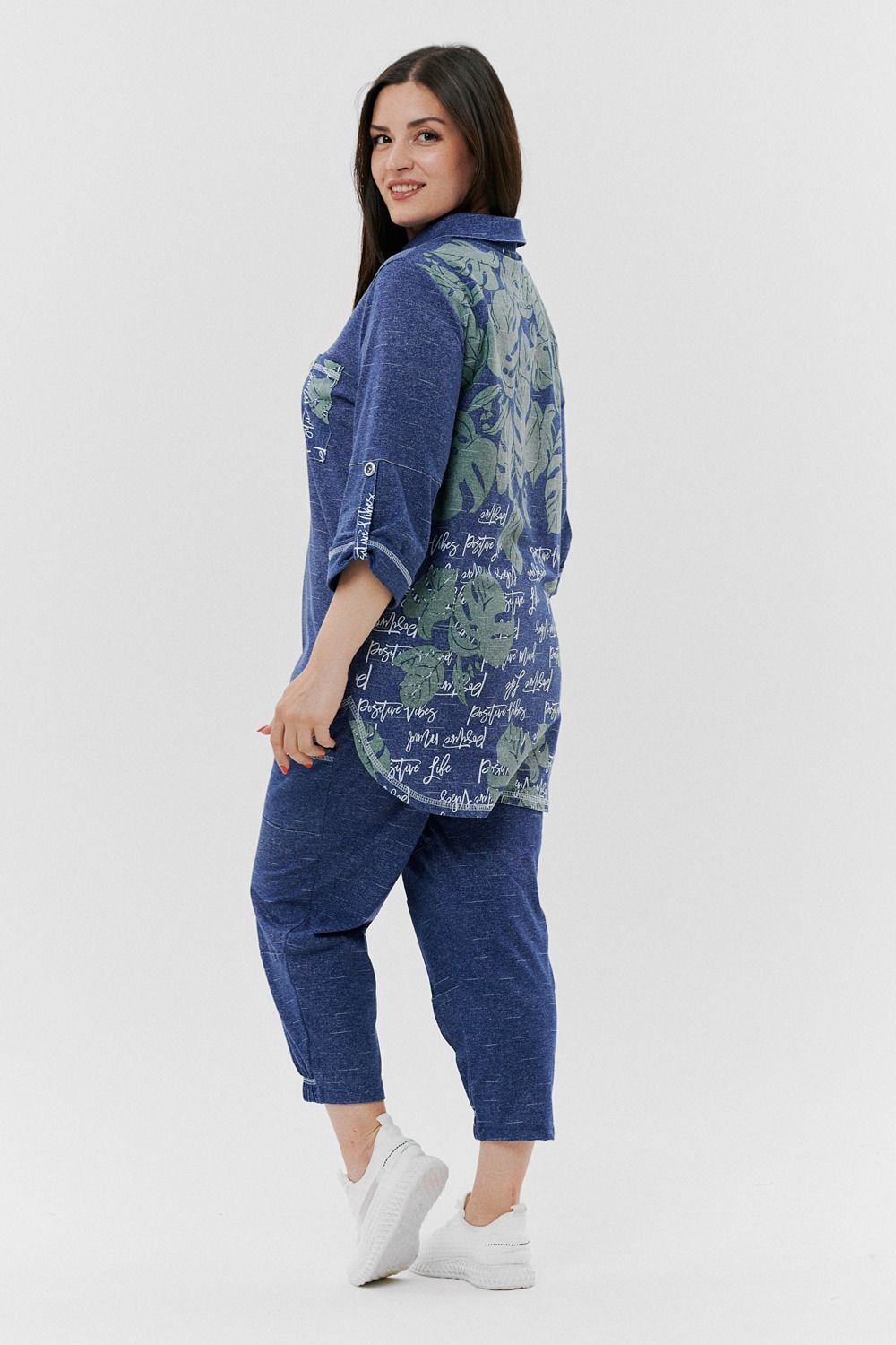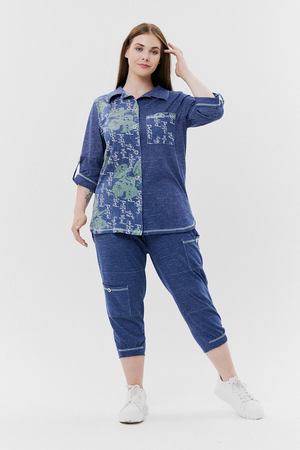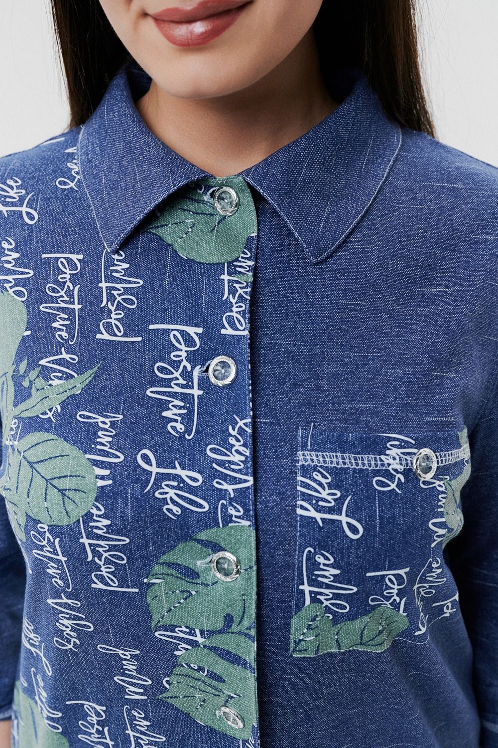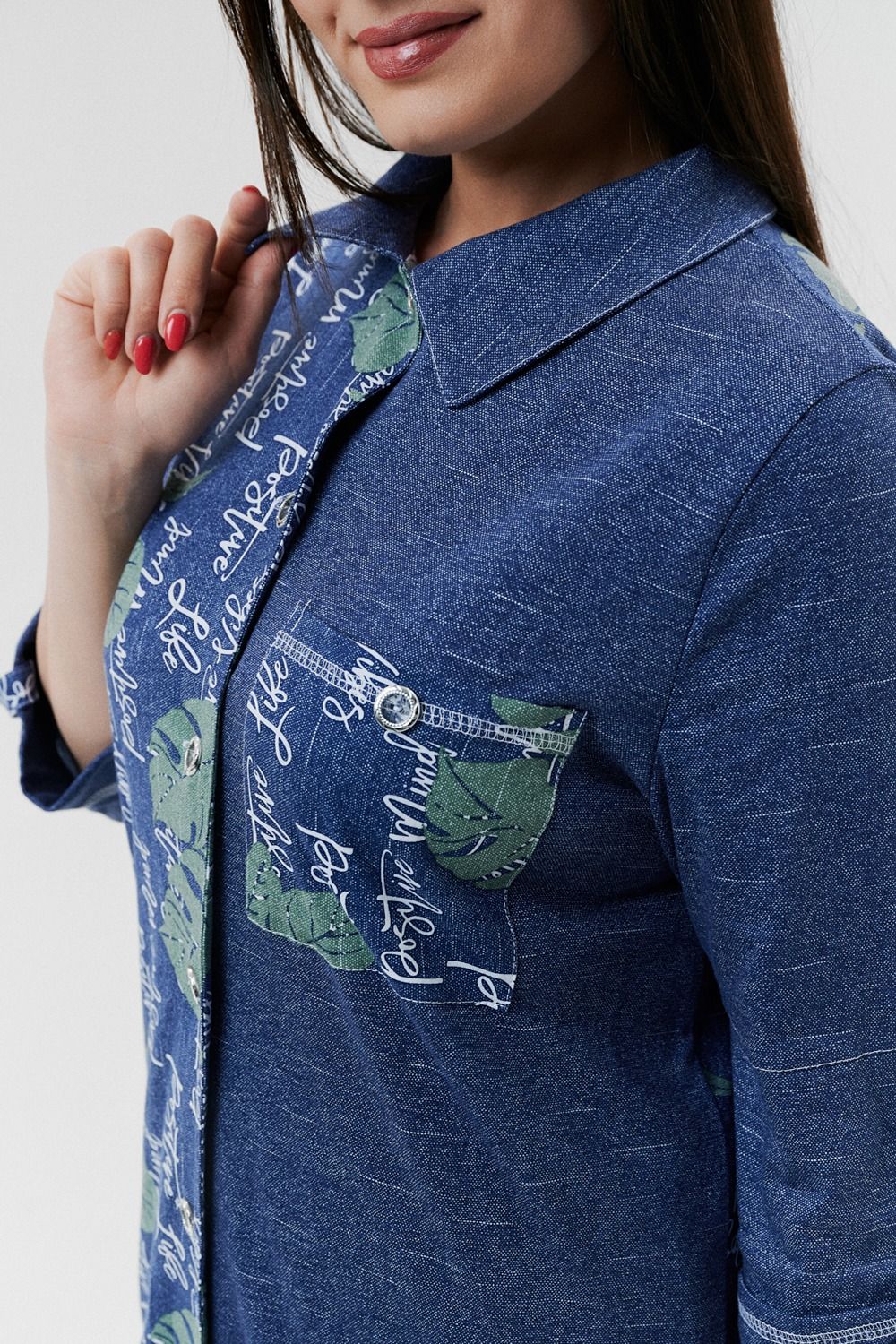 Туника женская прямого силуэта с отложным воротником. Застежка на петли-пуговицы. Рукав втачной, длина 3/4 с манжетой и хлястом. Низ туники фигурный, спинка несколько длиннее полочки. На полочке нагрудный карман.