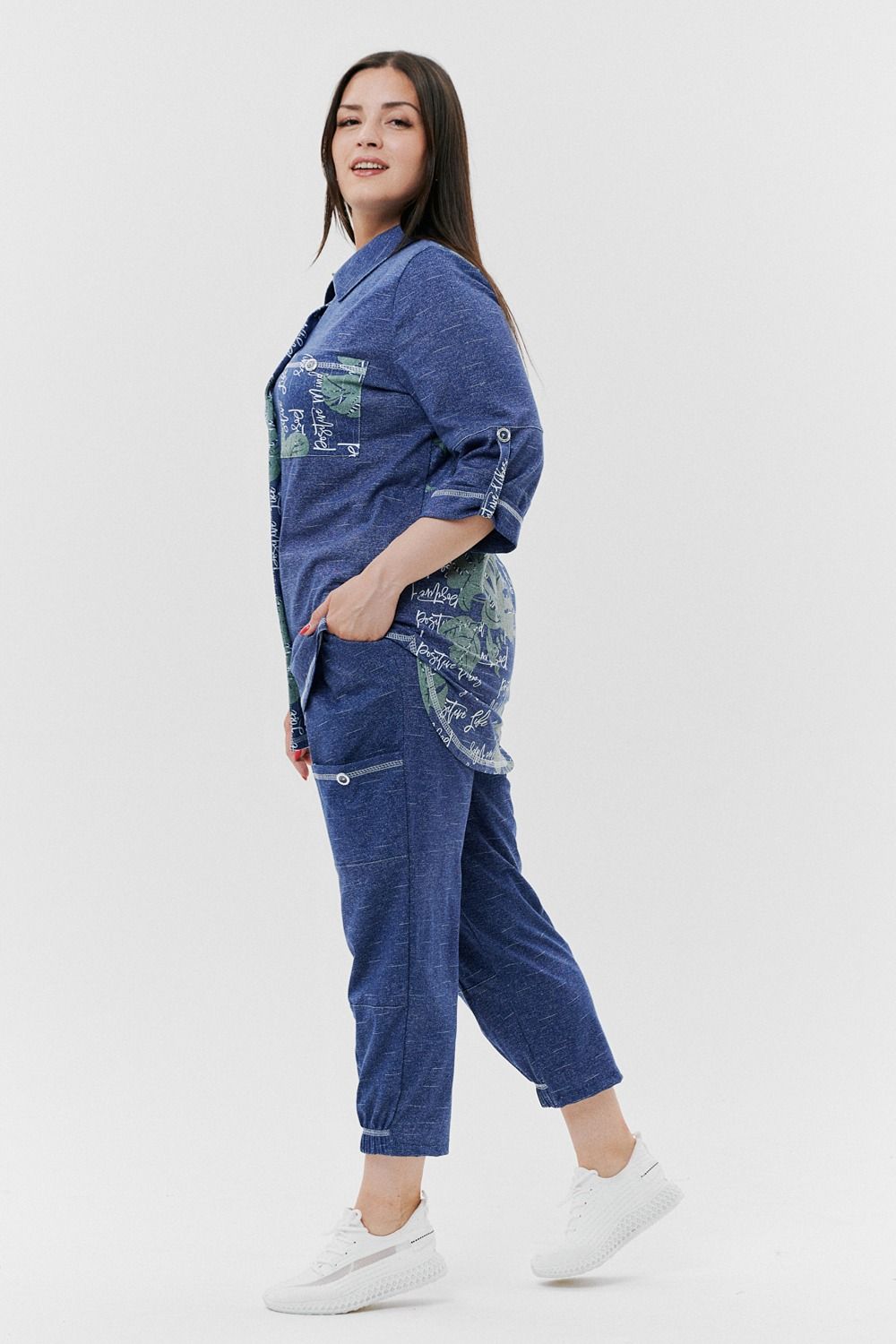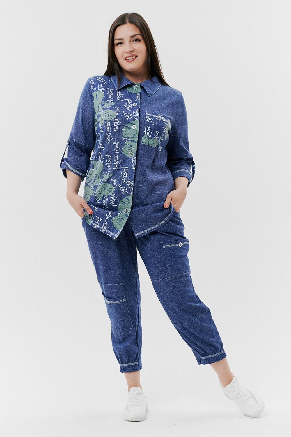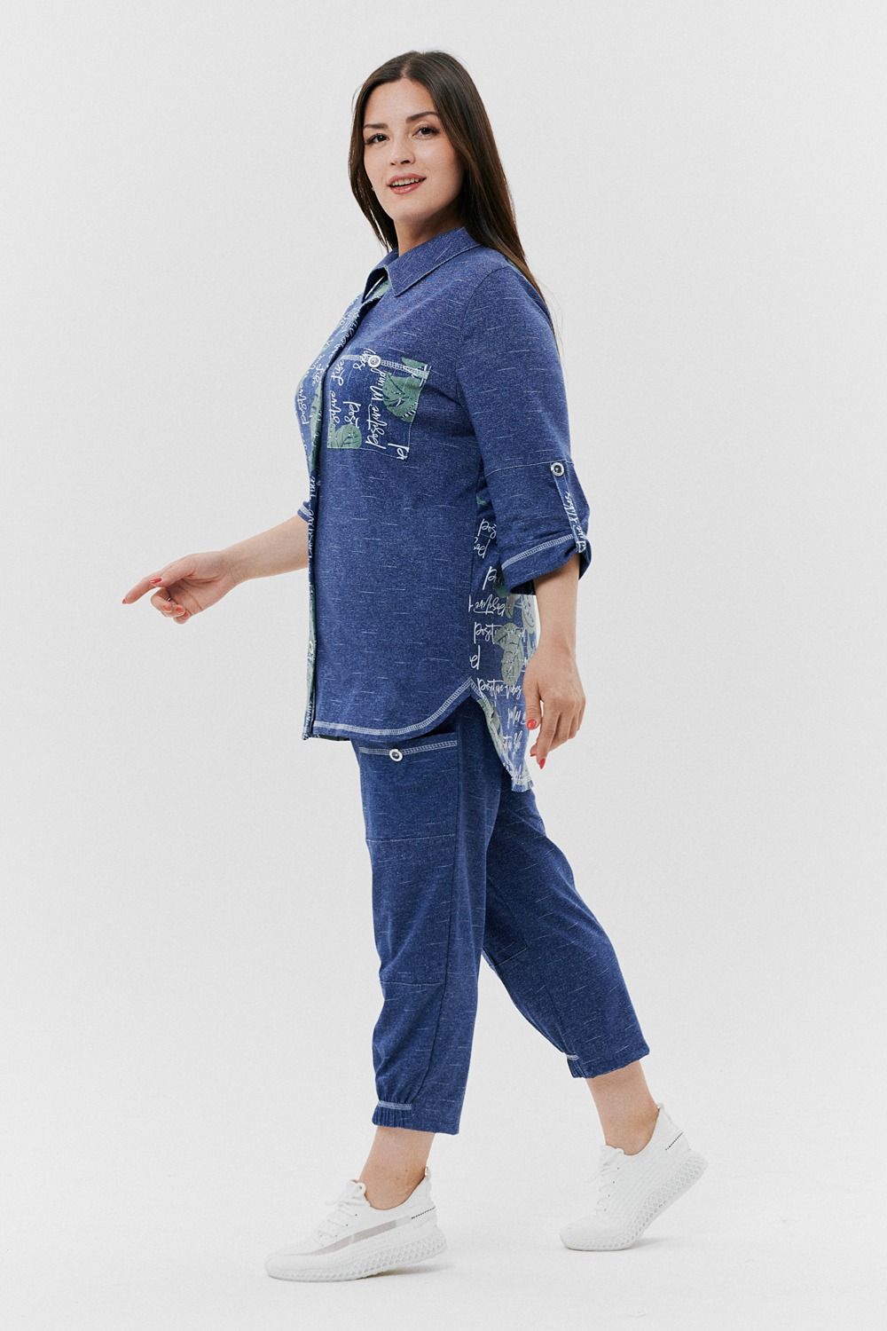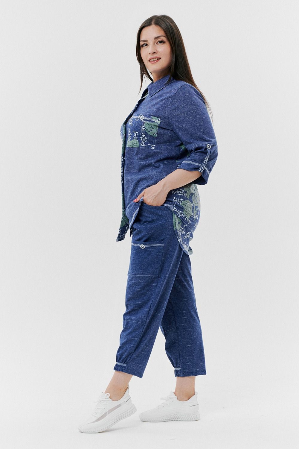 Туника женская прямого силуэта с отложным воротником. Застежка на петли-пуговицы. Рукав втачной, длина 3/4 с манжетой и хлястом. Низ туники фигурный, спинка несколько длиннее полочки. На полочке нагрудный карман.