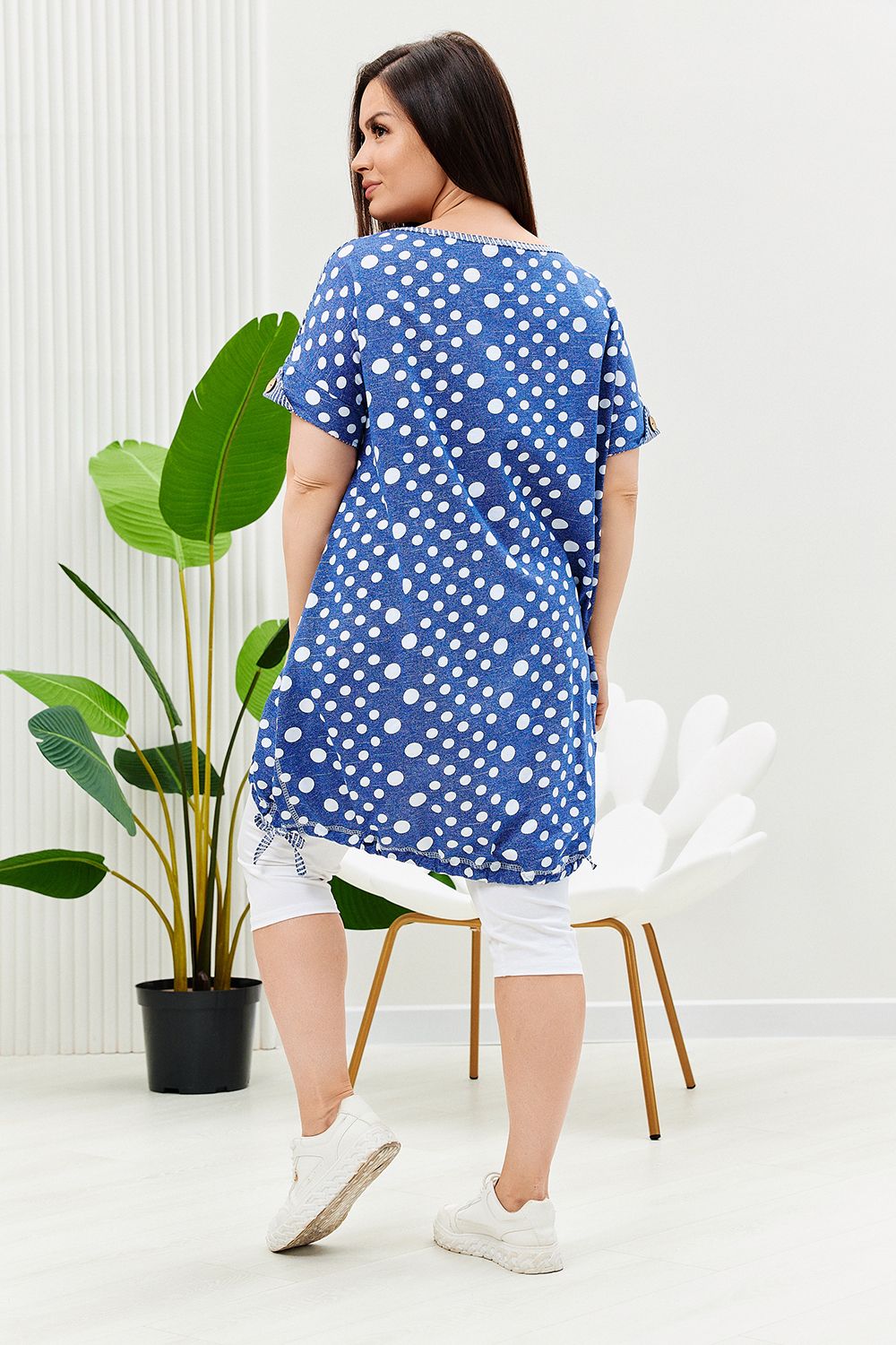 Туника женская, к низу расширенная. Рукав короткий цельнокроенный с манжетой. Горловина Y-образная. Полочка состоит из четырех асимметричных частей, две части по диагонали из ткани в горошек, две другие - из мелкой полоски. Низ фигурный, фиксируется утяжками. По боковым швам разрезы. На полочках два накладных кармана, форма карманов квадраты, расположенные по диагонали, верхние уголки карманов зафиксированы декоративными пуговицами "кокос". Также пуговицы пришиты на отогнутых уголках манжет. Сочетание тканей "горошка" и мелкой полосы придают изделию своеобразную особенность.