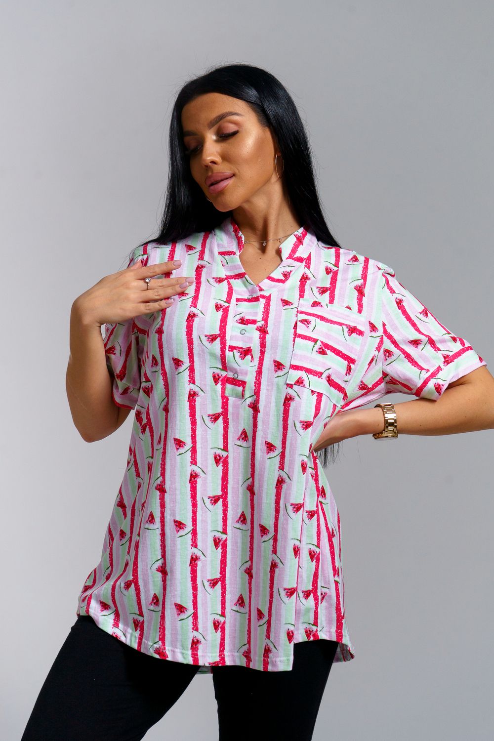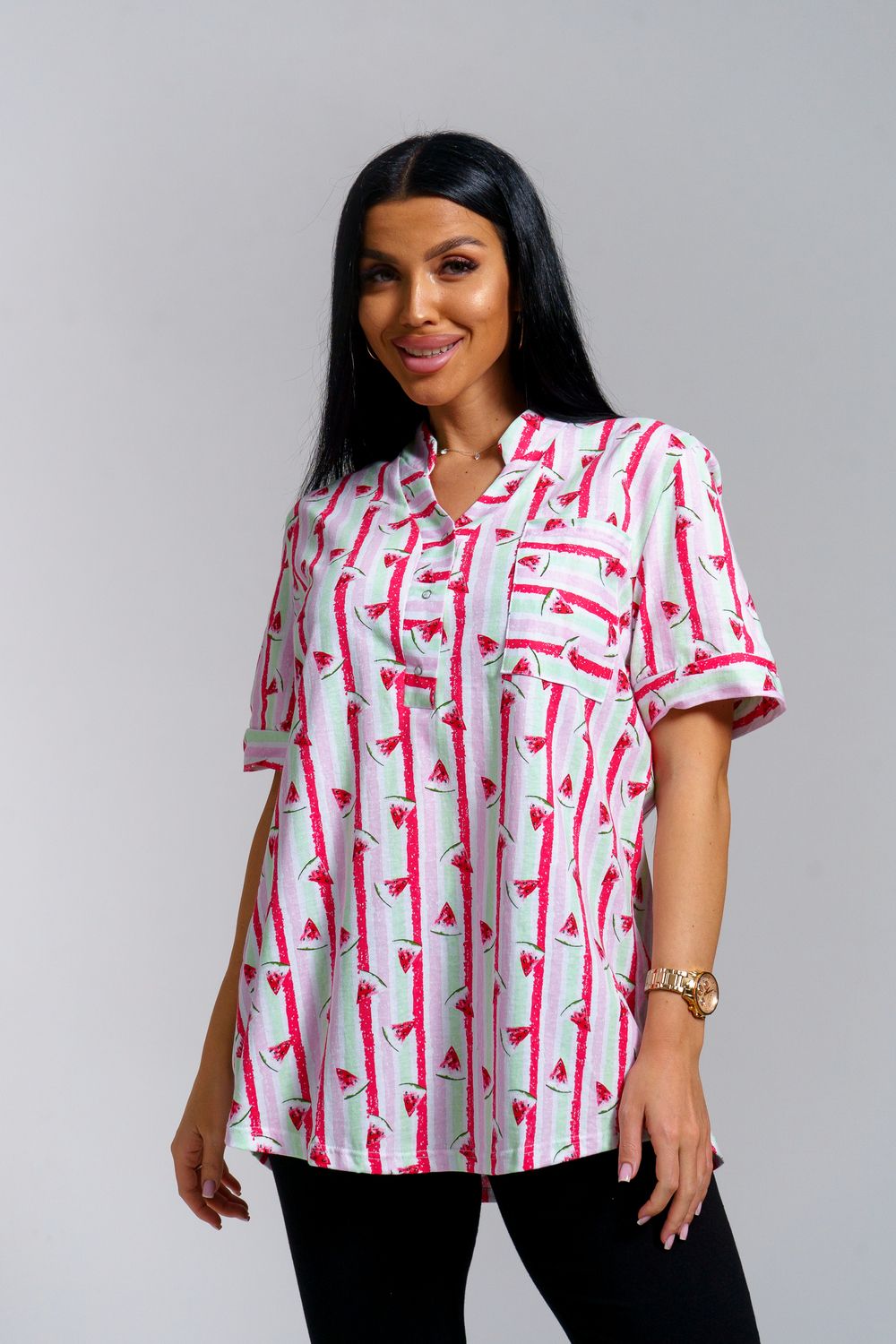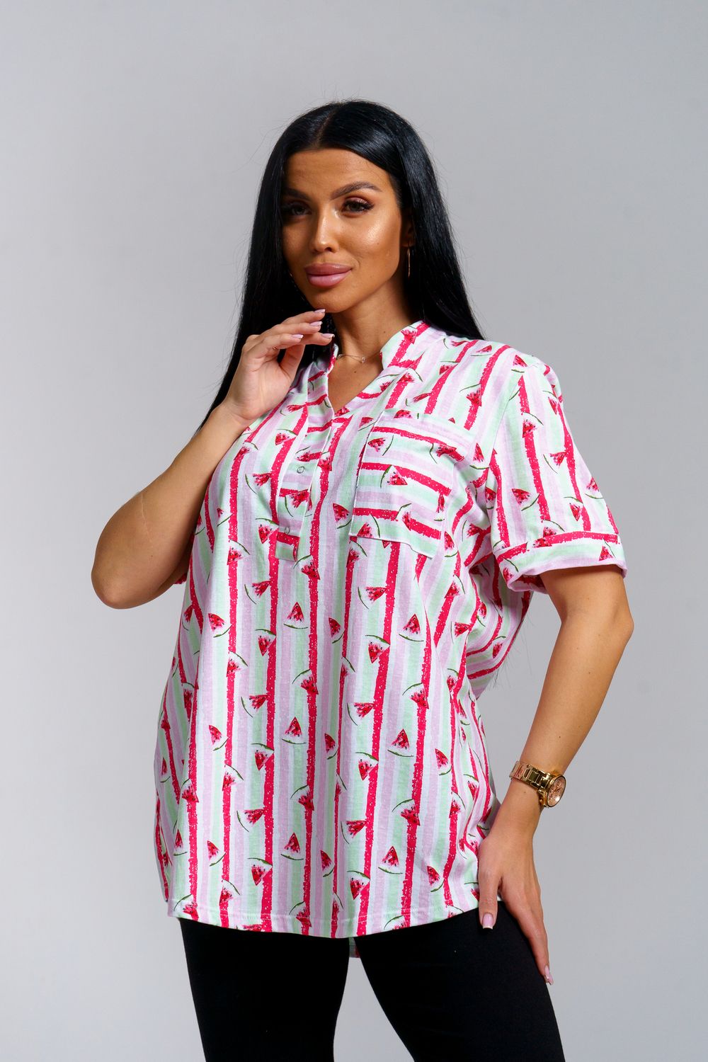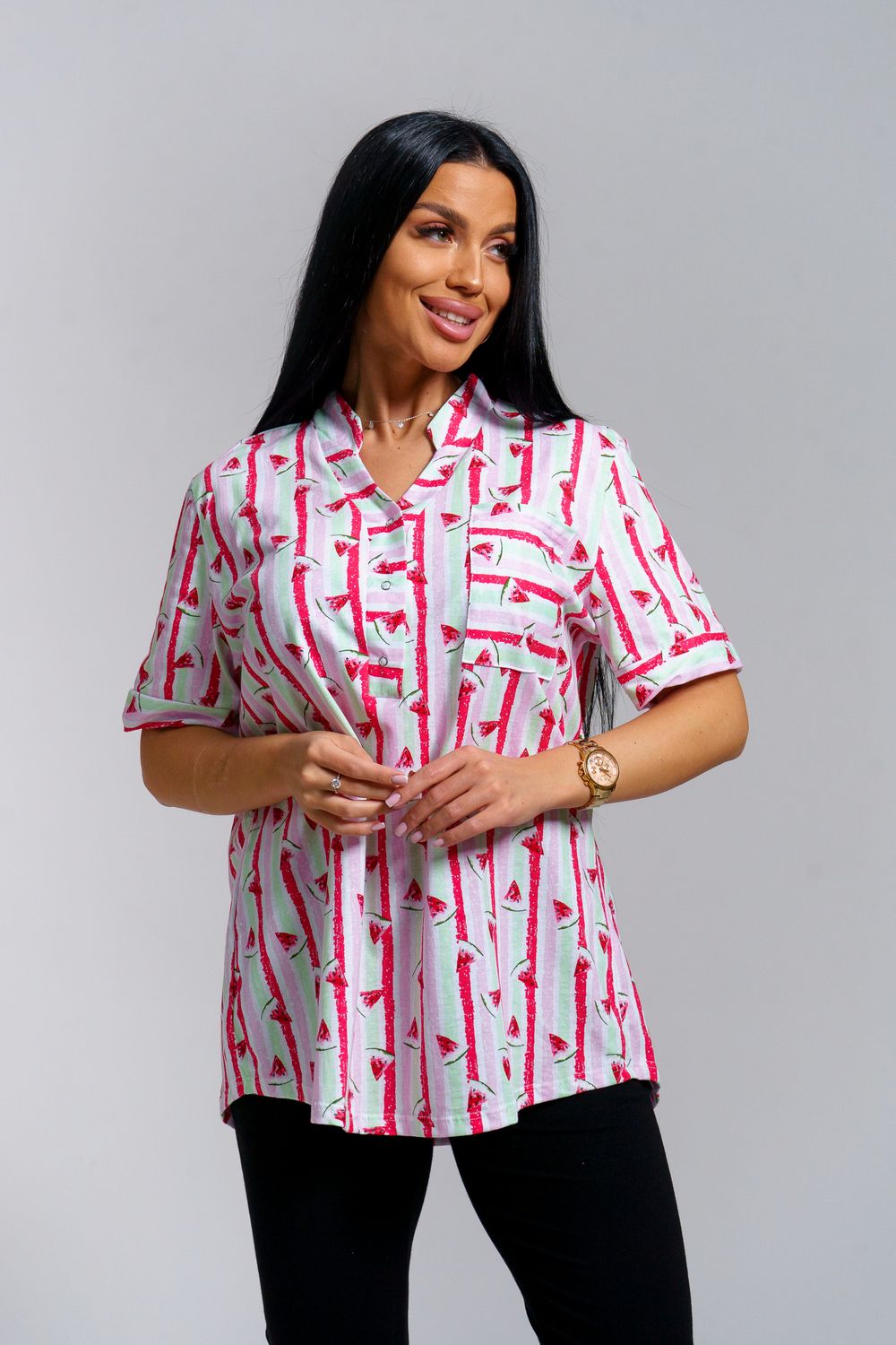 Блузка женская с втачным коротким рукавом на манжете, воротник — стойка, на детали переда накладной карман. На детали спинки — кокетка.