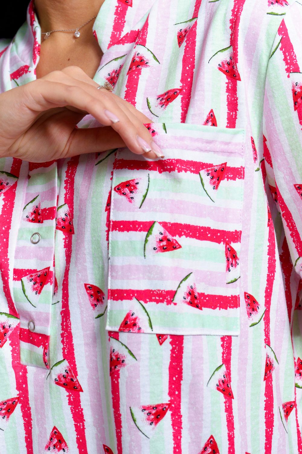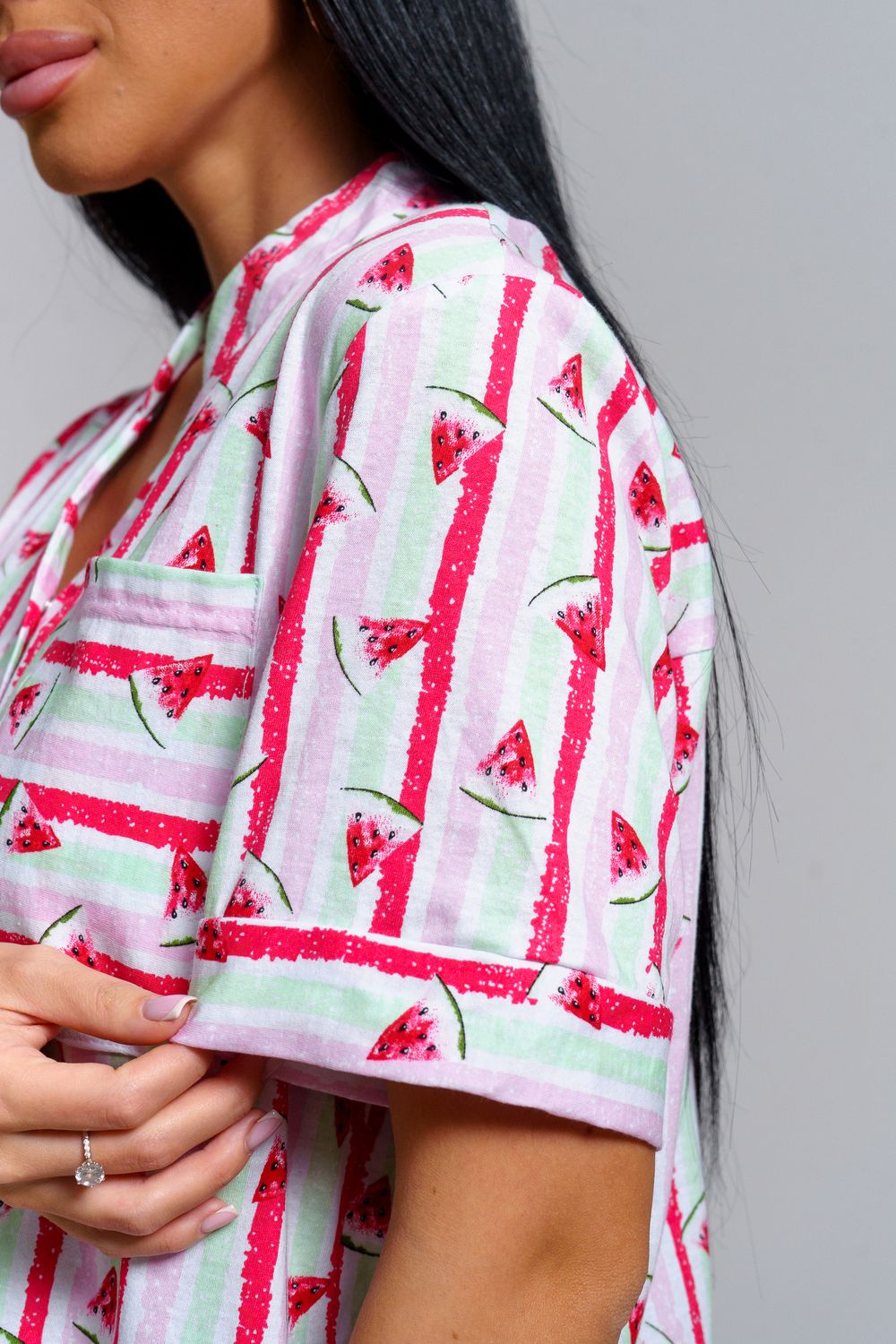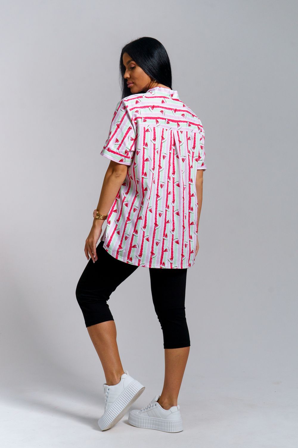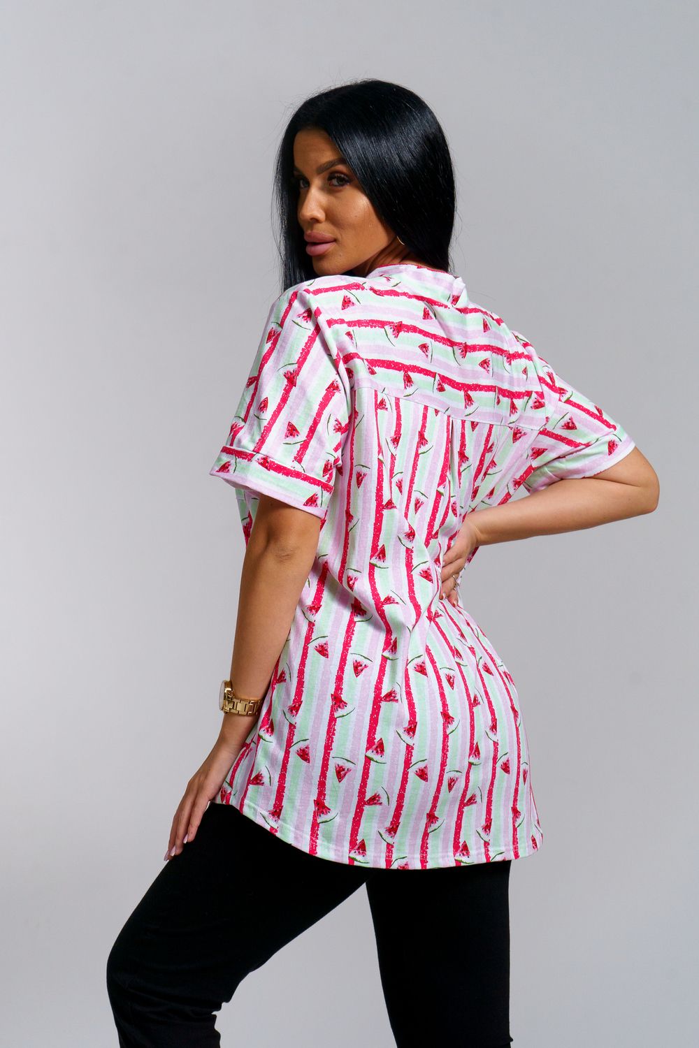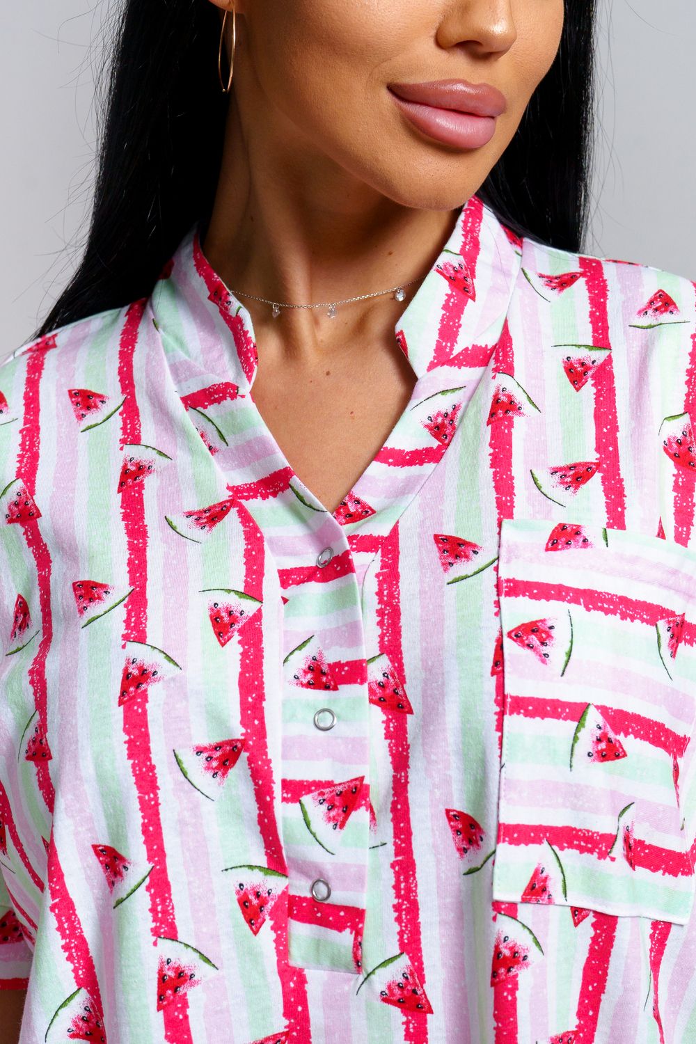 Блузка женская с втачным коротким рукавом на манжете, воротник — стойка, на детали переда накладной карман. На детали спинки — кокетка.