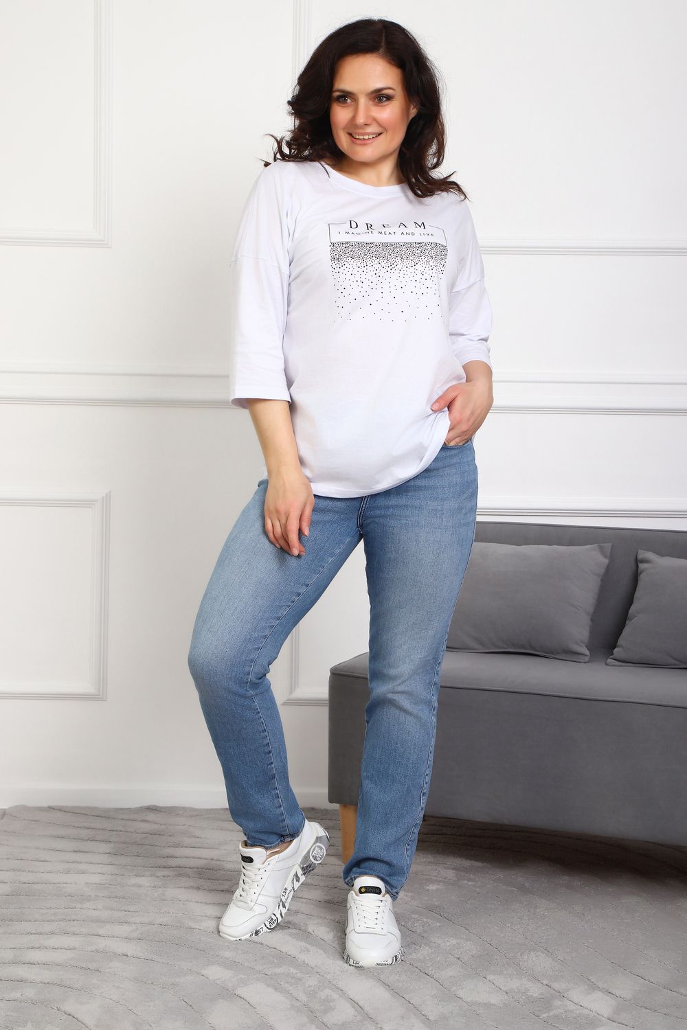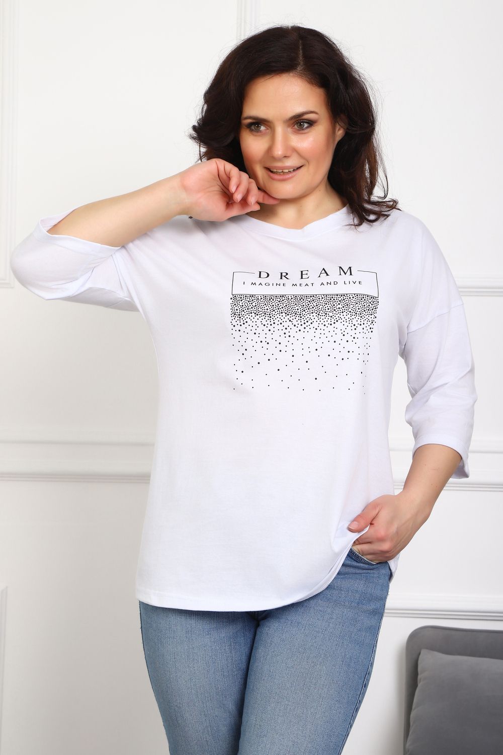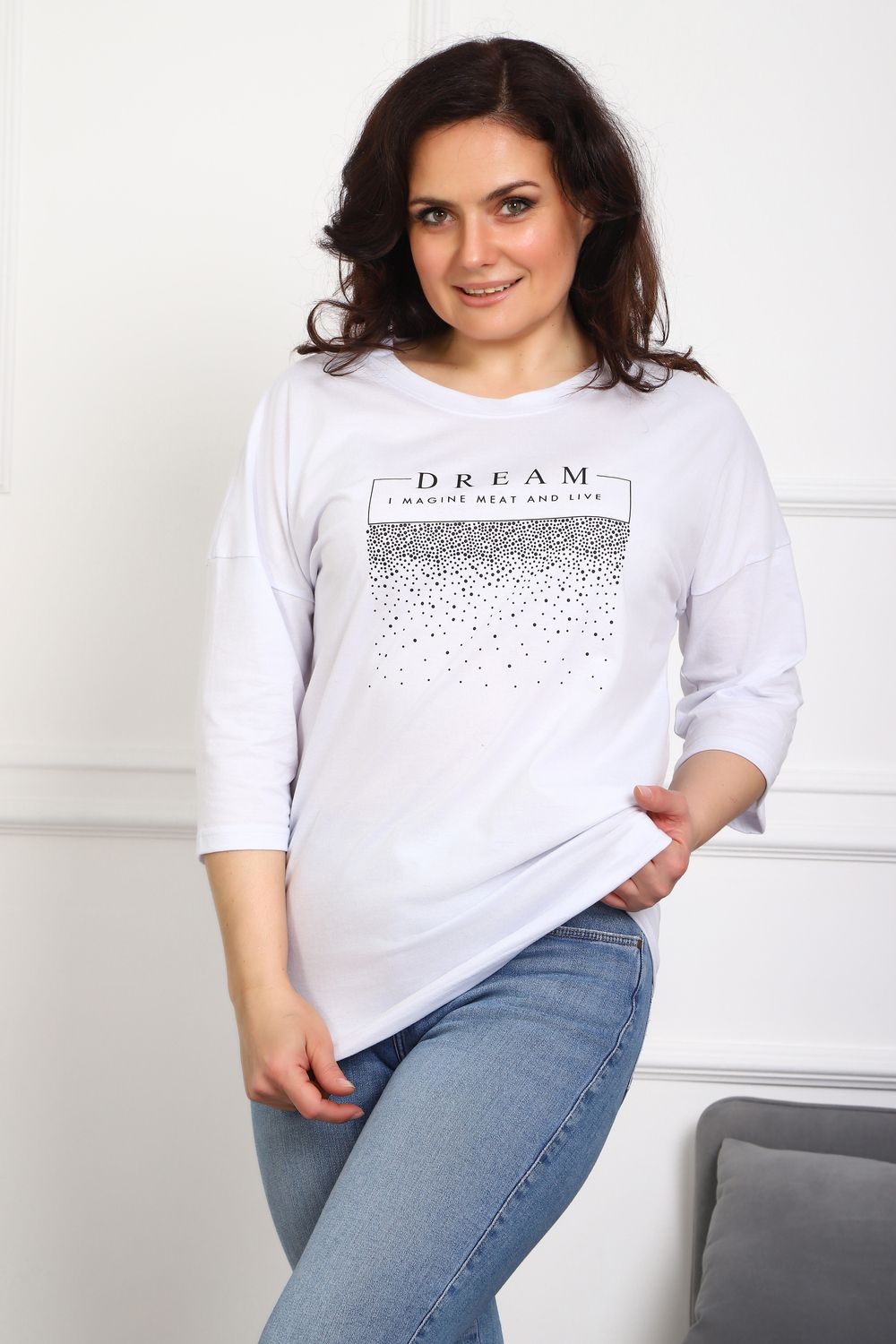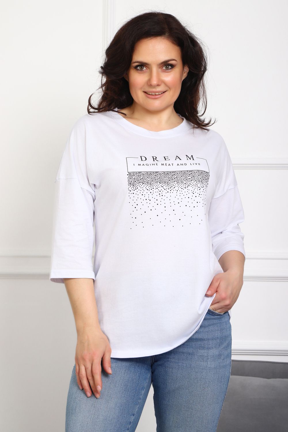 (туника женская дрим) Женская туника из мягкой и приятной к телу кулирки, выполненная из натурального хлопка (100%). Эта модель идеально подчеркнет вашу фигуру благодаря элегантному приталенному силуэту и слегка приспущенной линии плеча. Рукава длиной 3/4 делают образ комфортным и универсальным, а круглый вырез горловины добавляет легкости и нежности общему виду. Особенное внимание привлекает стильный принт на груди, украшенный изящной надписью, создающими романтичное настроение. Свободная посадка обеспечивает комфорт и свободу движений, делая этот предмет гардероба идеальным выбором для повседневных образов и отдыха.