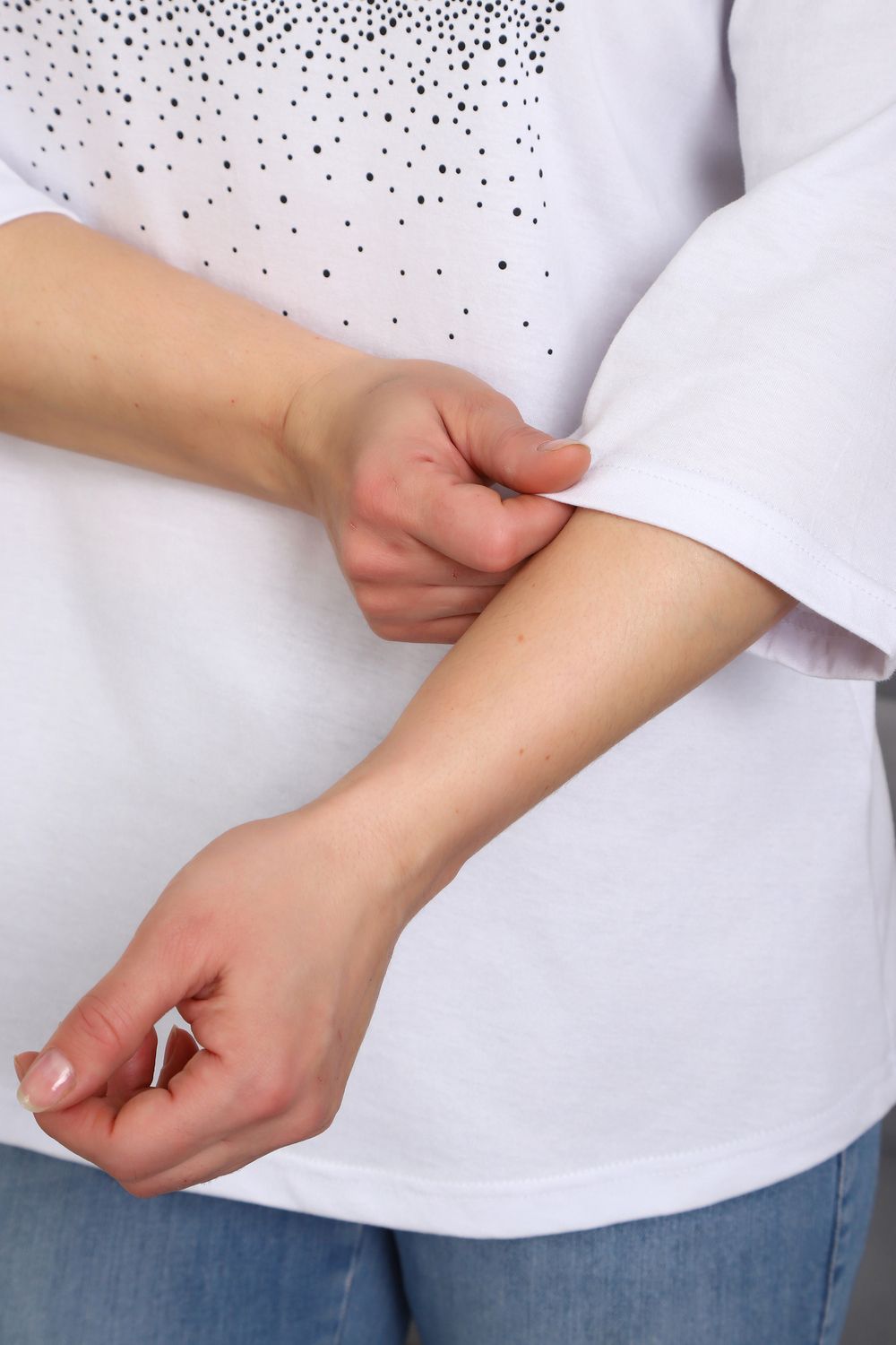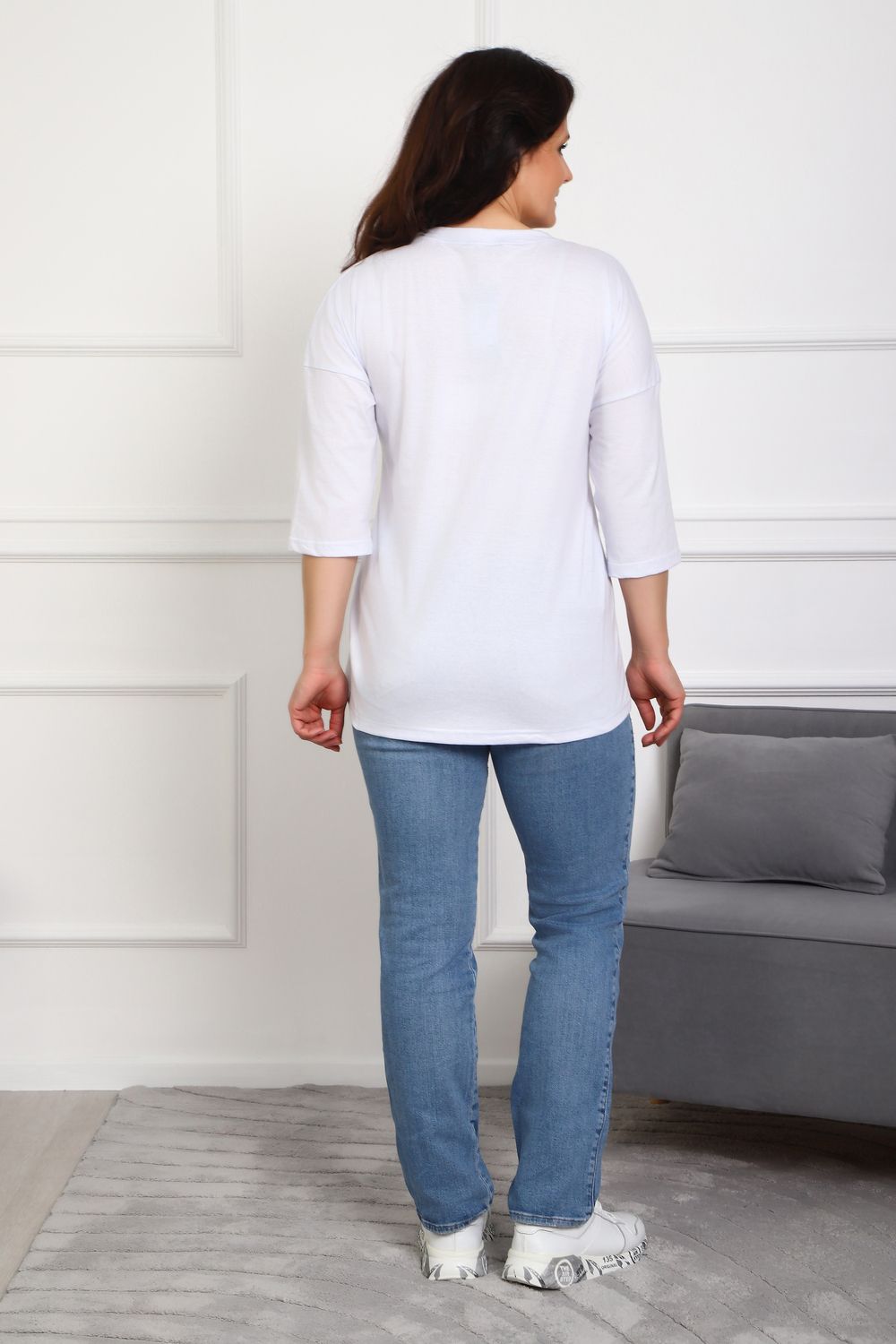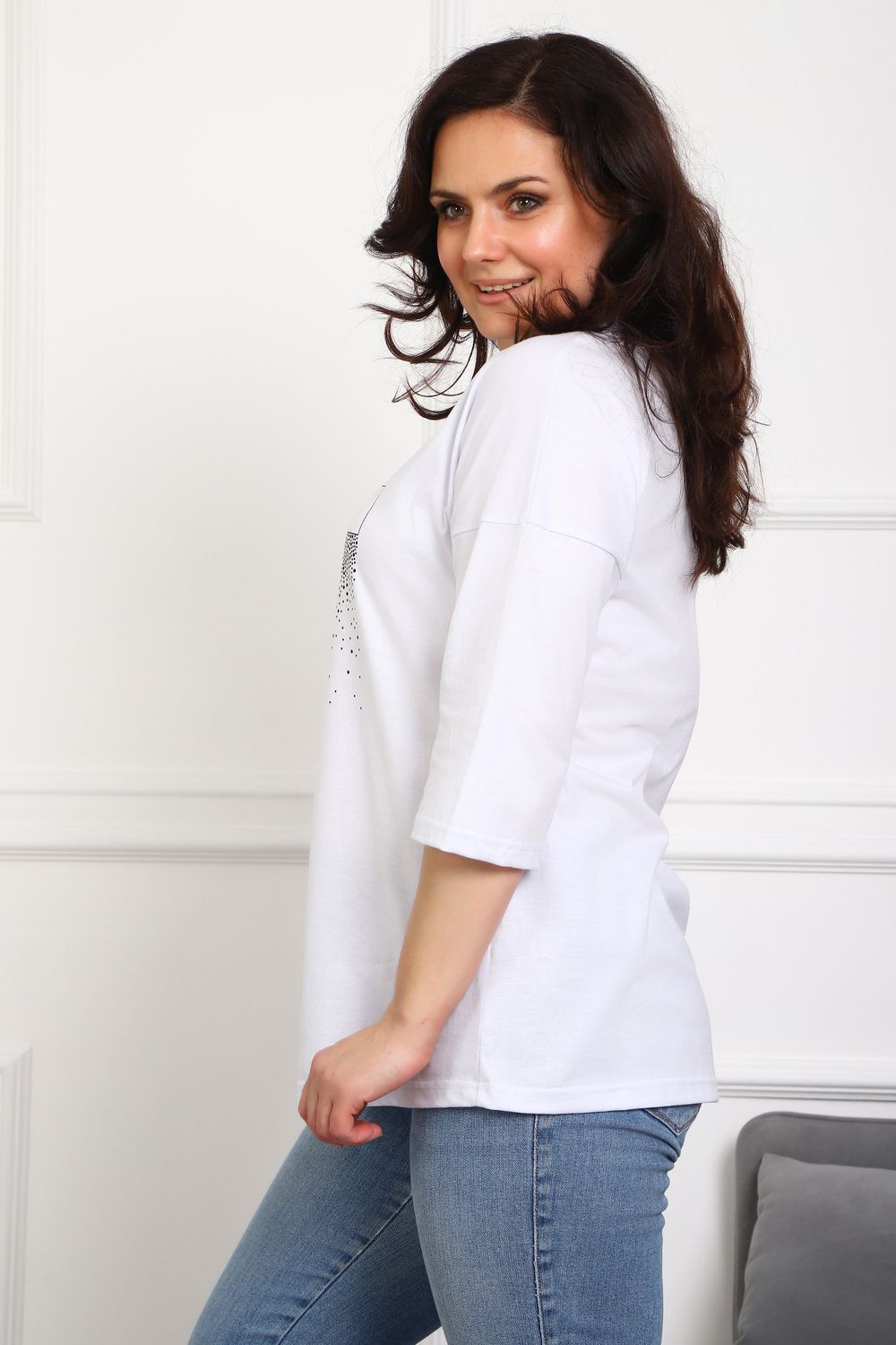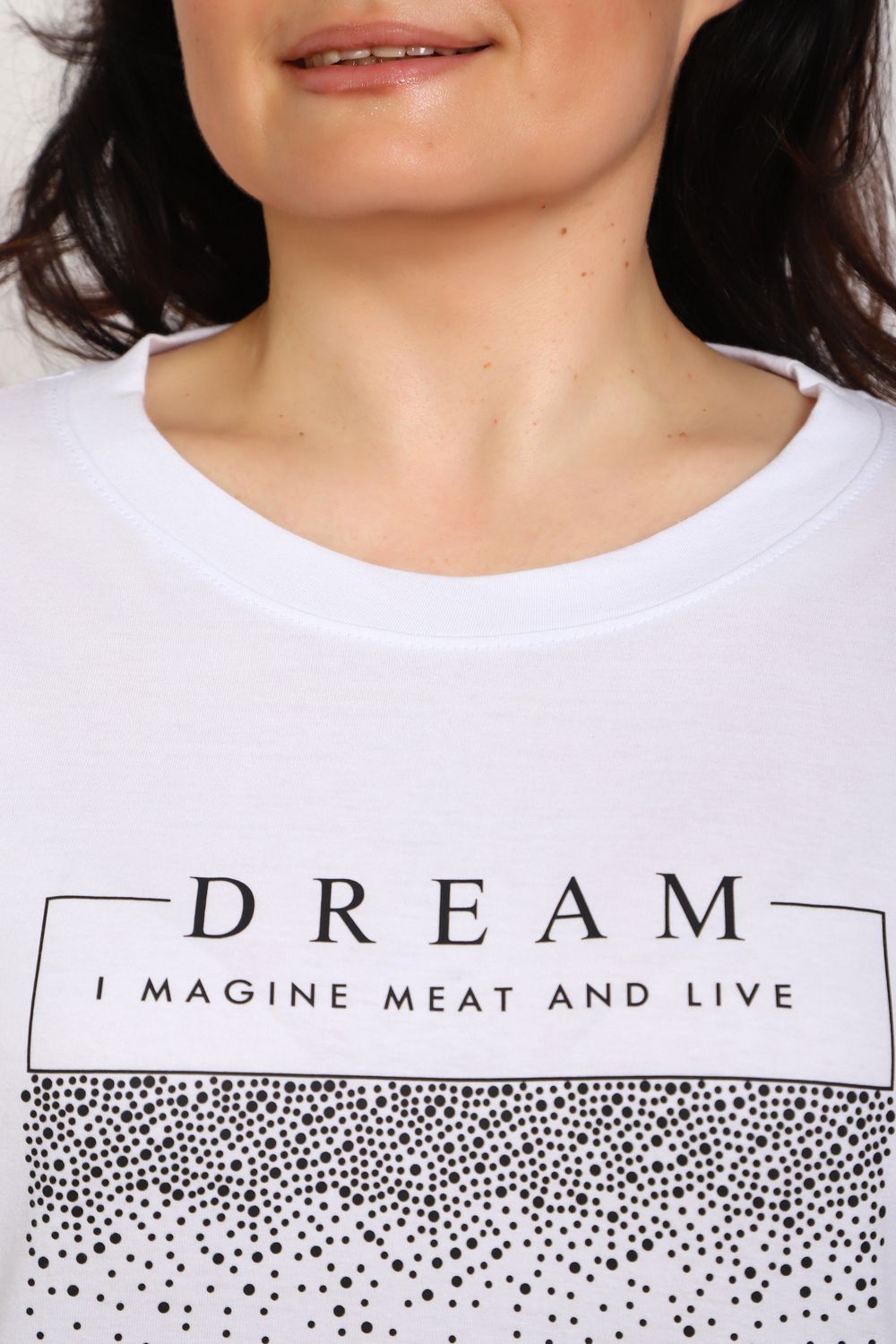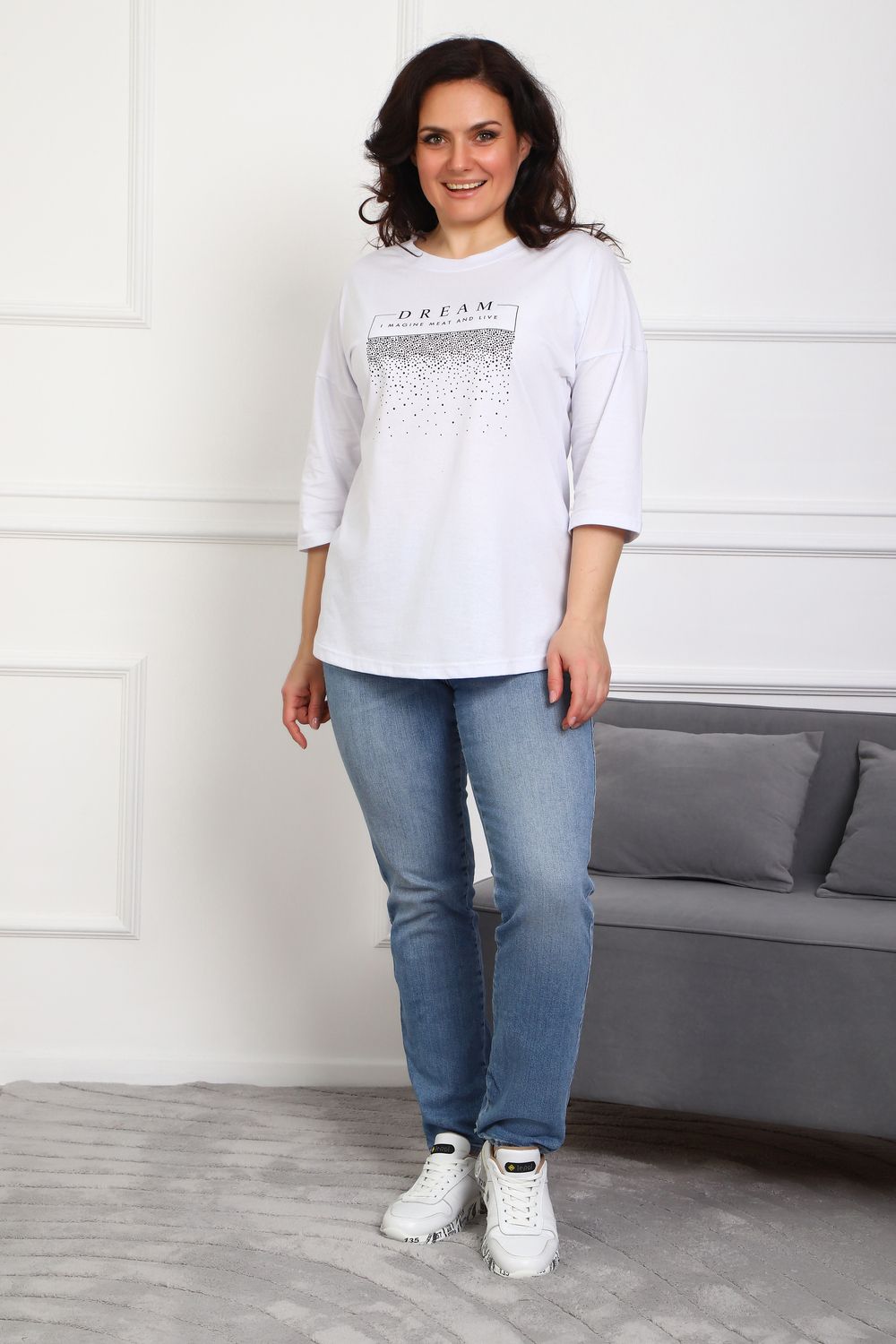 (туника женская дрим) Женская туника из мягкой и приятной к телу кулирки, выполненная из натурального хлопка (100%). Эта модель идеально подчеркнет вашу фигуру благодаря элегантному приталенному силуэту и слегка приспущенной линии плеча. Рукава длиной 3/4 делают образ комфортным и универсальным, а круглый вырез горловины добавляет легкости и нежности общему виду. Особенное внимание привлекает стильный принт на груди, украшенный изящной надписью, создающими романтичное настроение. Свободная посадка обеспечивает комфорт и свободу движений, делая этот предмет гардероба идеальным выбором для повседневных образов и отдыха.