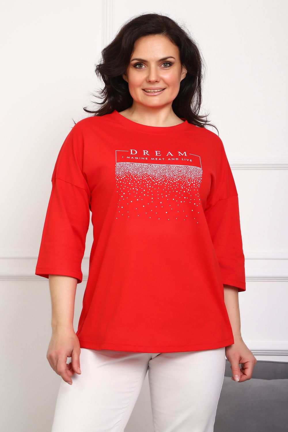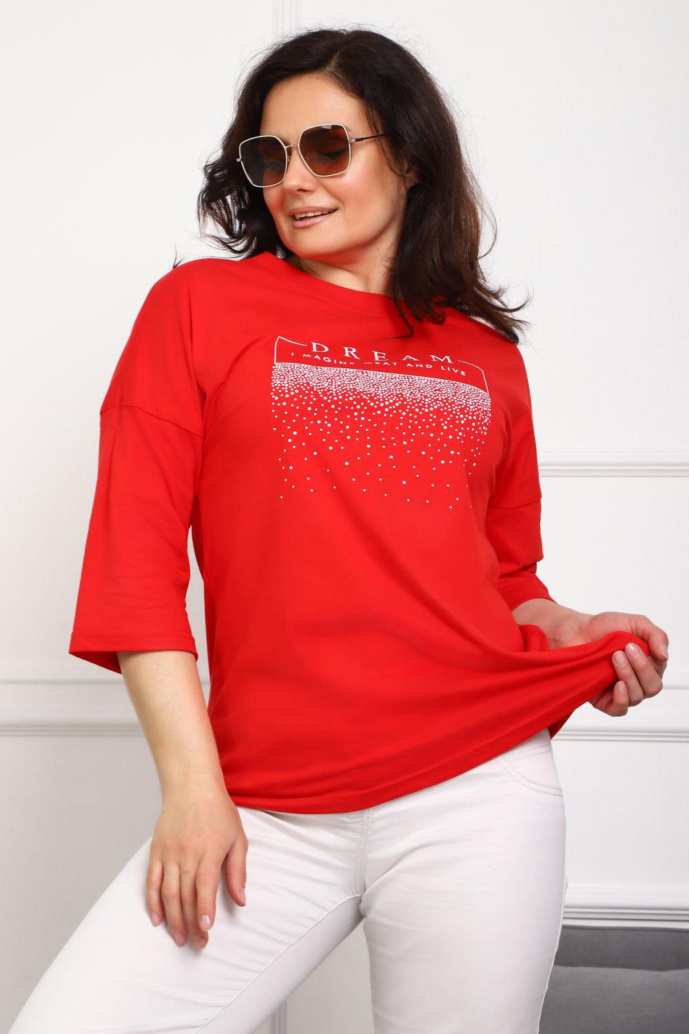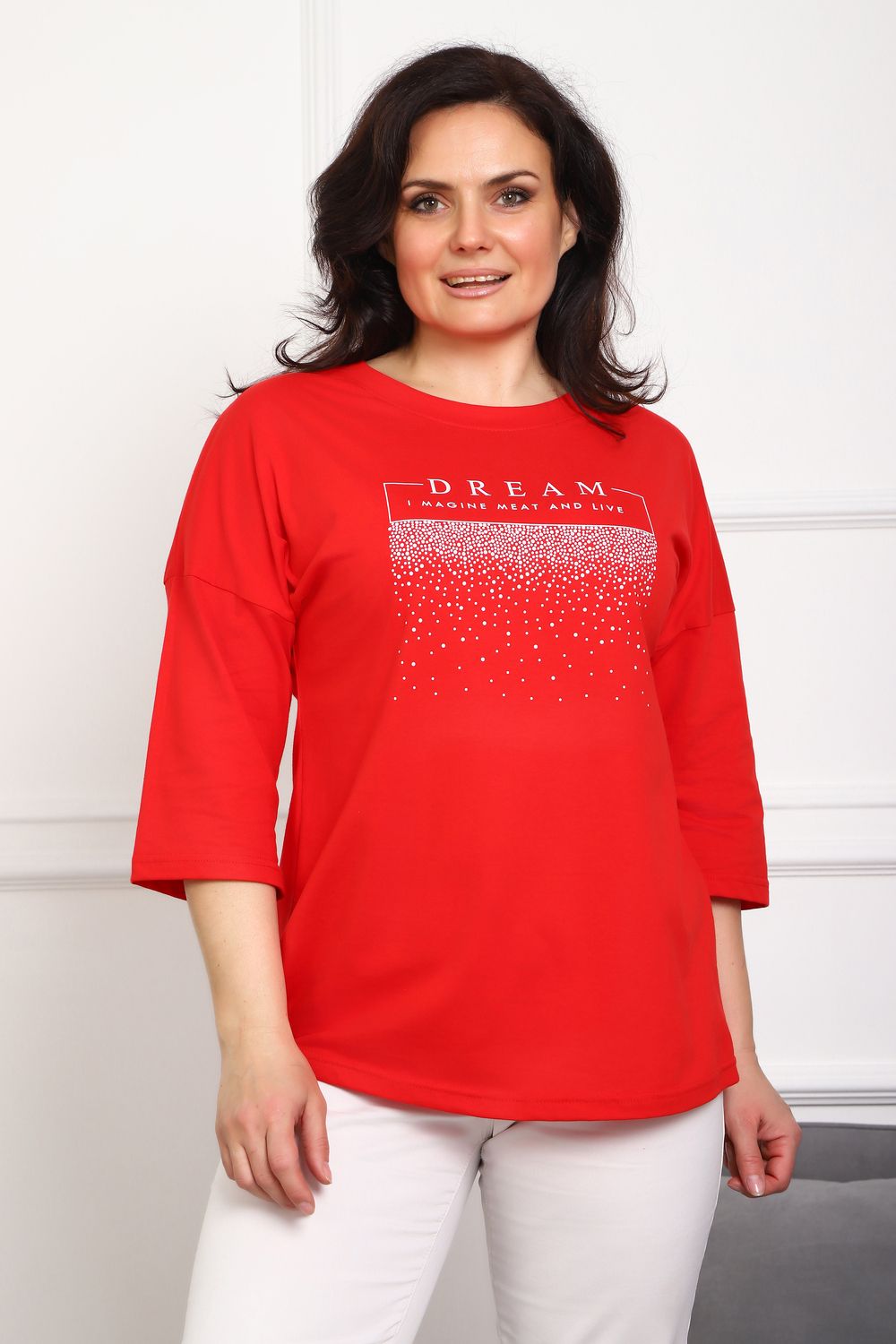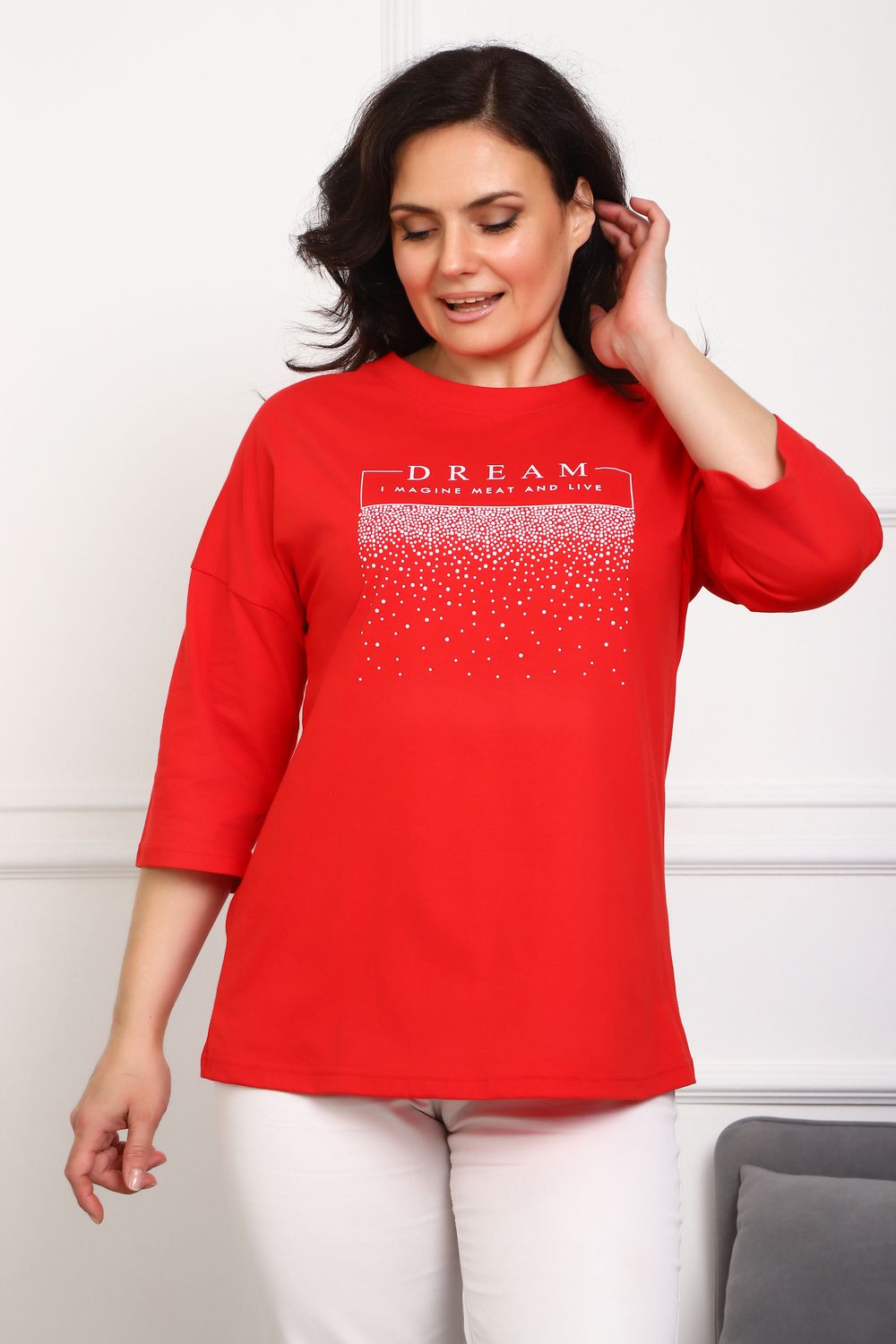 (туника женская дрим) Женская туника из мягкой и приятной к телу кулирки, выполненная из натурального хлопка (100%). Эта модель идеально подчеркнет вашу фигуру благодаря элегантному приталенному силуэту и слегка приспущенной линии плеча. Рукава длиной 3/4 делают образ комфортным и универсальным, а круглый вырез горловины добавляет легкости и нежности общему виду. Особенное внимание привлекает стильный принт на груди, украшенный изящной надписью, создающими романтичное настроение. Свободная посадка обеспечивает комфорт и свободу движений, делая этот предмет гардероба идеальным выбором для повседневных образов и отдыха.