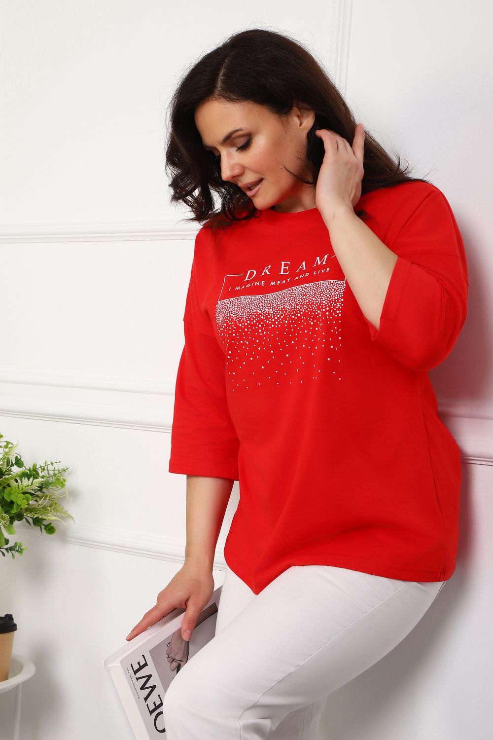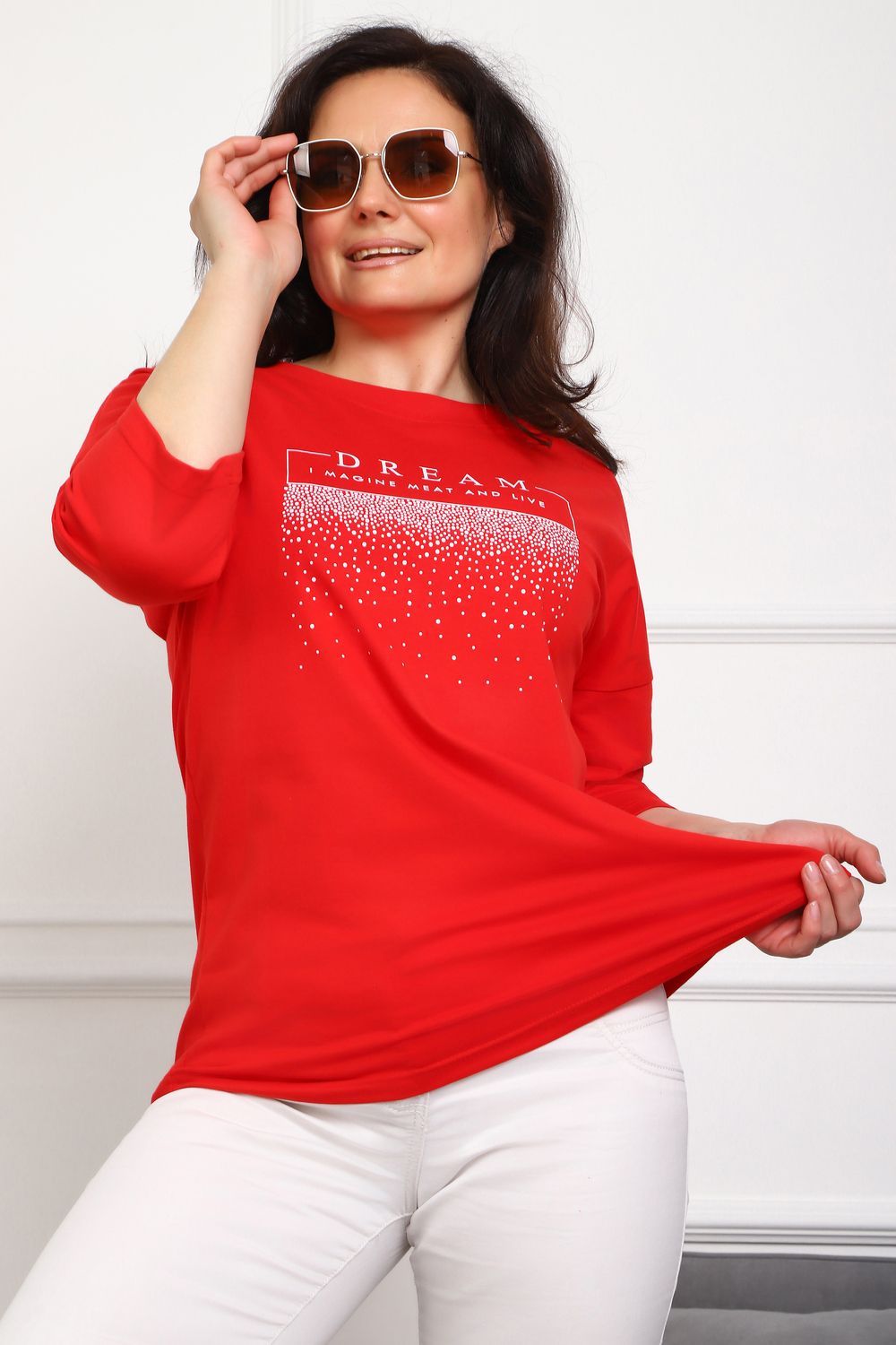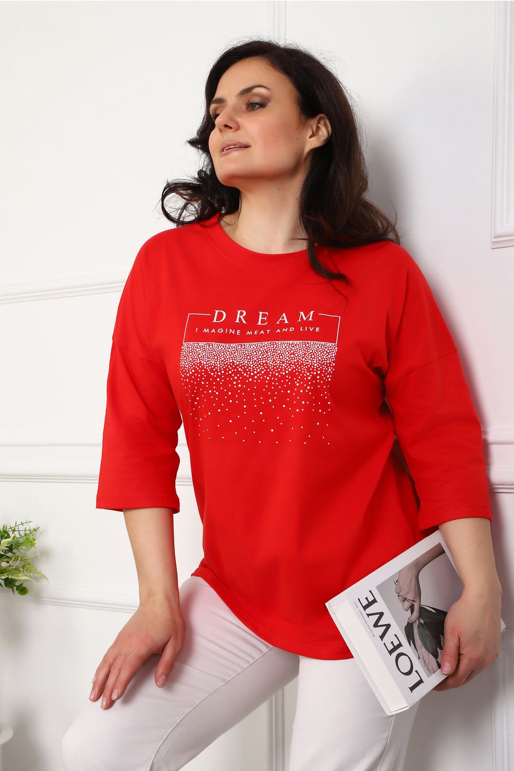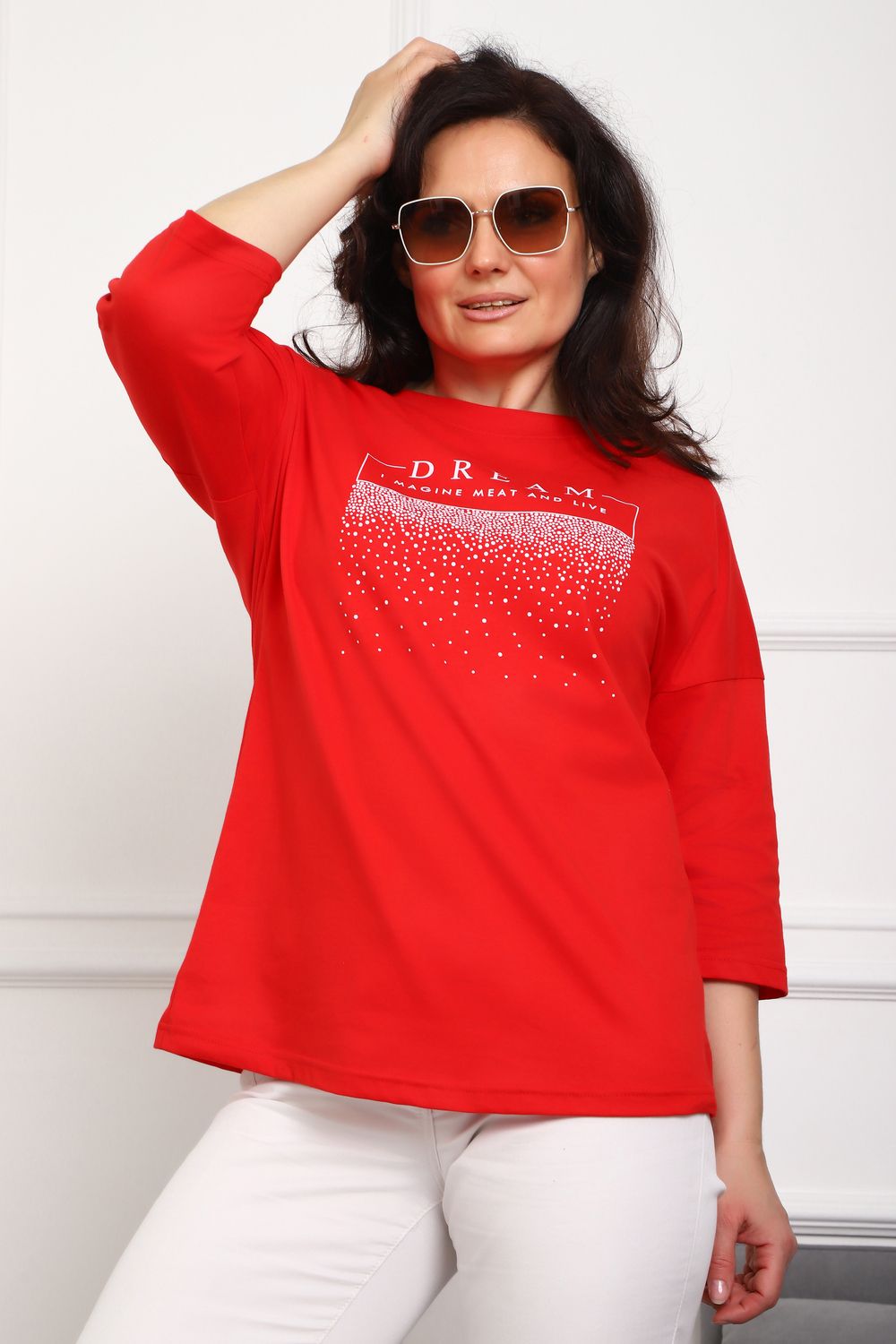 (туника женская дрим) Женская туника из мягкой и приятной к телу кулирки, выполненная из натурального хлопка (100%). Эта модель идеально подчеркнет вашу фигуру благодаря элегантному приталенному силуэту и слегка приспущенной линии плеча. Рукава длиной 3/4 делают образ комфортным и универсальным, а круглый вырез горловины добавляет легкости и нежности общему виду. Особенное внимание привлекает стильный принт на груди, украшенный изящной надписью, создающими романтичное настроение. Свободная посадка обеспечивает комфорт и свободу движений, делая этот предмет гардероба идеальным выбором для повседневных образов и отдыха.