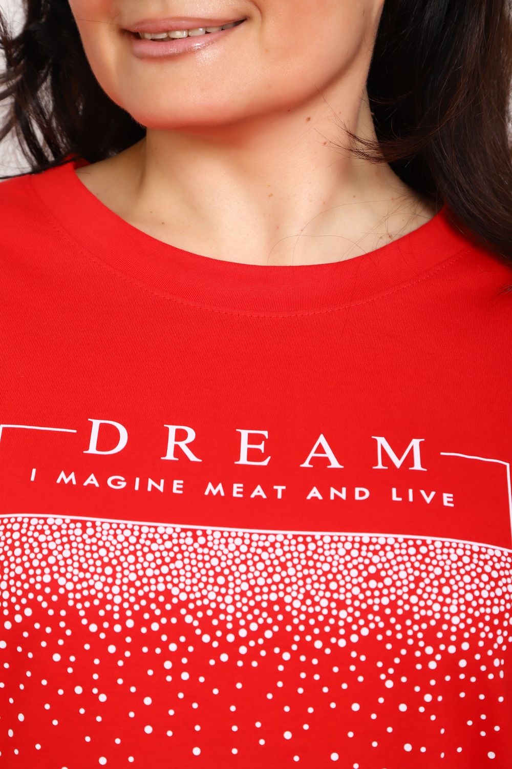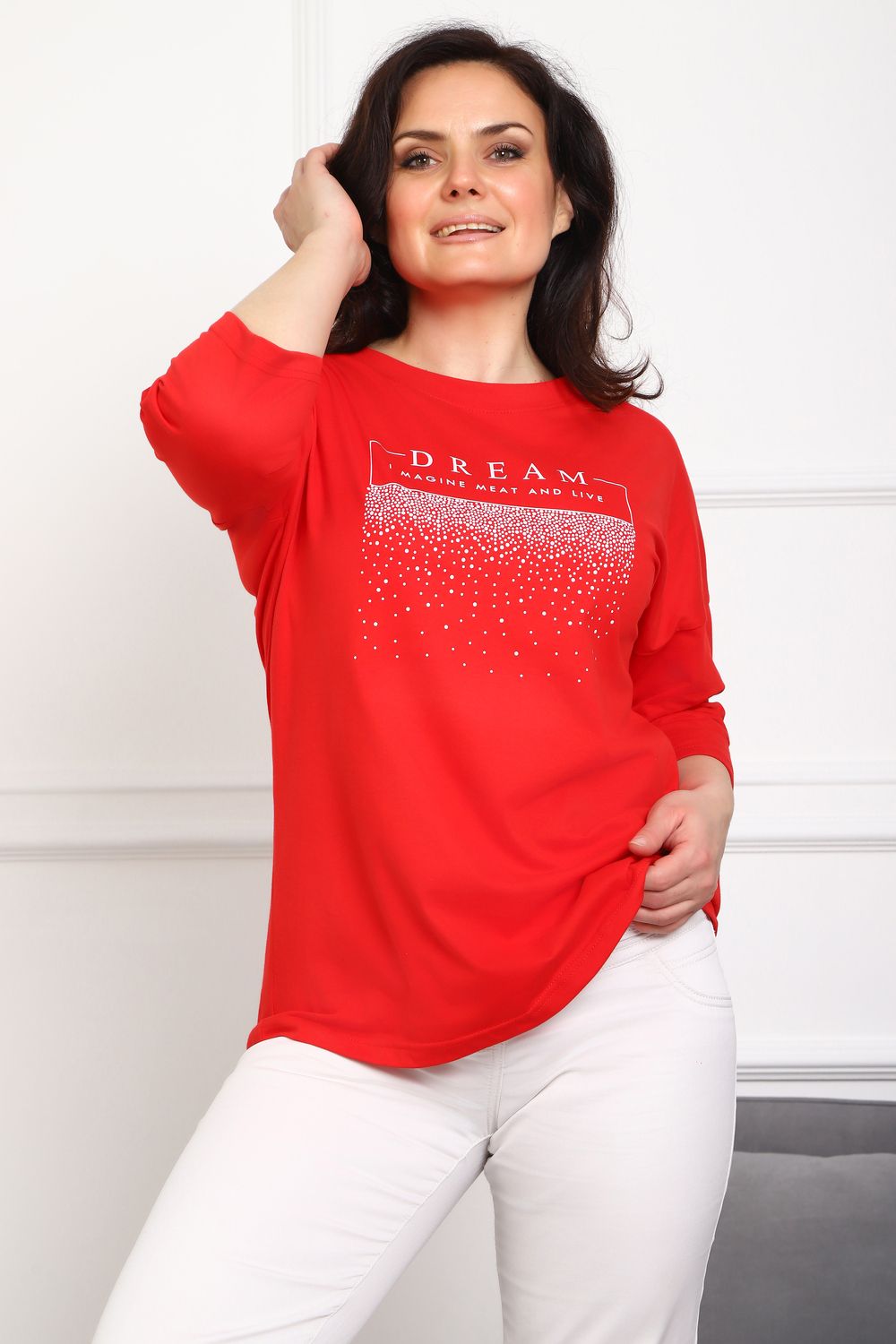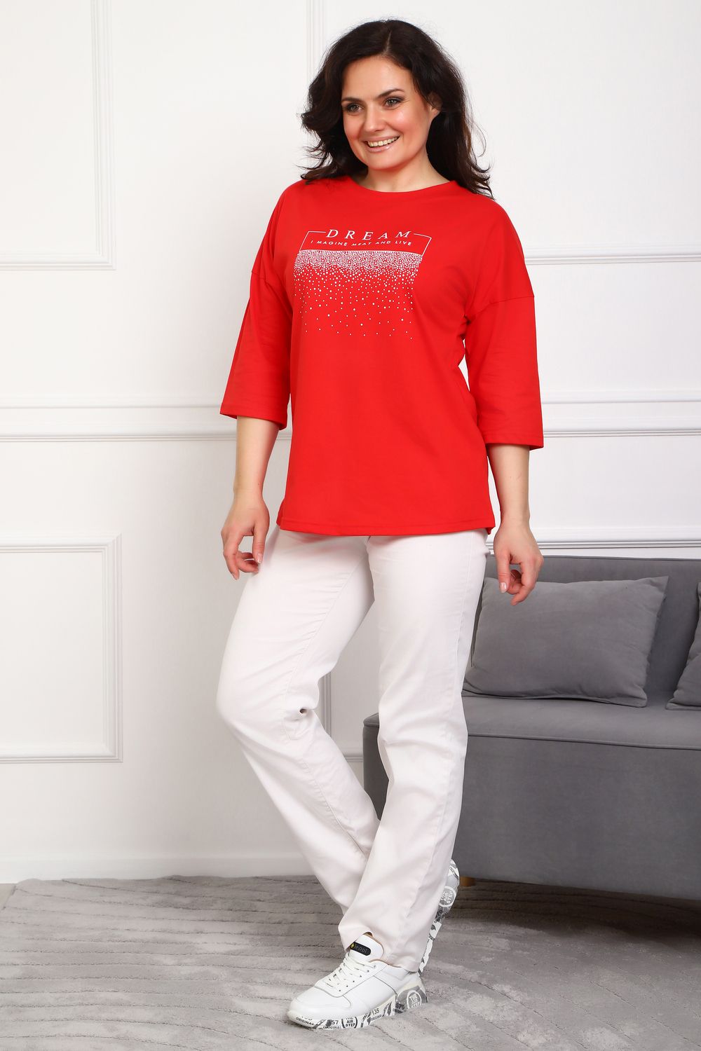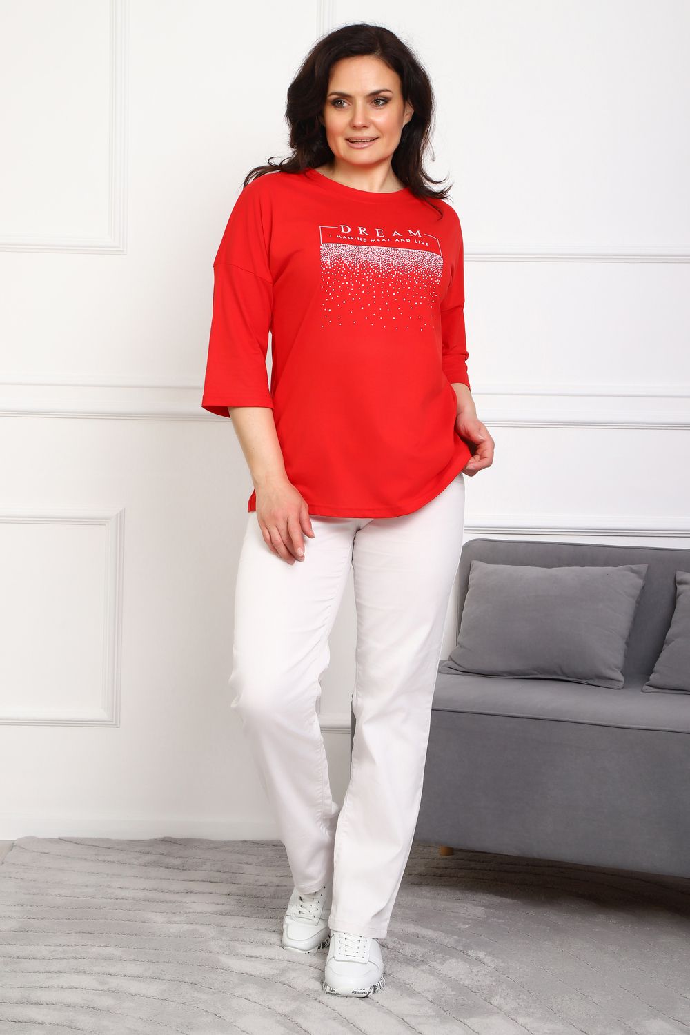 (туника женская дрим) Женская туника из мягкой и приятной к телу кулирки, выполненная из натурального хлопка (100%). Эта модель идеально подчеркнет вашу фигуру благодаря элегантному приталенному силуэту и слегка приспущенной линии плеча. Рукава длиной 3/4 делают образ комфортным и универсальным, а круглый вырез горловины добавляет легкости и нежности общему виду. Особенное внимание привлекает стильный принт на груди, украшенный изящной надписью, создающими романтичное настроение. Свободная посадка обеспечивает комфорт и свободу движений, делая этот предмет гардероба идеальным выбором для повседневных образов и отдыха.