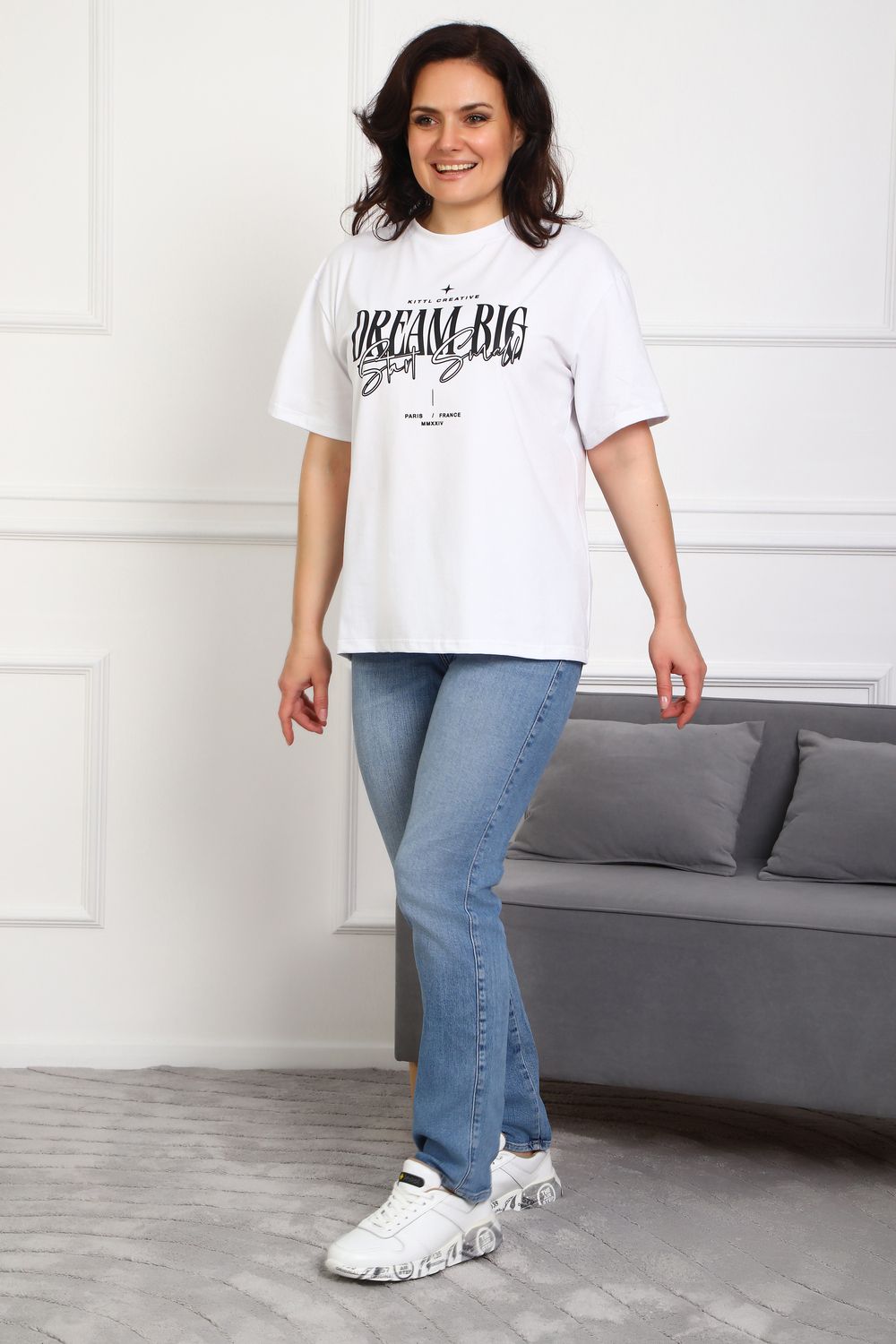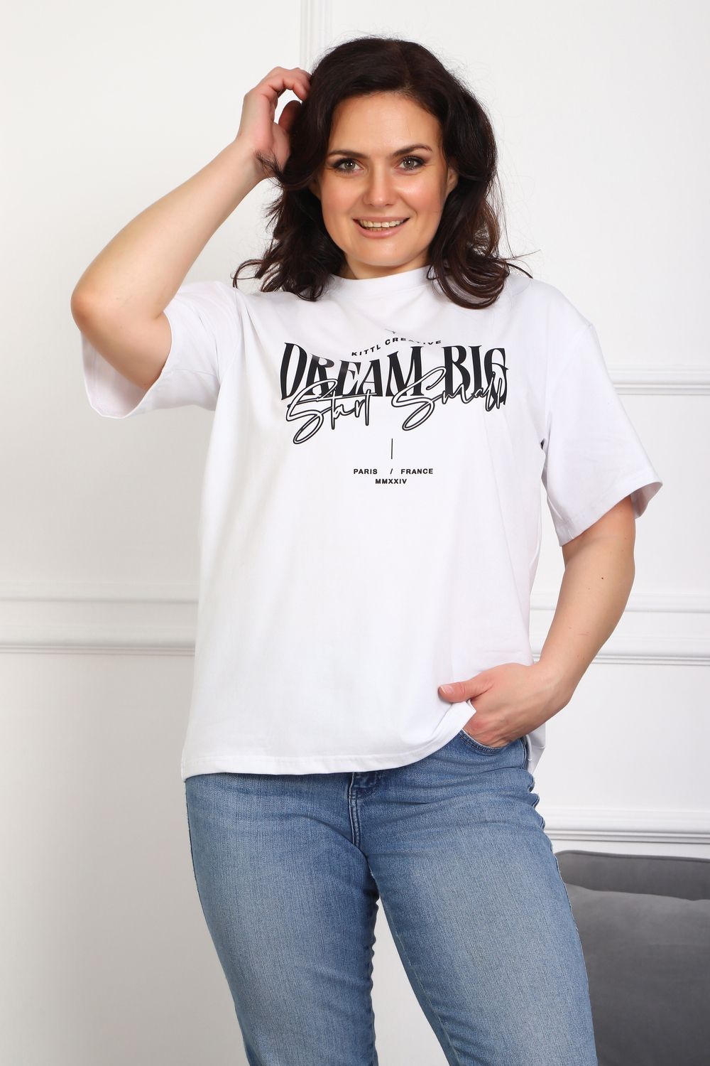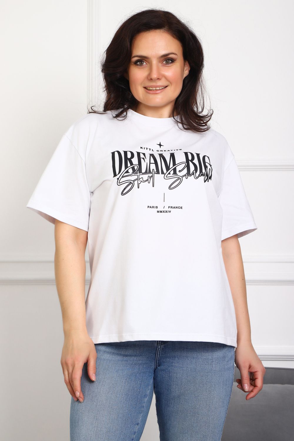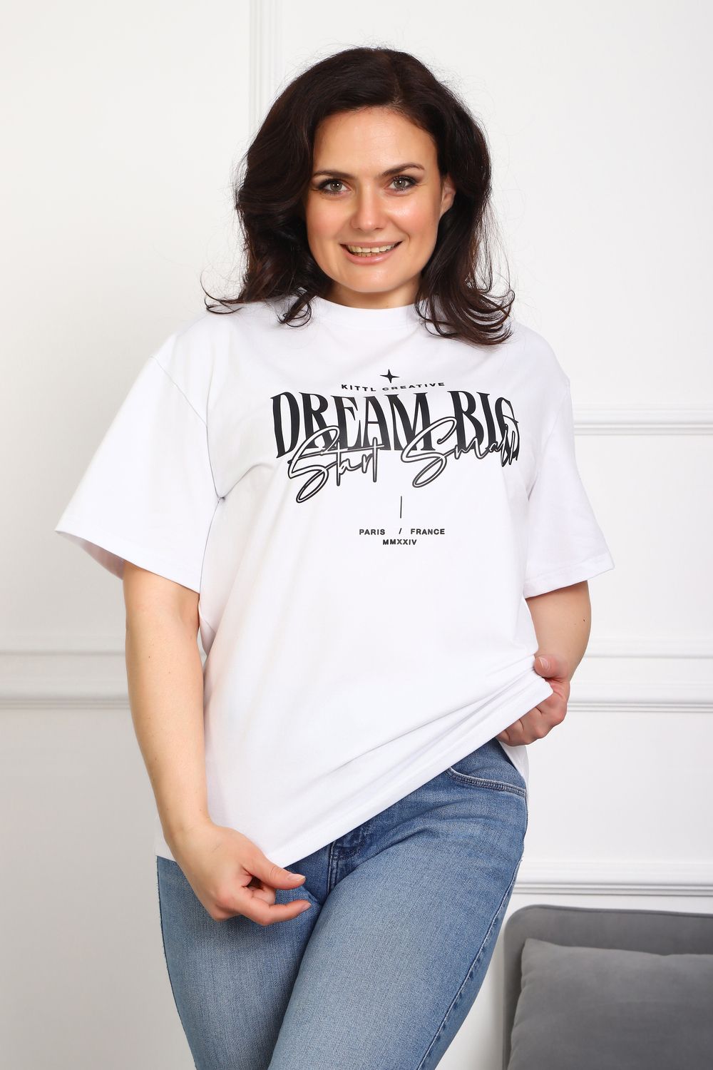(Туника женская DREAM BIG). Женская туника-футболка изготовлена из высококачественной кулирки, состав которой включает 95% хлопка и 5% лайкры, что придает ей мягкость, воздухопроницаемость и небольшую эластичность. Силуэт модели свободен и удобен, прямого кроя, дополненного короткими рукавами и простым, удобным круглым вырезом горловины. Основным декоративным элементом выступает принт на груди с вдохновляющей надписью "Dream Big Start Small", мотивирующий ставить большие цели и двигаться вперед маленькими шагами. Туника предлагается в сдвоенном размере, позволяющем легко подобрать оптимальный вариант для всех типов телосложения и обеспечить максимальную свободу и комфорт в движении. Это идеальное дополнение вашего гардероба для создания стильных и современных образов.