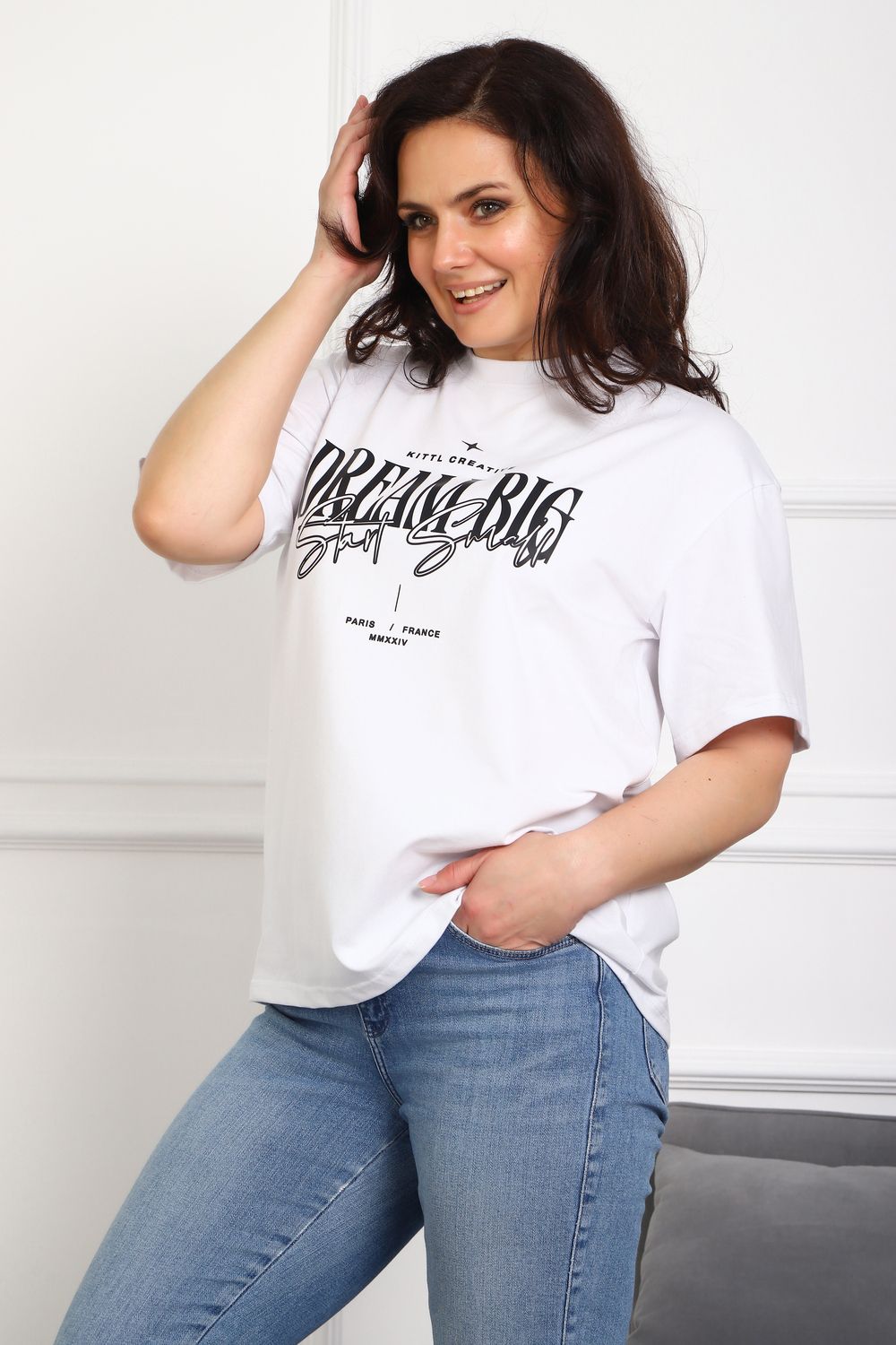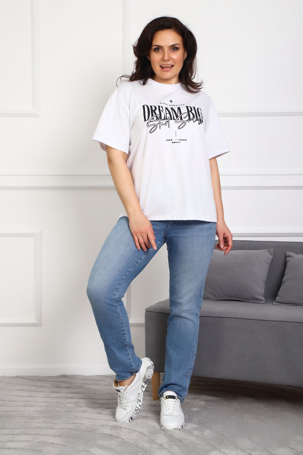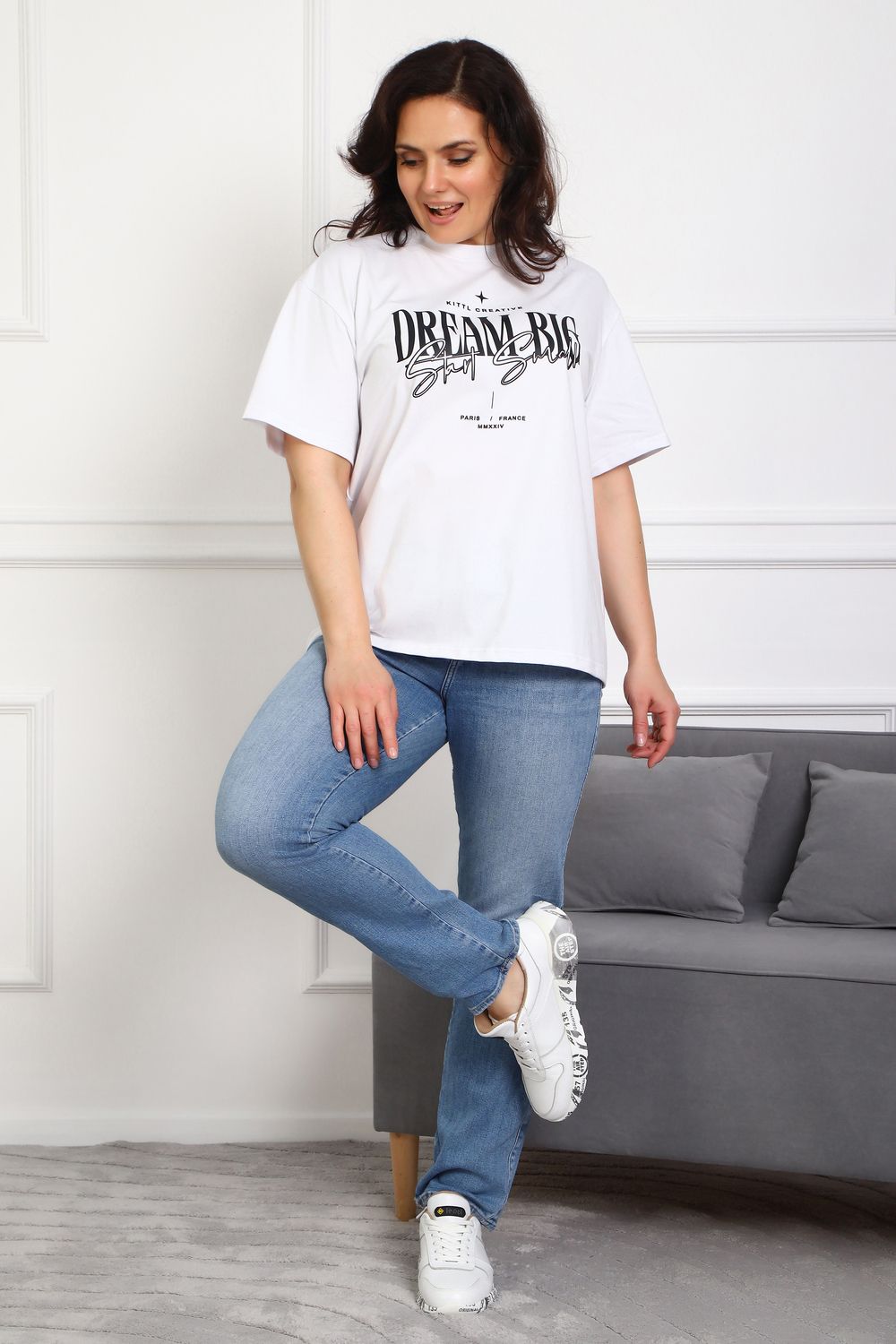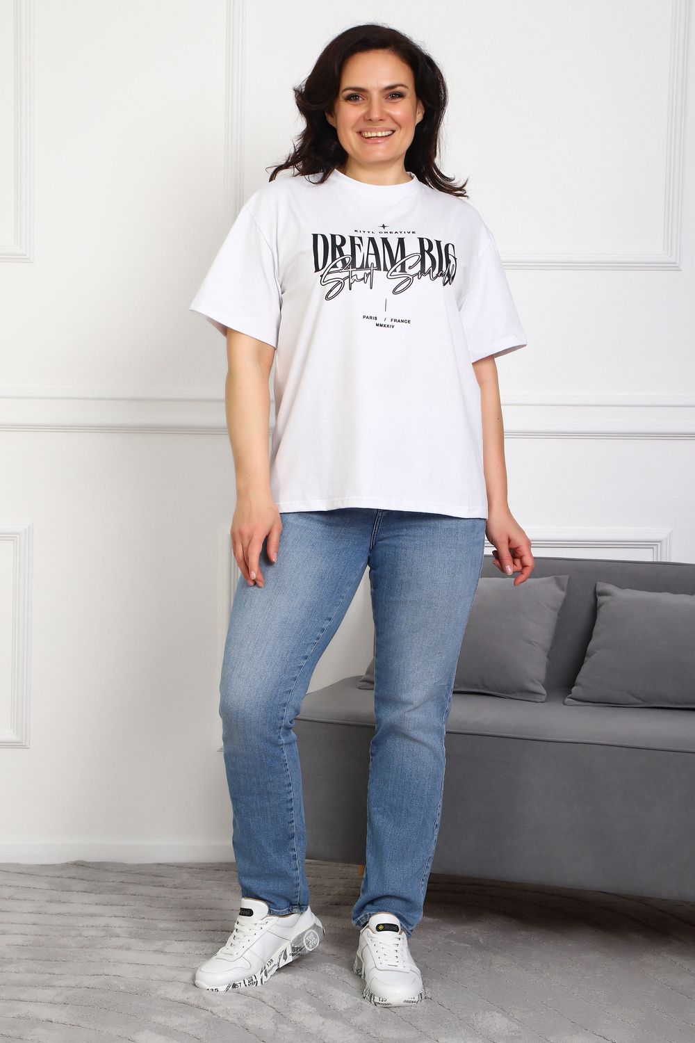 (Туника женская DREAM BIG). Женская туника-футболка изготовлена из высококачественной кулирки, состав которой включает 95% хлопка и 5% лайкры, что придает ей мягкость, воздухопроницаемость и небольшую эластичность. Силуэт модели свободен и удобен, прямого кроя, дополненного короткими рукавами и простым, удобным круглым вырезом горловины. Основным декоративным элементом выступает принт на груди с вдохновляющей надписью "Dream Big Start Small", мотивирующий ставить большие цели и двигаться вперед маленькими шагами. Туника предлагается в сдвоенном размере, позволяющем легко подобрать оптимальный вариант для всех типов телосложения и обеспечить максимальную свободу и комфорт в движении. Это идеальное дополнение вашего гардероба для создания стильных и современных образов.