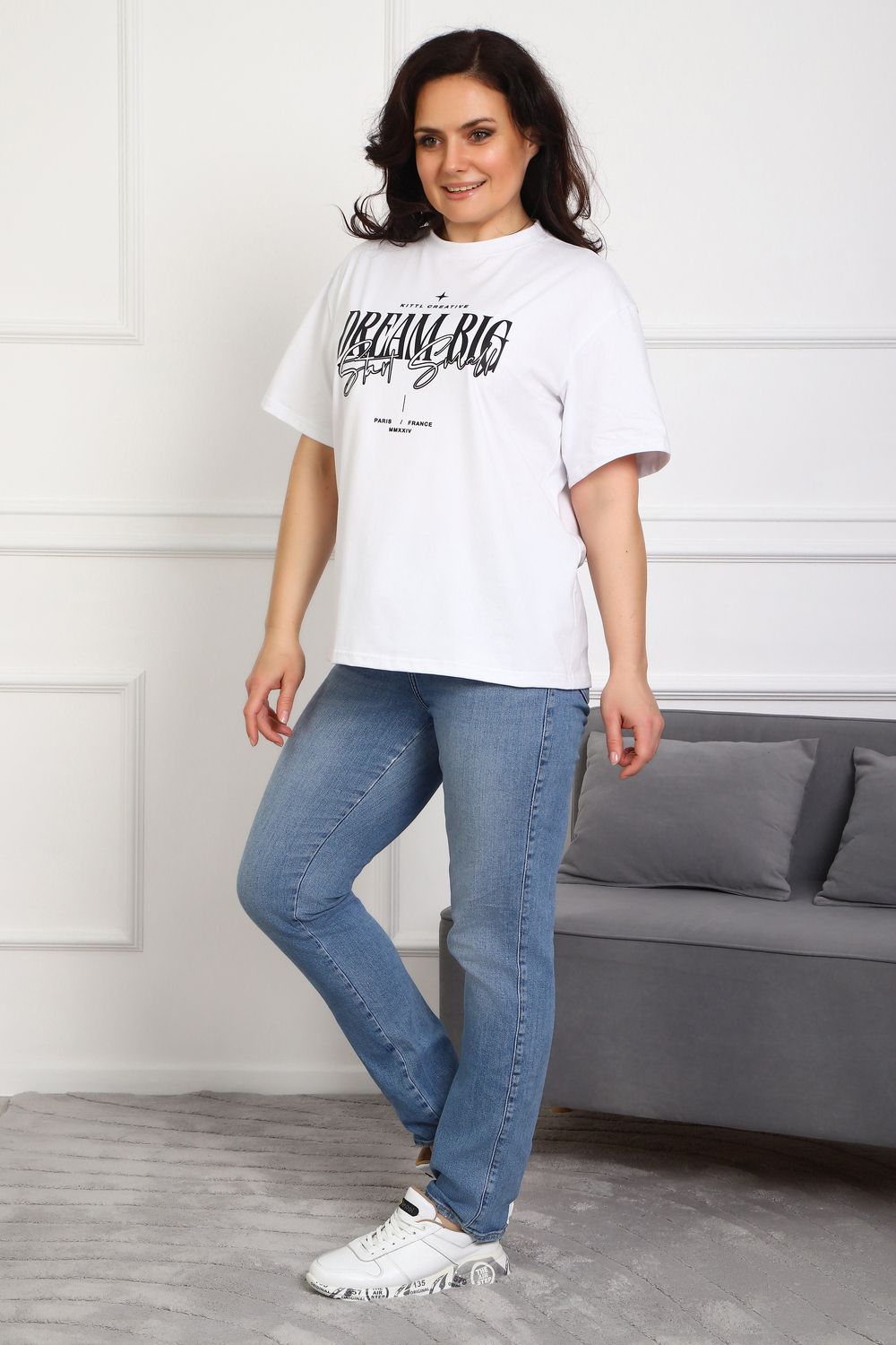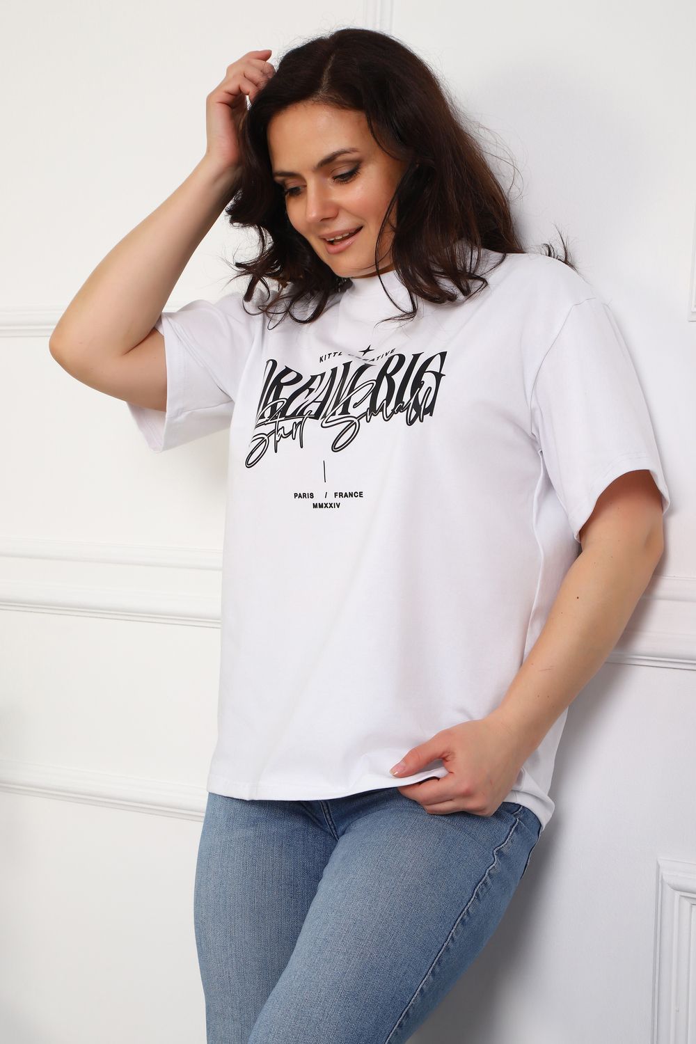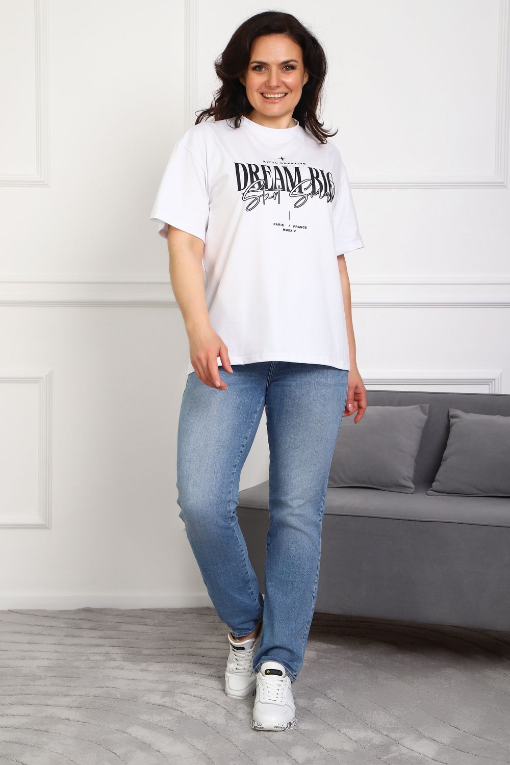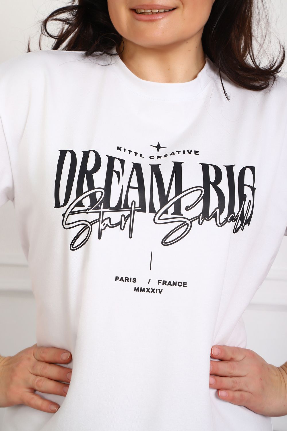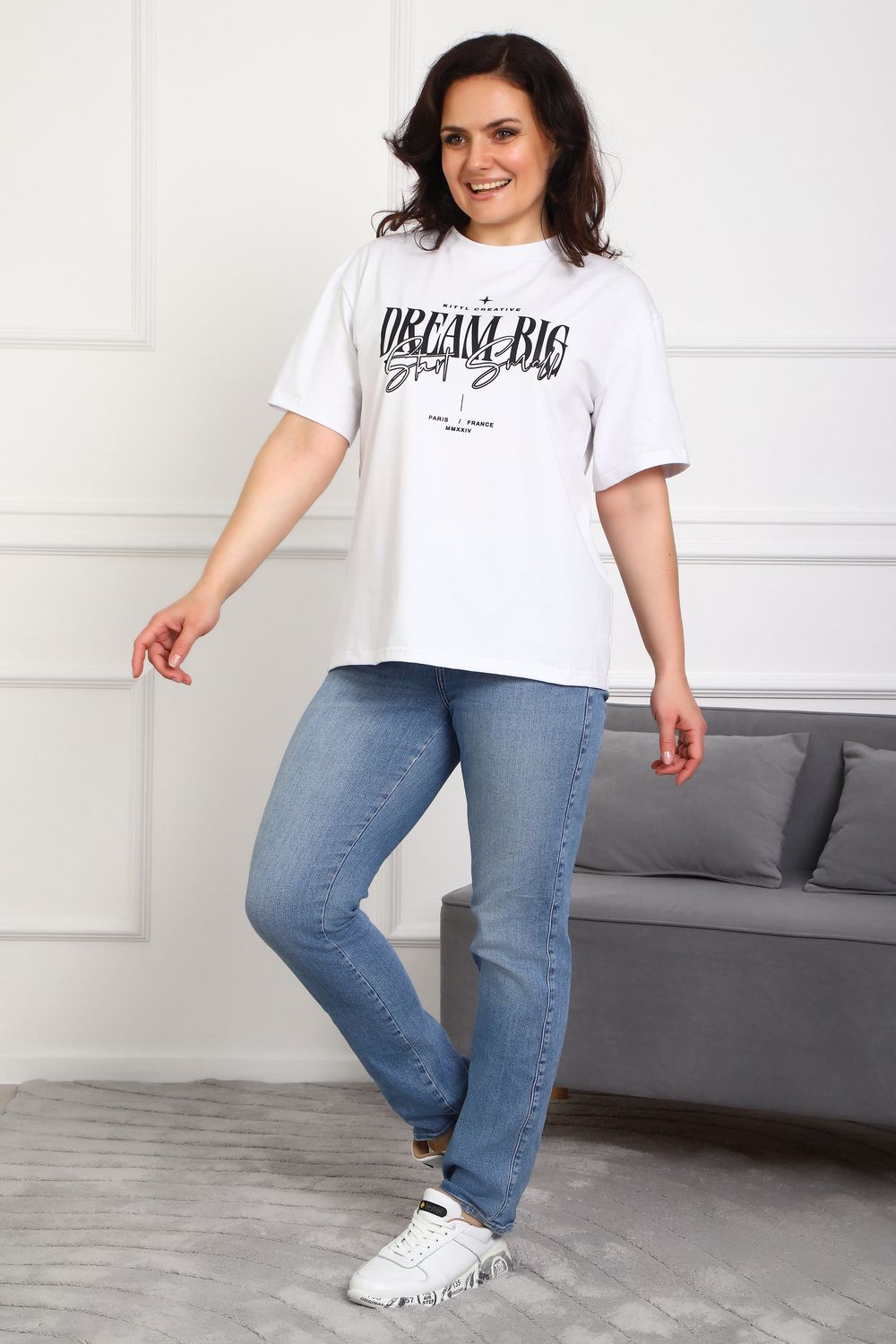 (Туника женская DREAM BIG). Женская туника-футболка изготовлена из высококачественной кулирки, состав которой включает 95% хлопка и 5% лайкры, что придает ей мягкость, воздухопроницаемость и небольшую эластичность. Силуэт модели свободен и удобен, прямого кроя, дополненного короткими рукавами и простым, удобным круглым вырезом горловины. Основным декоративным элементом выступает принт на груди с вдохновляющей надписью "Dream Big Start Small", мотивирующий ставить большие цели и двигаться вперед маленькими шагами. Туника предлагается в сдвоенном размере, позволяющем легко подобрать оптимальный вариант для всех типов телосложения и обеспечить максимальную свободу и комфорт в движении. Это идеальное дополнение вашего гардероба для создания стильных и современных образов.