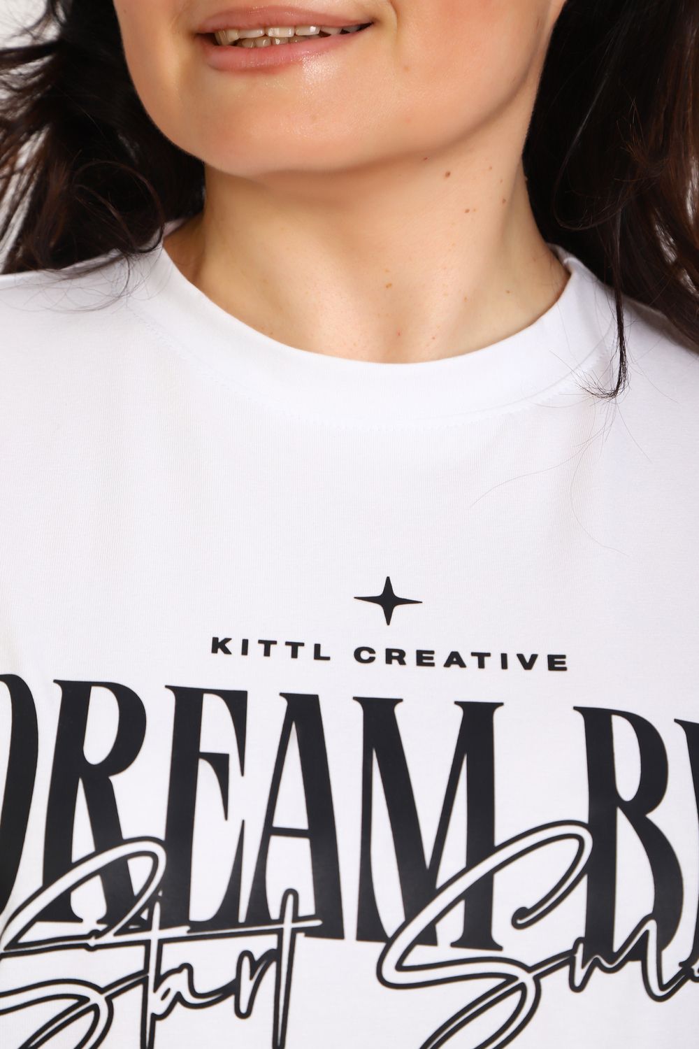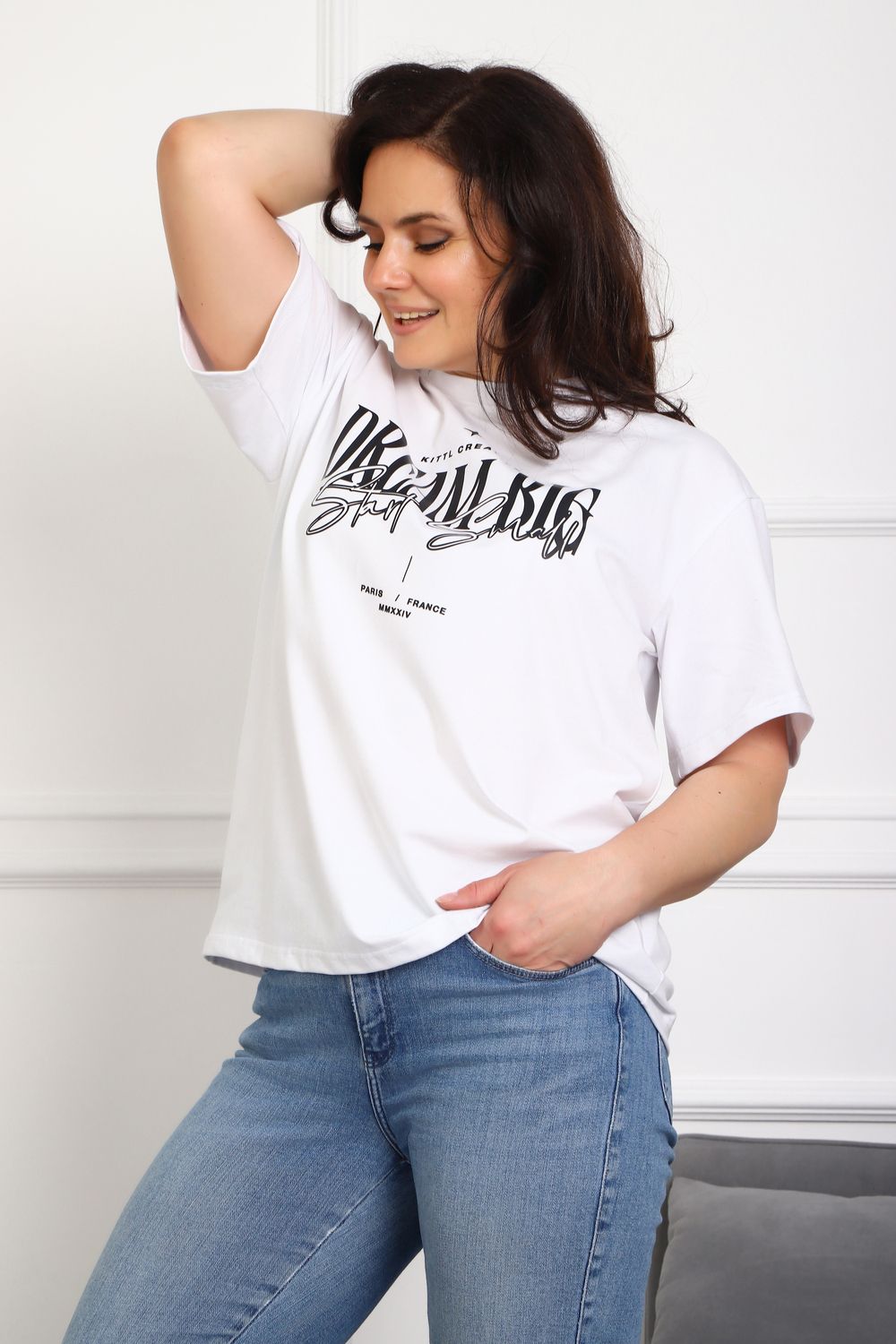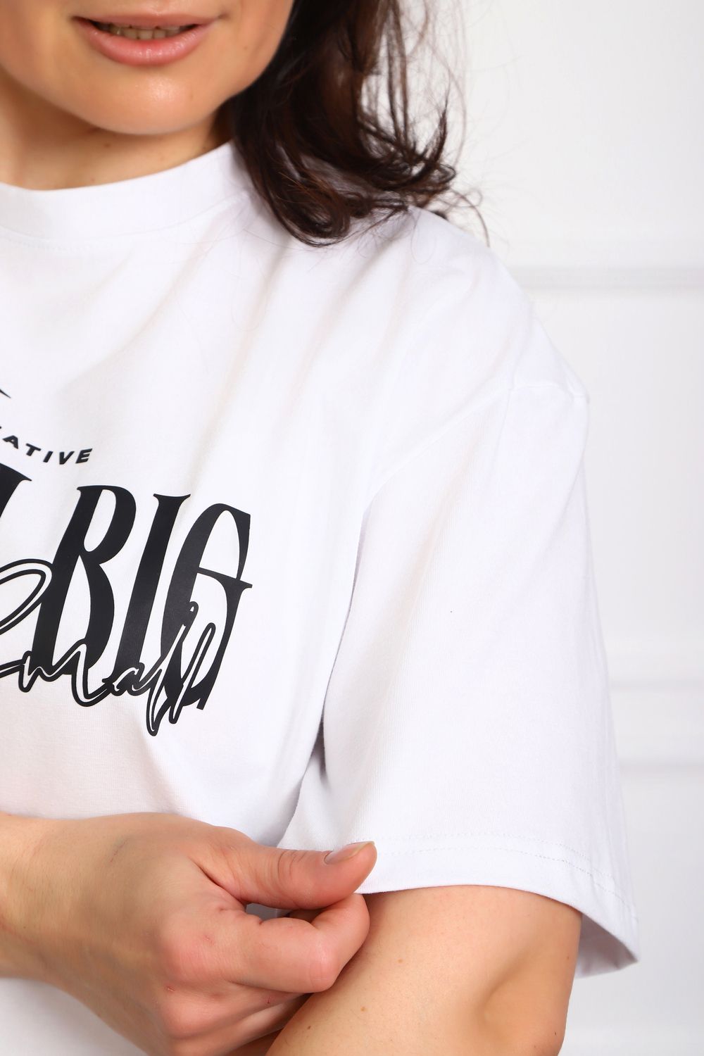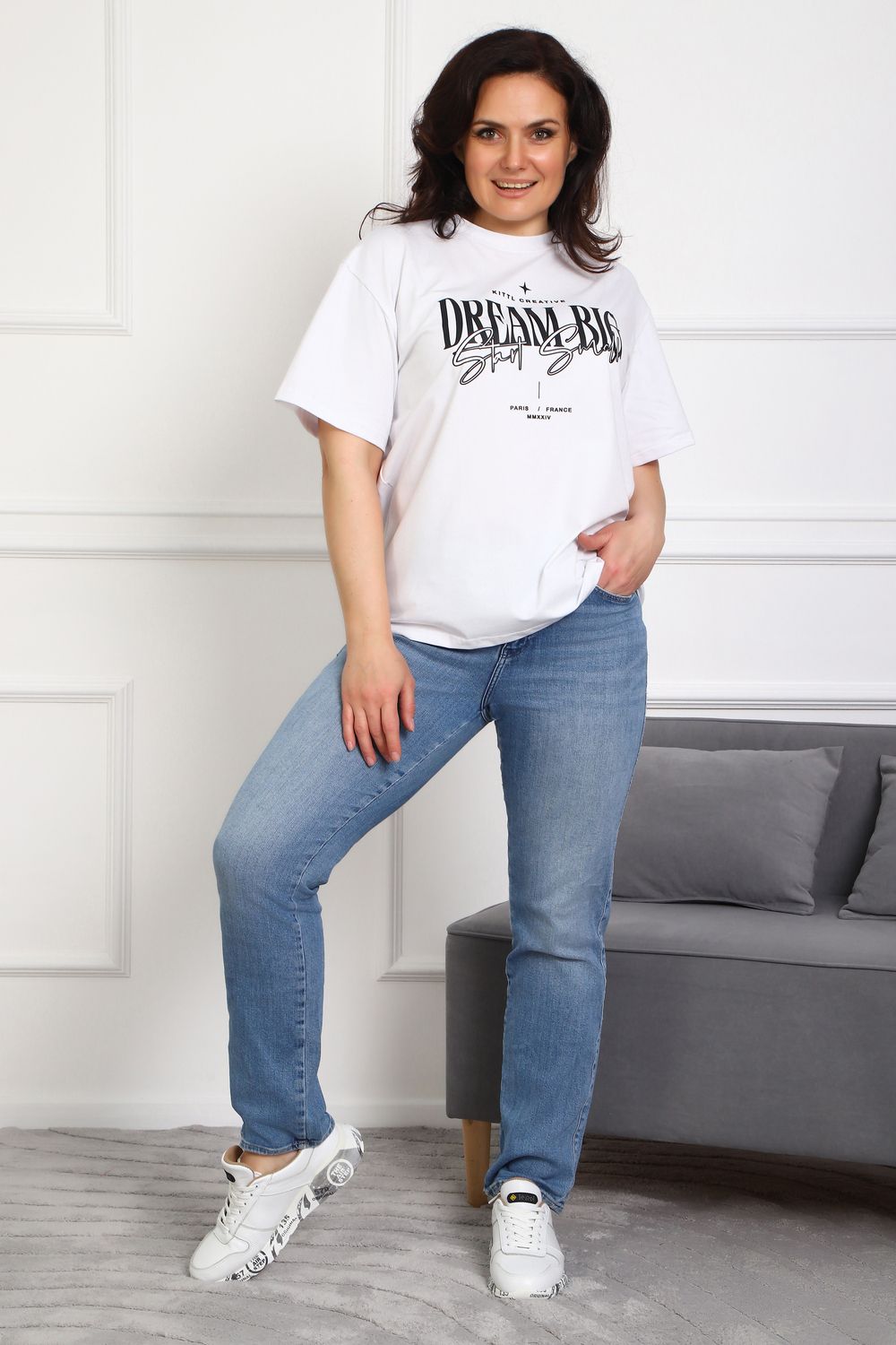 (Туника женская DREAM BIG). Женская туника-футболка изготовлена из высококачественной кулирки, состав которой включает 95% хлопка и 5% лайкры, что придает ей мягкость, воздухопроницаемость и небольшую эластичность. Силуэт модели свободен и удобен, прямого кроя, дополненного короткими рукавами и простым, удобным круглым вырезом горловины. Основным декоративным элементом выступает принт на груди с вдохновляющей надписью "Dream Big Start Small", мотивирующий ставить большие цели и двигаться вперед маленькими шагами. Туника предлагается в сдвоенном размере, позволяющем легко подобрать оптимальный вариант для всех типов телосложения и обеспечить максимальную свободу и комфорт в движении. Это идеальное дополнение вашего гардероба для создания стильных и современных образов.