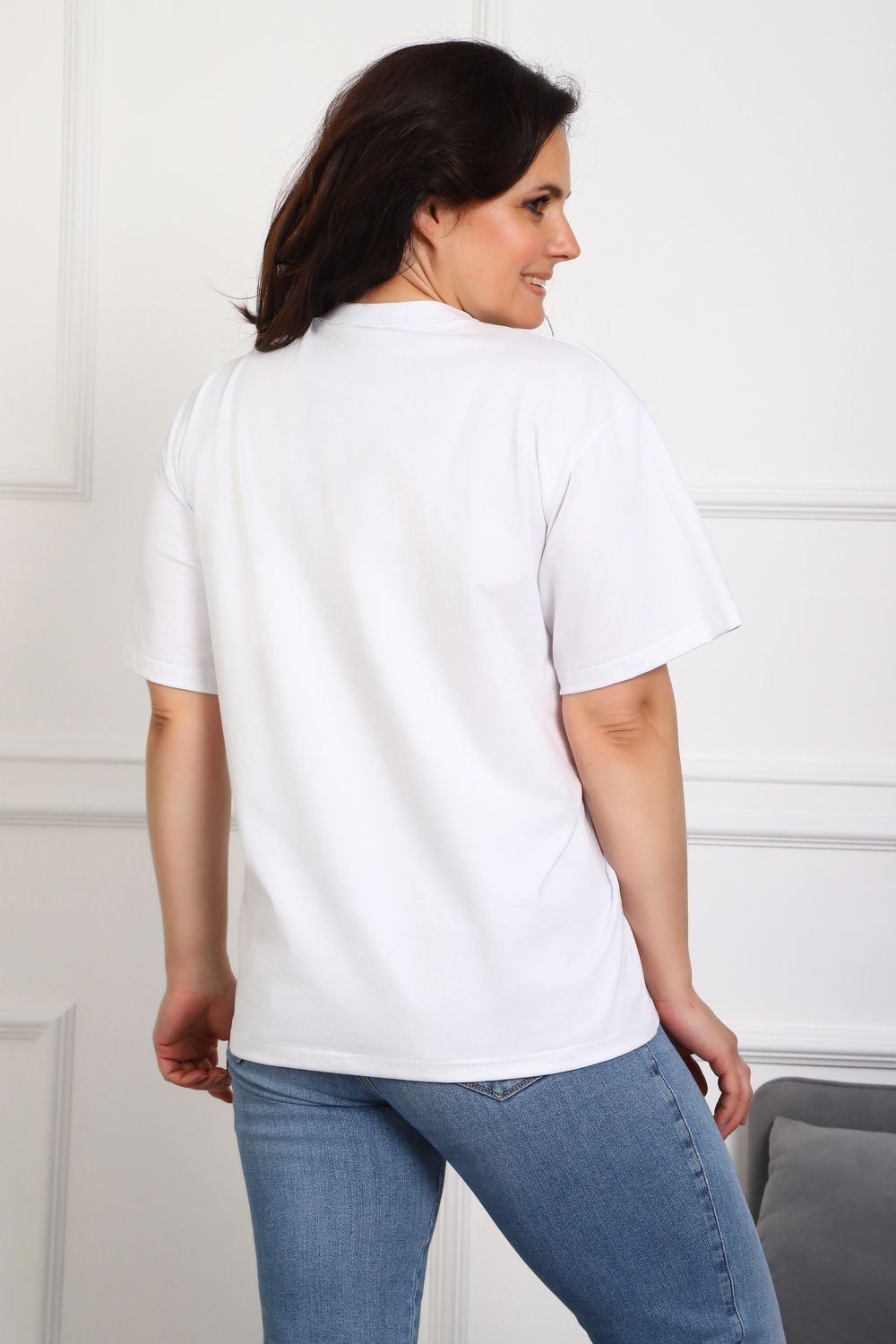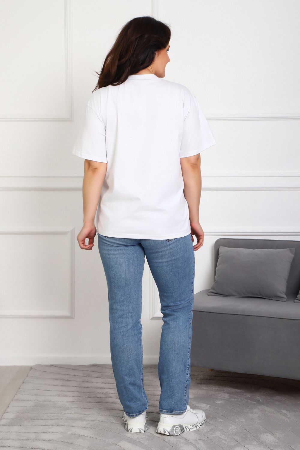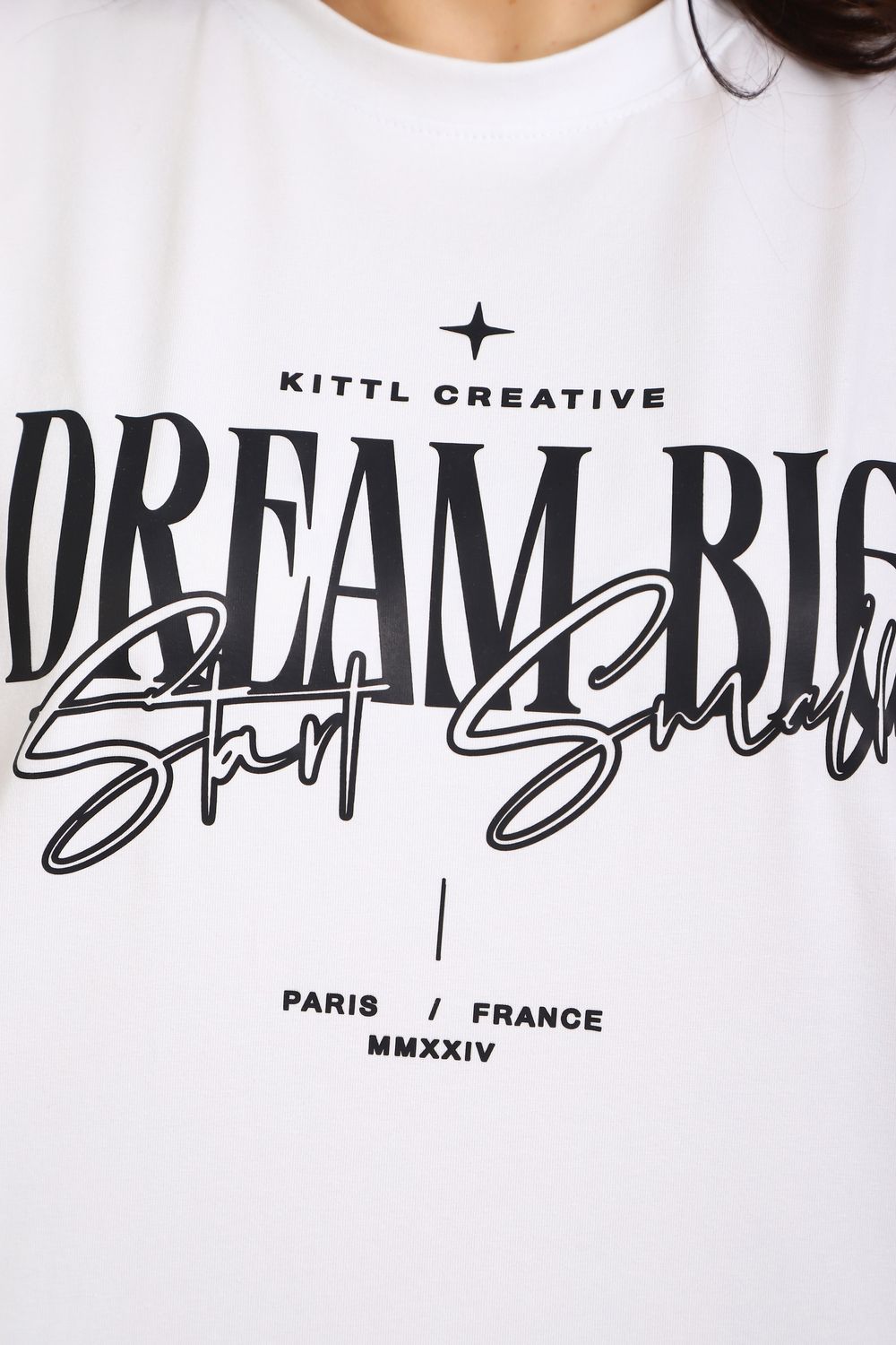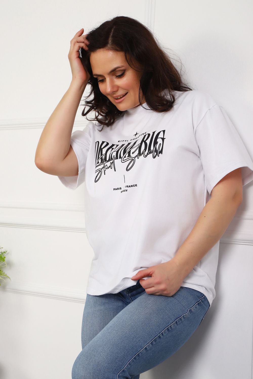 (Туника женская DREAM BIG). Женская туника-футболка изготовлена из высококачественной кулирки, состав которой включает 95% хлопка и 5% лайкры, что придает ей мягкость, воздухопроницаемость и небольшую эластичность. Силуэт модели свободен и удобен, прямого кроя, дополненного короткими рукавами и простым, удобным круглым вырезом горловины. Основным декоративным элементом выступает принт на груди с вдохновляющей надписью "Dream Big Start Small", мотивирующий ставить большие цели и двигаться вперед маленькими шагами. Туника предлагается в сдвоенном размере, позволяющем легко подобрать оптимальный вариант для всех типов телосложения и обеспечить максимальную свободу и комфорт в движении. Это идеальное дополнение вашего гардероба для создания стильных и современных образов.