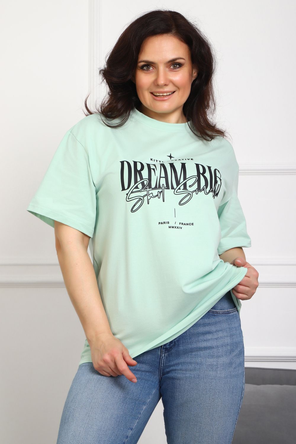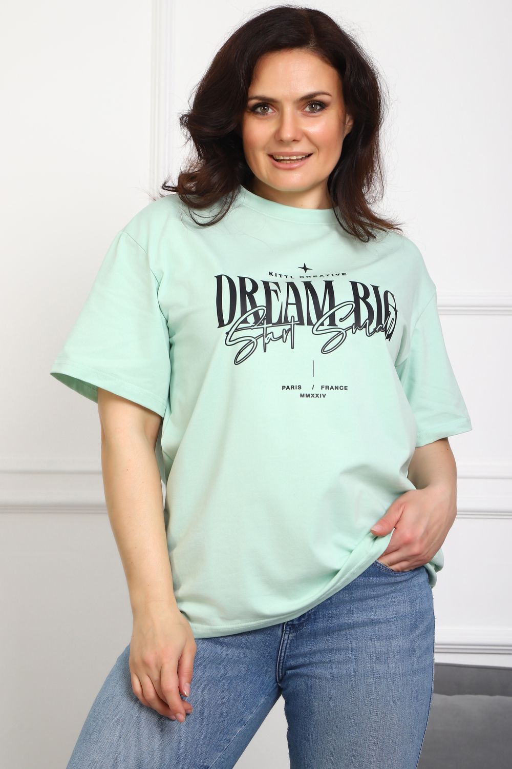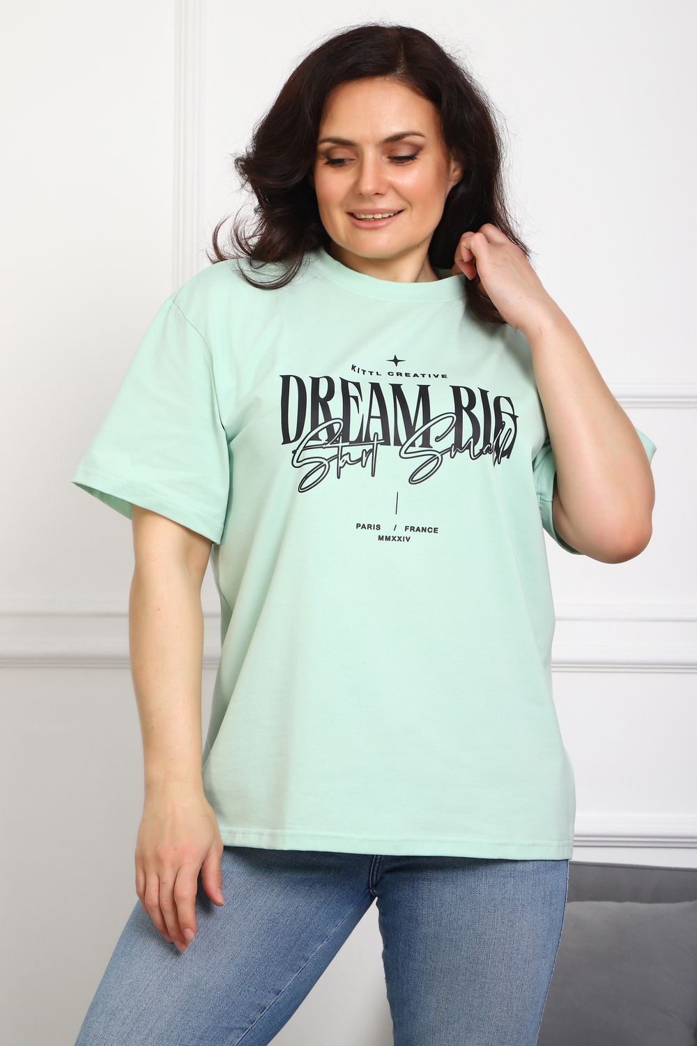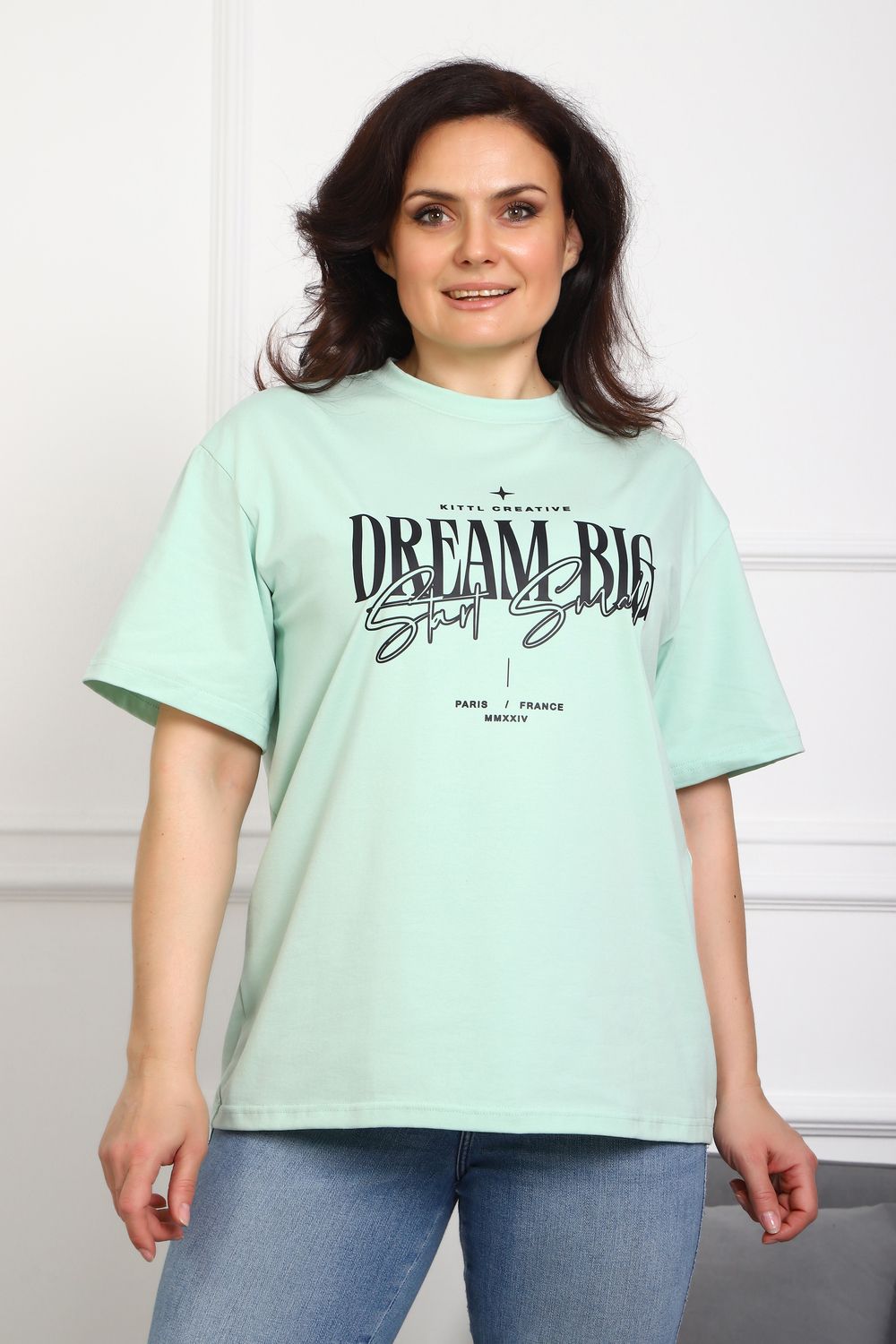 (Туника женская DREAM BIG). Женская туника-футболка изготовлена из высококачественной кулирки, состав которой включает 95% хлопка и 5% лайкры, что придает ей мягкость, воздухопроницаемость и небольшую эластичность. Силуэт модели свободен и удобен, прямого кроя, дополненного короткими рукавами и простым, удобным круглым вырезом горловины. Основным декоративным элементом выступает принт на груди с вдохновляющей надписью "Dream Big Start Small", мотивирующий ставить большие цели и двигаться вперед маленькими шагами. Туника предлагается в сдвоенном размере, позволяющем легко подобрать оптимальный вариант для всех типов телосложения и обеспечить максимальную свободу и комфорт в движении. Это идеальное дополнение вашего гардероба для создания стильных и современных образов.