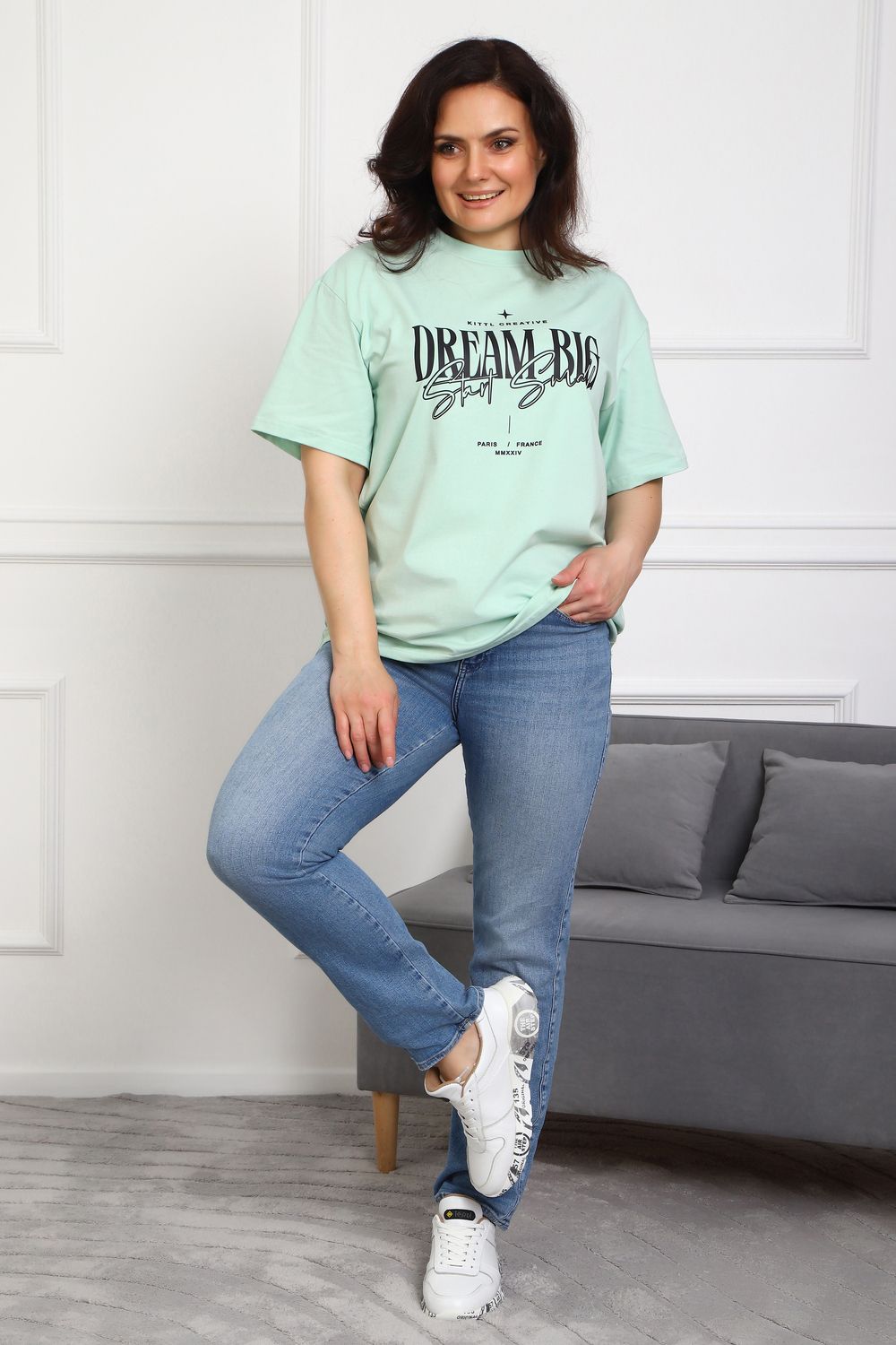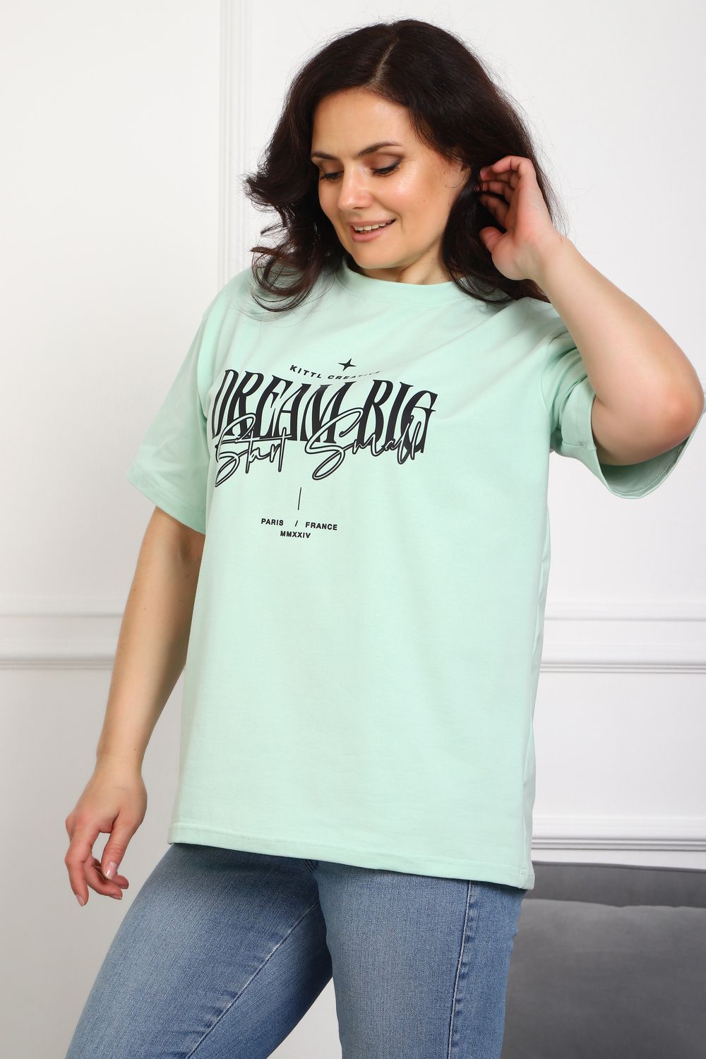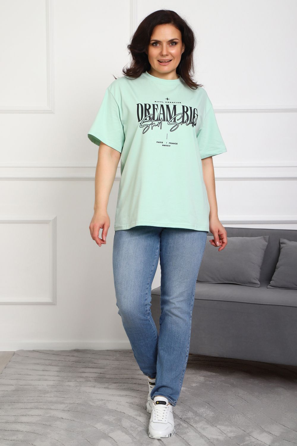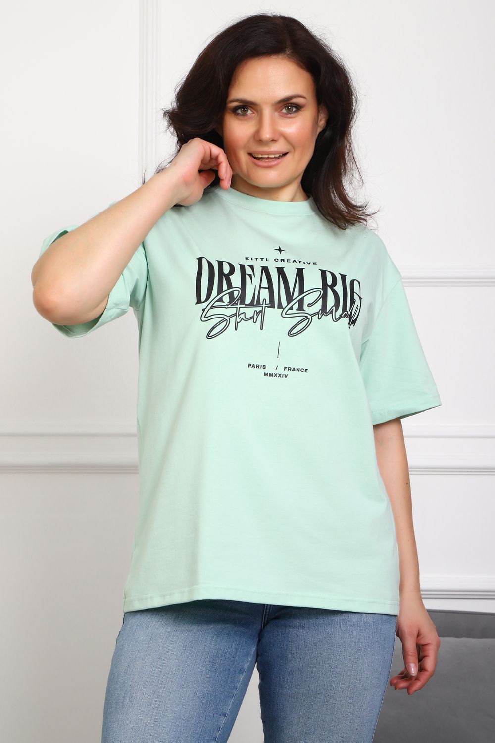 (Туника женская DREAM BIG). Женская туника-футболка изготовлена из высококачественной кулирки, состав которой включает 95% хлопка и 5% лайкры, что придает ей мягкость, воздухопроницаемость и небольшую эластичность. Силуэт модели свободен и удобен, прямого кроя, дополненного короткими рукавами и простым, удобным круглым вырезом горловины. Основным декоративным элементом выступает принт на груди с вдохновляющей надписью "Dream Big Start Small", мотивирующий ставить большие цели и двигаться вперед маленькими шагами. Туника предлагается в сдвоенном размере, позволяющем легко подобрать оптимальный вариант для всех типов телосложения и обеспечить максимальную свободу и комфорт в движении. Это идеальное дополнение вашего гардероба для создания стильных и современных образов.