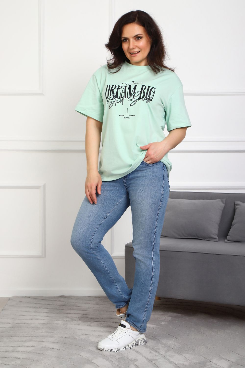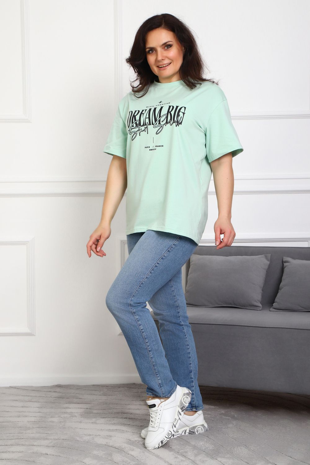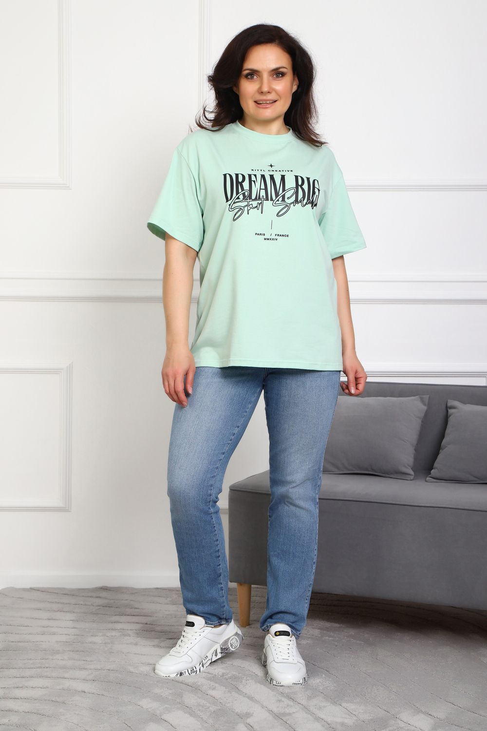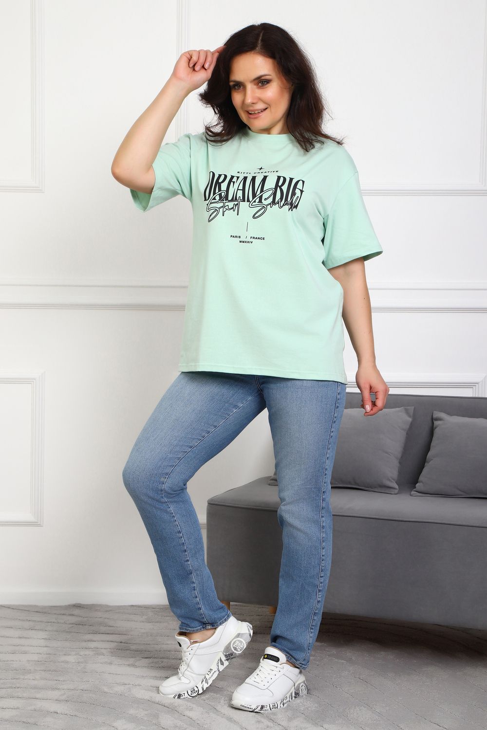 (Туника женская DREAM BIG). Женская туника-футболка изготовлена из высококачественной кулирки, состав которой включает 95% хлопка и 5% лайкры, что придает ей мягкость, воздухопроницаемость и небольшую эластичность. Силуэт модели свободен и удобен, прямого кроя, дополненного короткими рукавами и простым, удобным круглым вырезом горловины. Основным декоративным элементом выступает принт на груди с вдохновляющей надписью "Dream Big Start Small", мотивирующий ставить большие цели и двигаться вперед маленькими шагами. Туника предлагается в сдвоенном размере, позволяющем легко подобрать оптимальный вариант для всех типов телосложения и обеспечить максимальную свободу и комфорт в движении. Это идеальное дополнение вашего гардероба для создания стильных и современных образов.