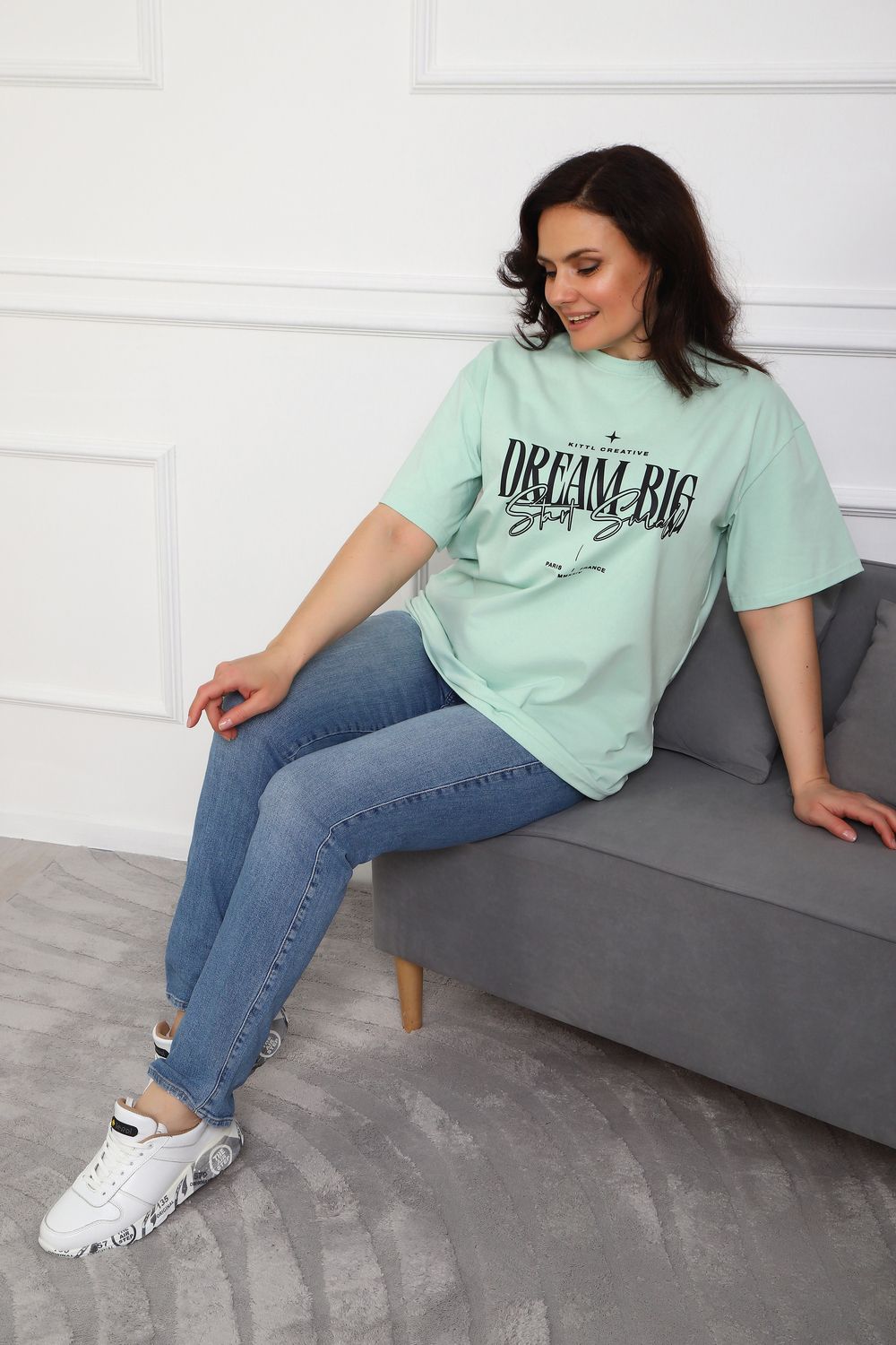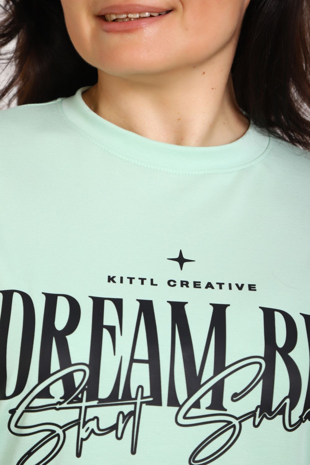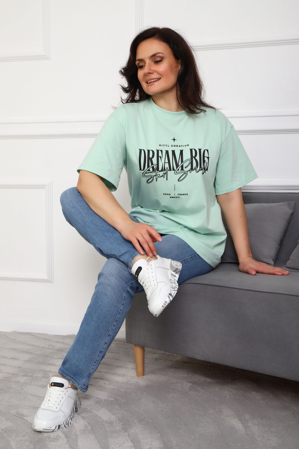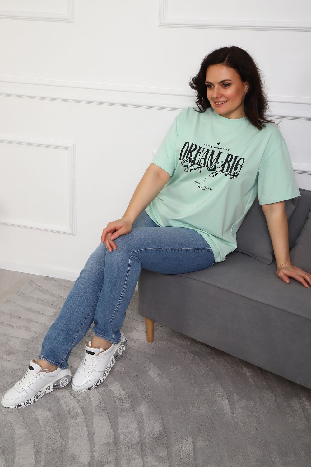 (Туника женская DREAM BIG). Женская туника-футболка изготовлена из высококачественной кулирки, состав которой включает 95% хлопка и 5% лайкры, что придает ей мягкость, воздухопроницаемость и небольшую эластичность. Силуэт модели свободен и удобен, прямого кроя, дополненного короткими рукавами и простым, удобным круглым вырезом горловины. Основным декоративным элементом выступает принт на груди с вдохновляющей надписью "Dream Big Start Small", мотивирующий ставить большие цели и двигаться вперед маленькими шагами. Туника предлагается в сдвоенном размере, позволяющем легко подобрать оптимальный вариант для всех типов телосложения и обеспечить максимальную свободу и комфорт в движении. Это идеальное дополнение вашего гардероба для создания стильных и современных образов.