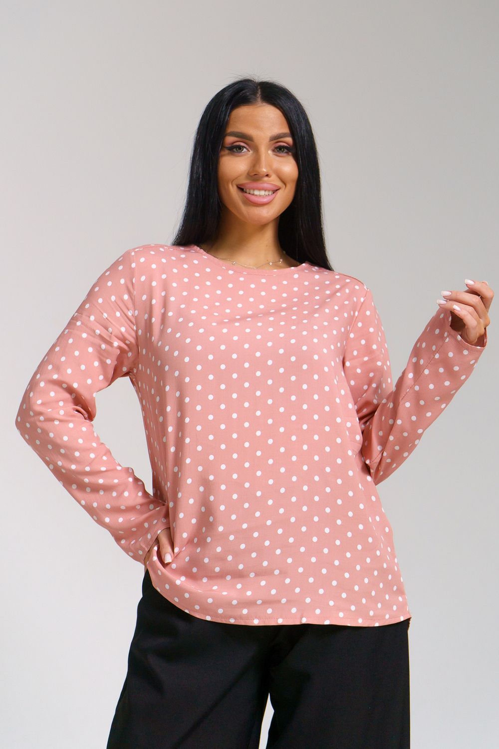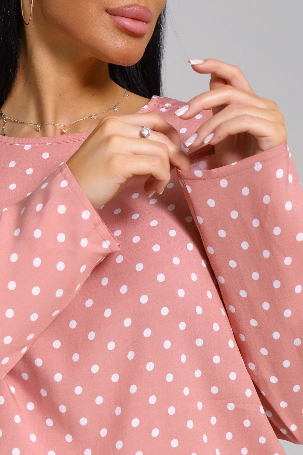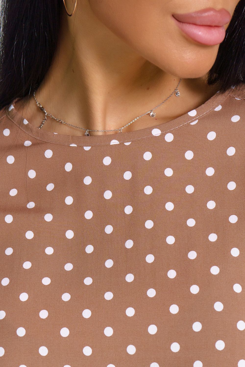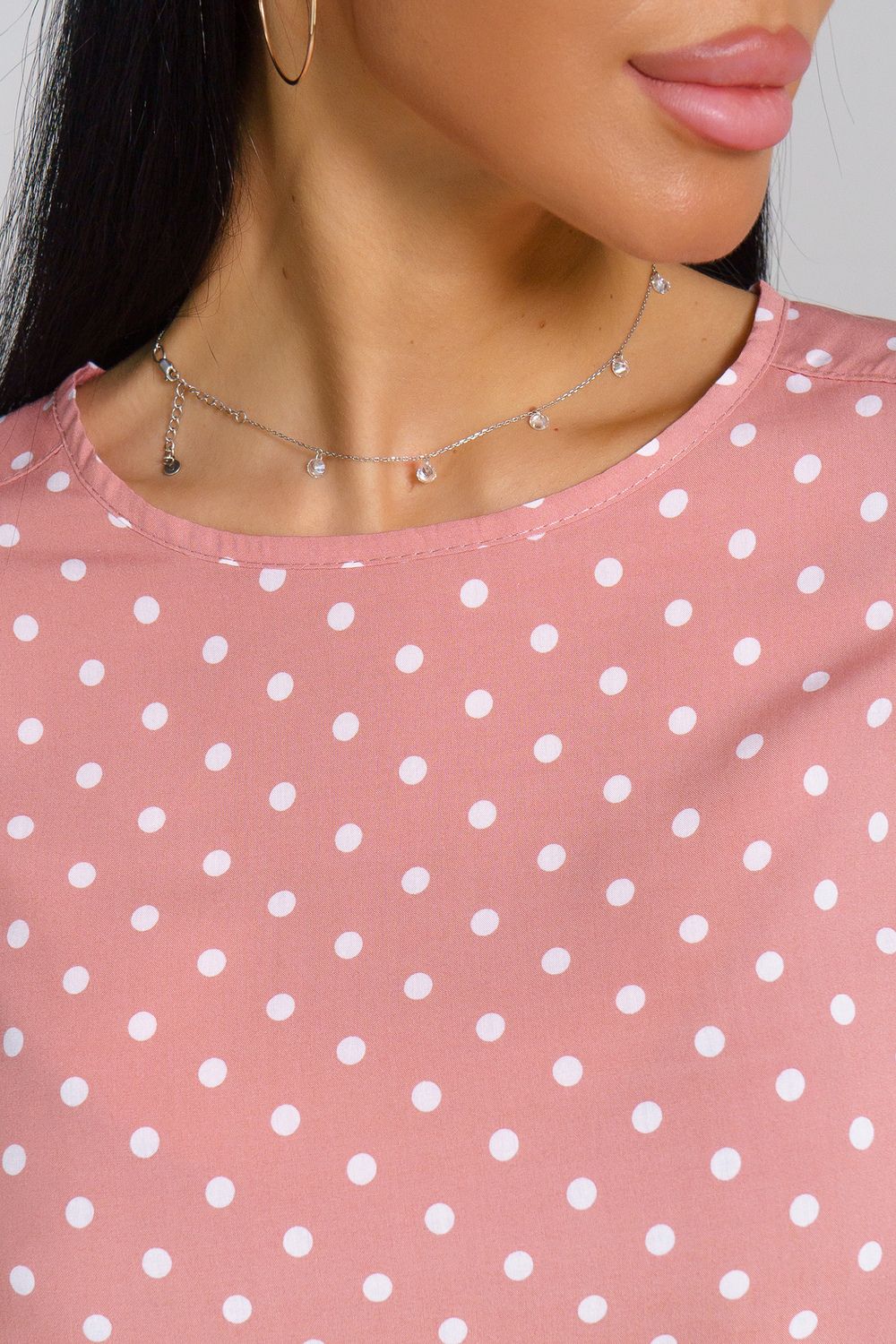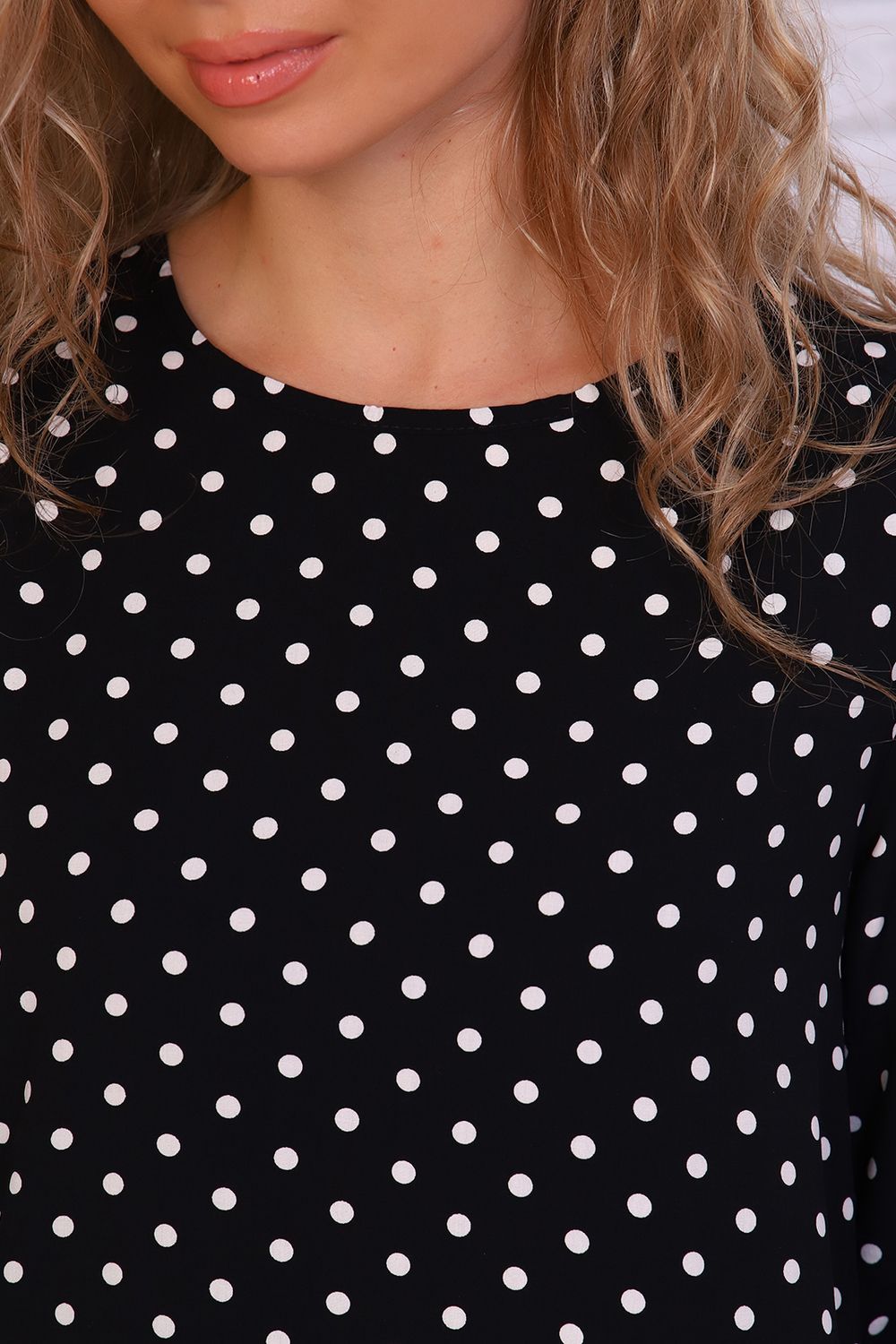 Женственная туника с принтом горох и переходящими на перед кокетками. Горловина окантована, рукава и низ туники подшиты на прямострочке.