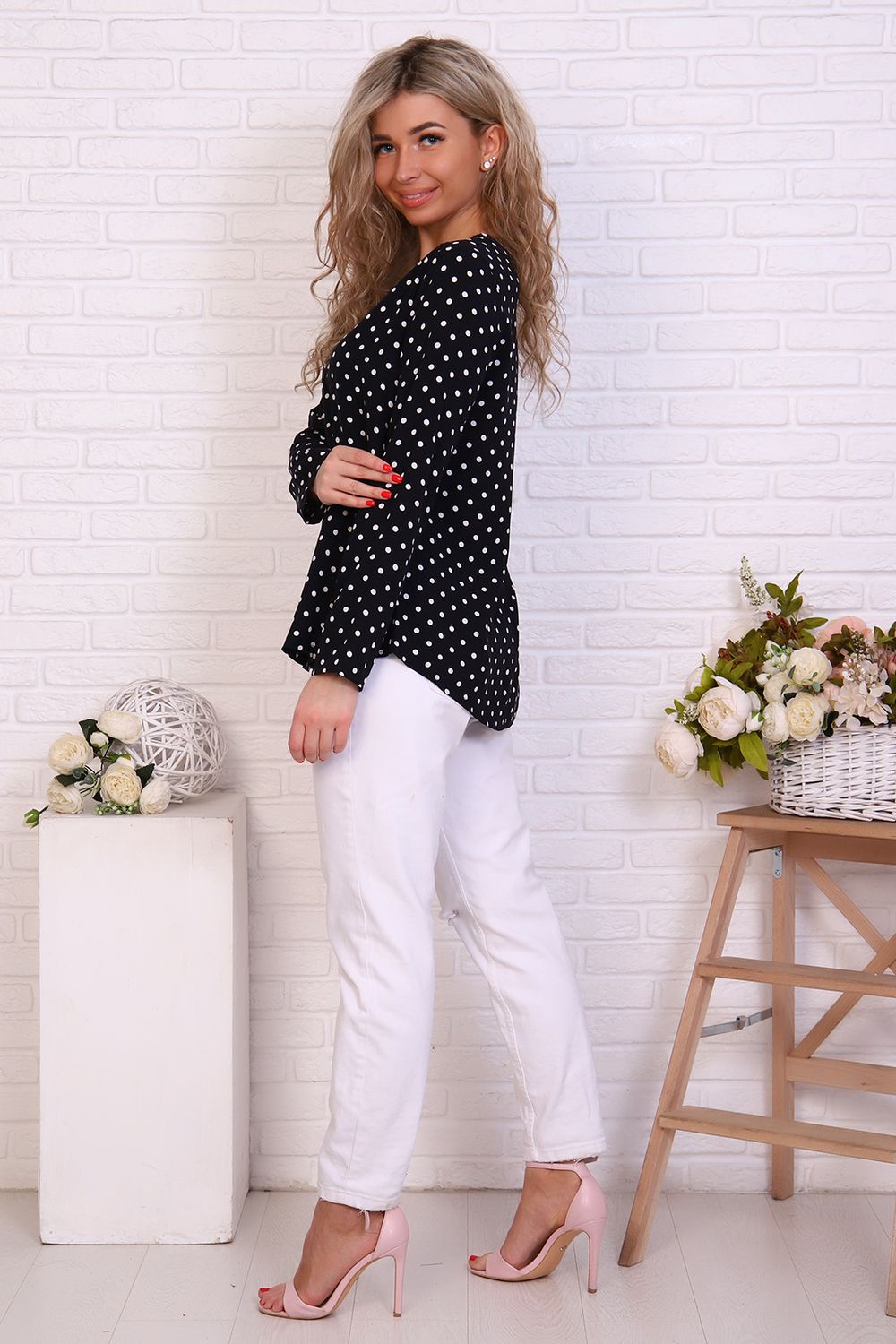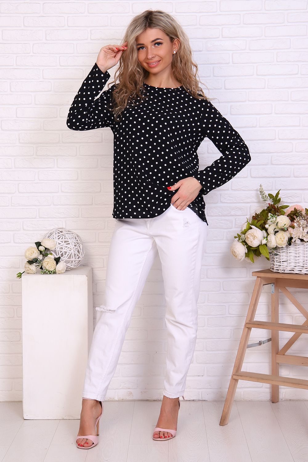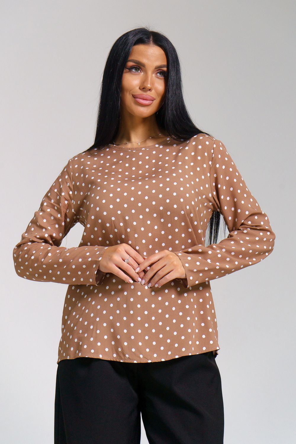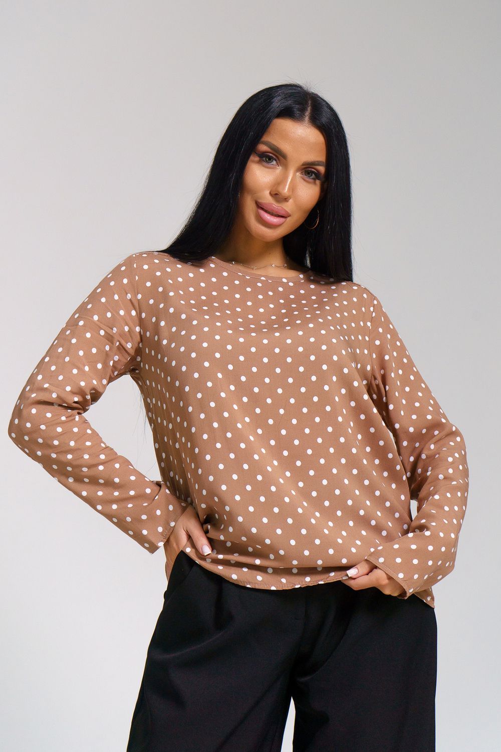 Женственная туника с принтом горох и переходящими на перед кокетками. Горловина окантована, рукава и низ туники подшиты на прямострочке.