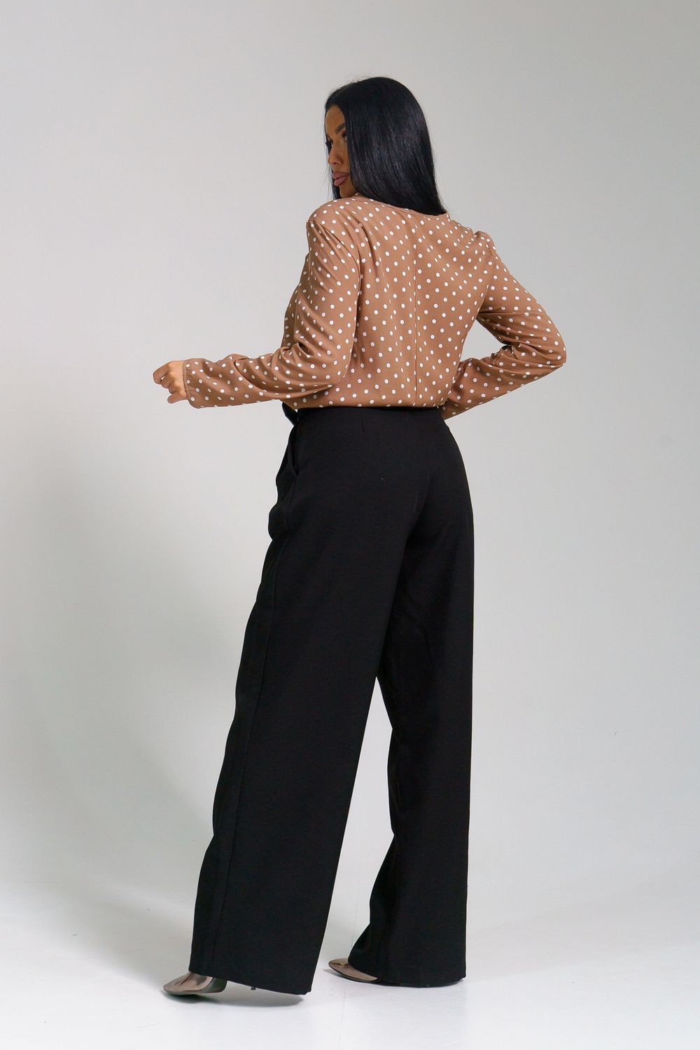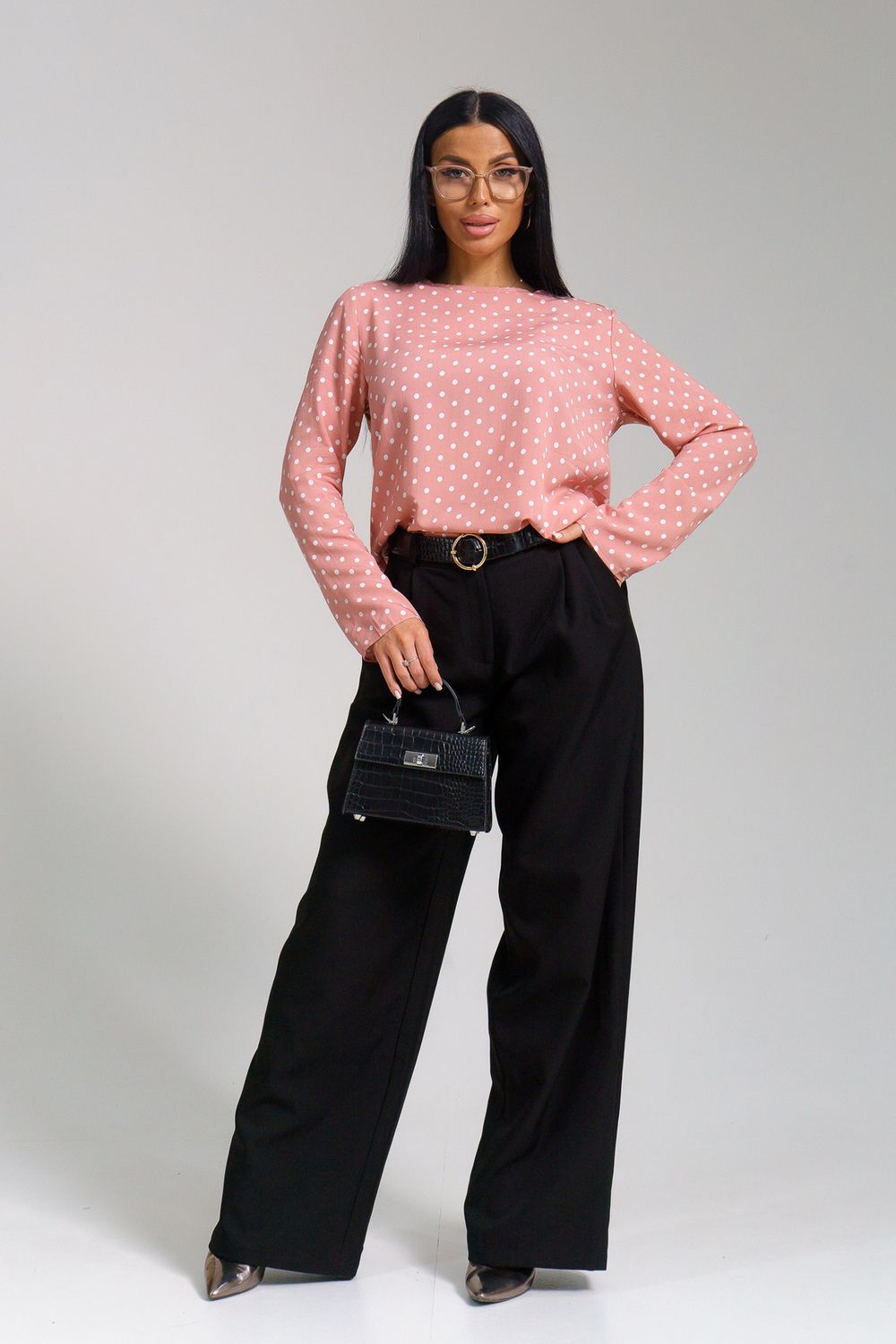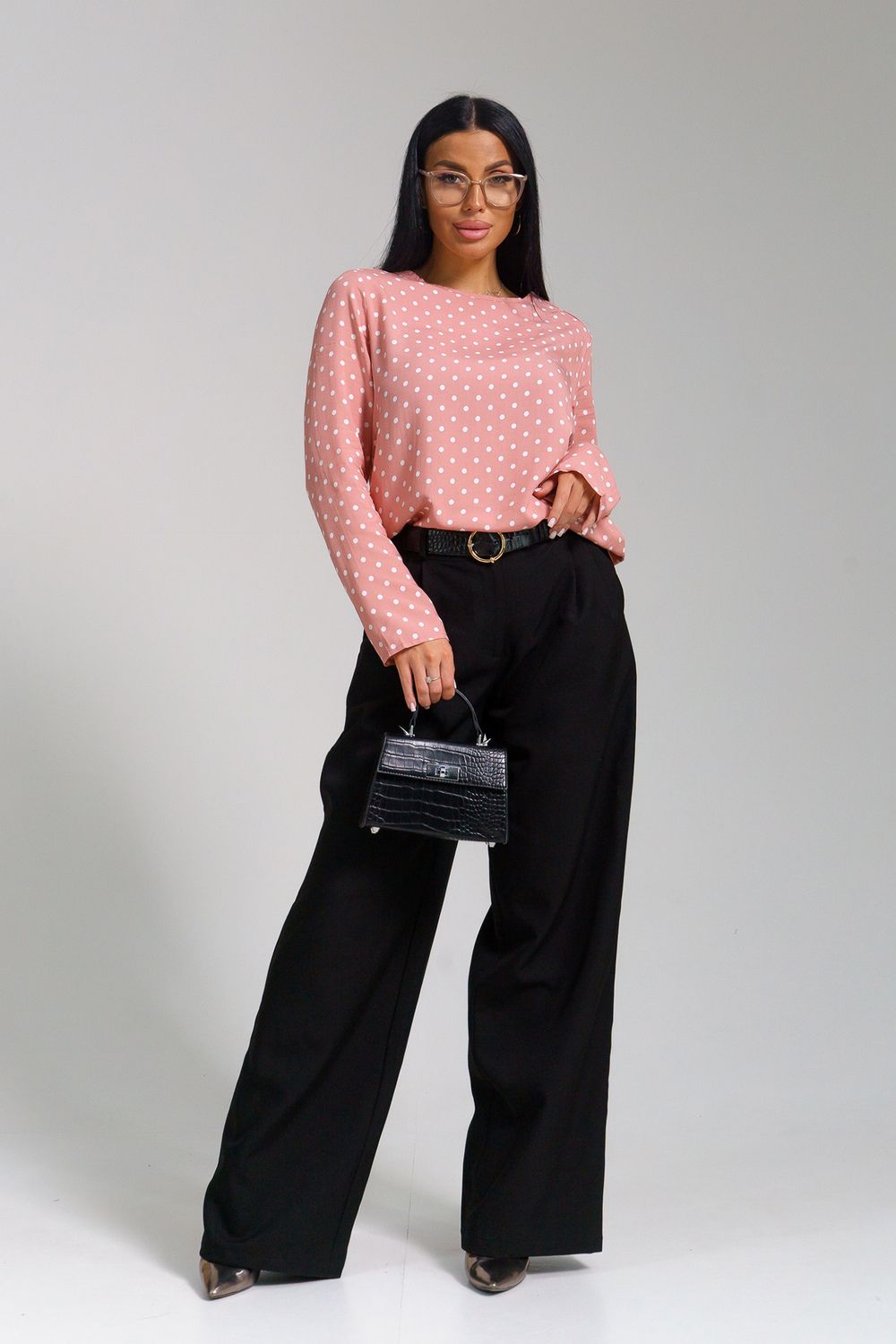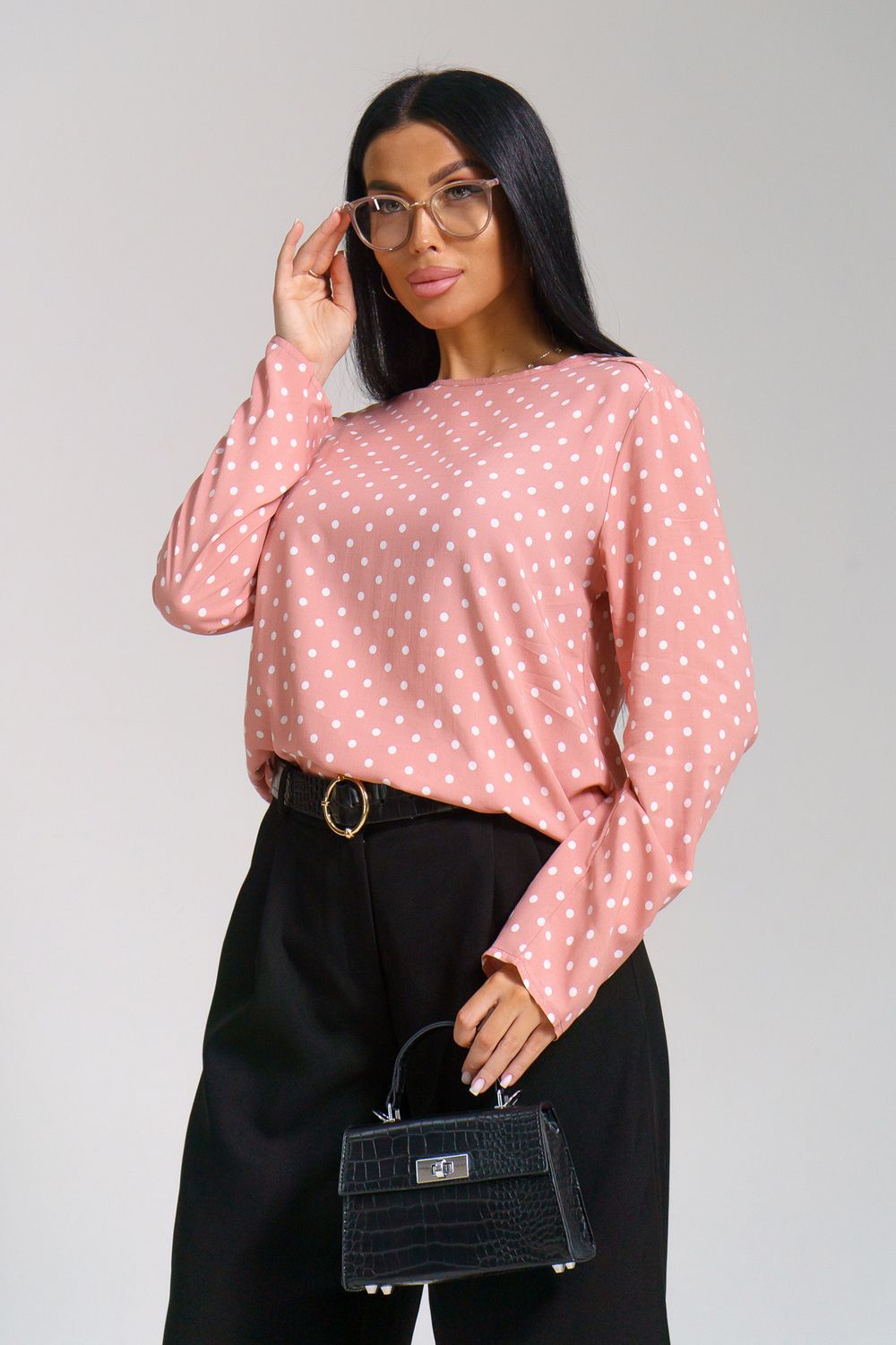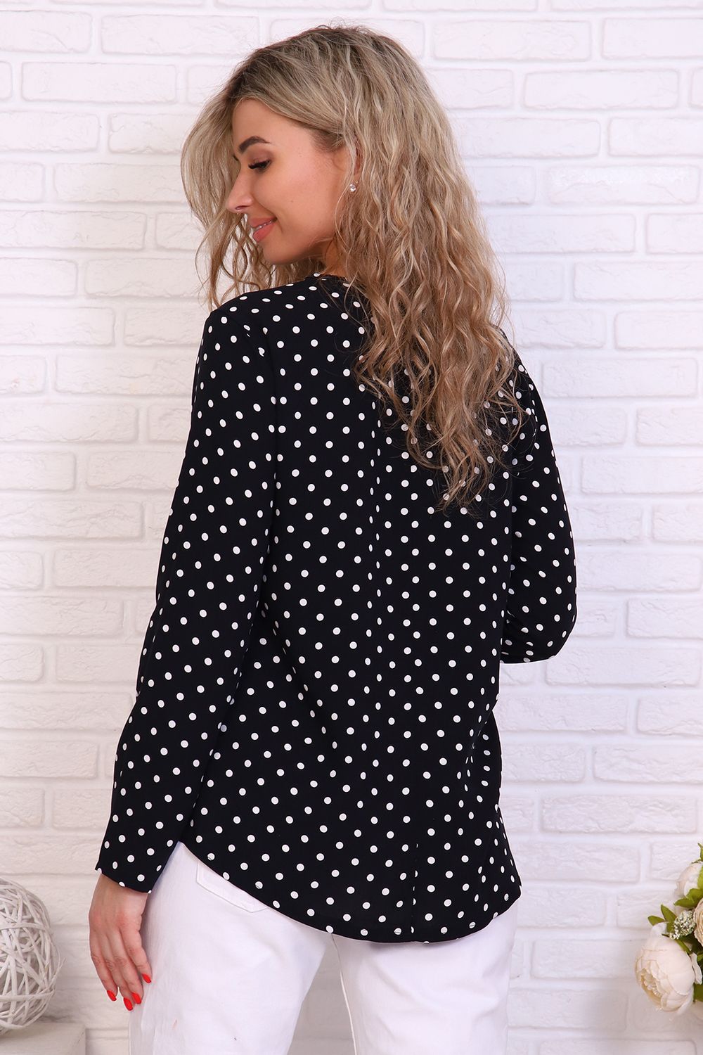 Женственная туника с принтом горох и переходящими на перед кокетками. Горловина окантована, рукава и низ туники подшиты на прямострочке.