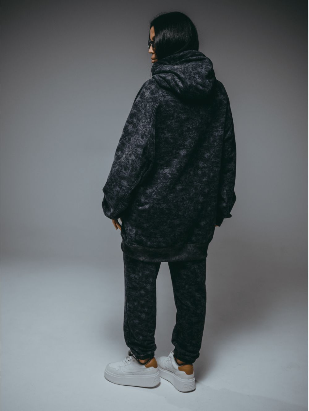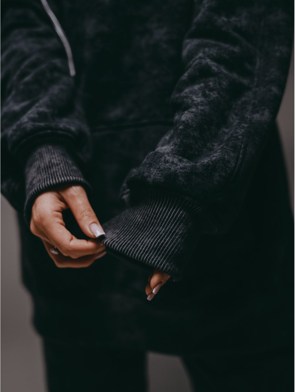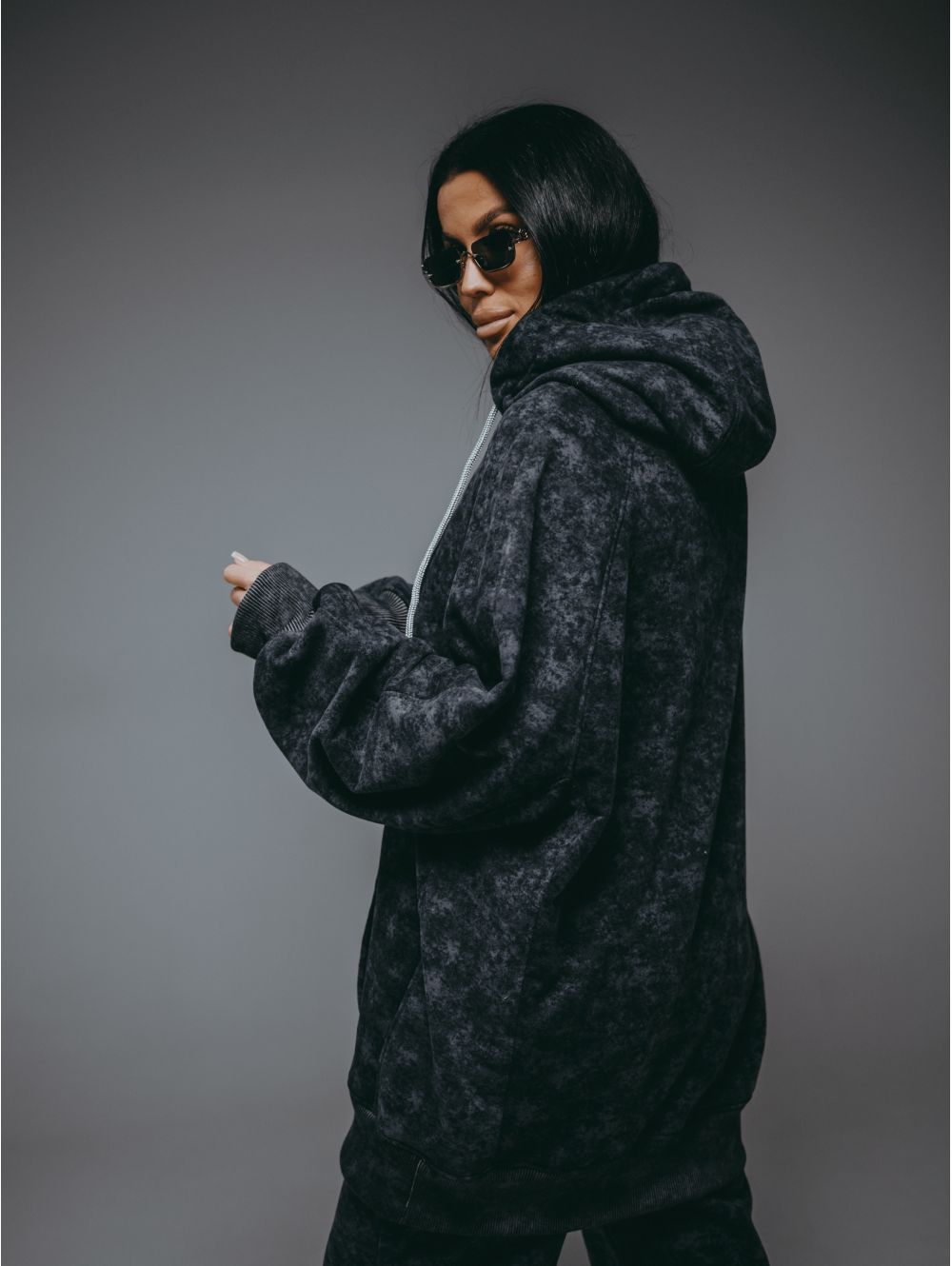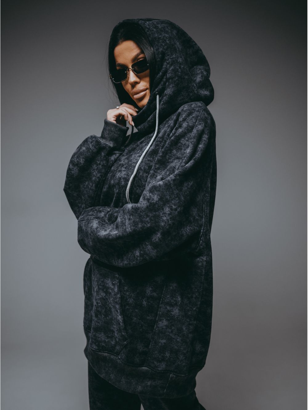 Худи – oversize кроя с притачным поясом по низу, с длинным рукавом реглан на манжете.
