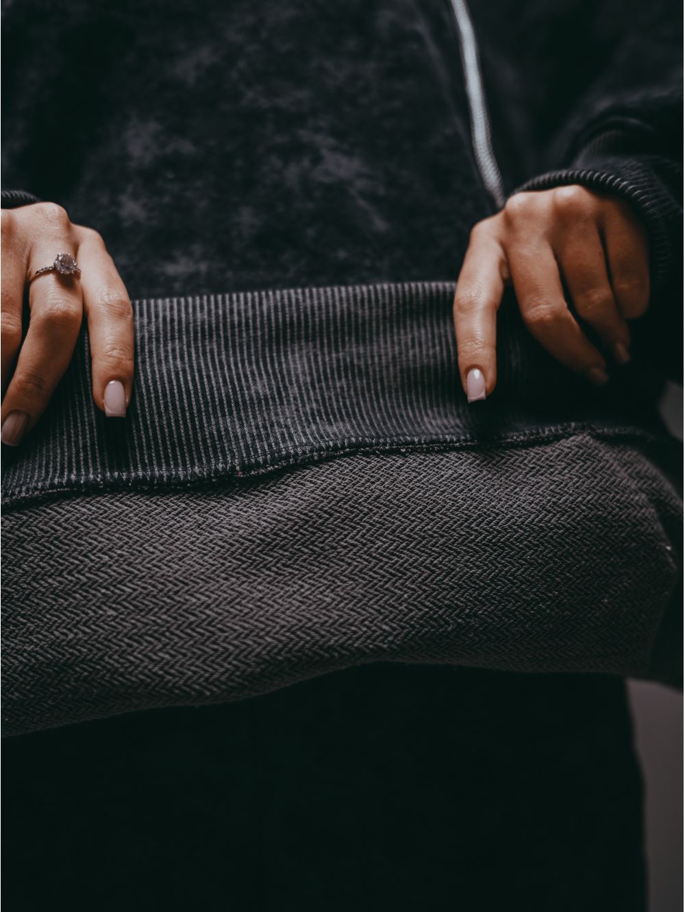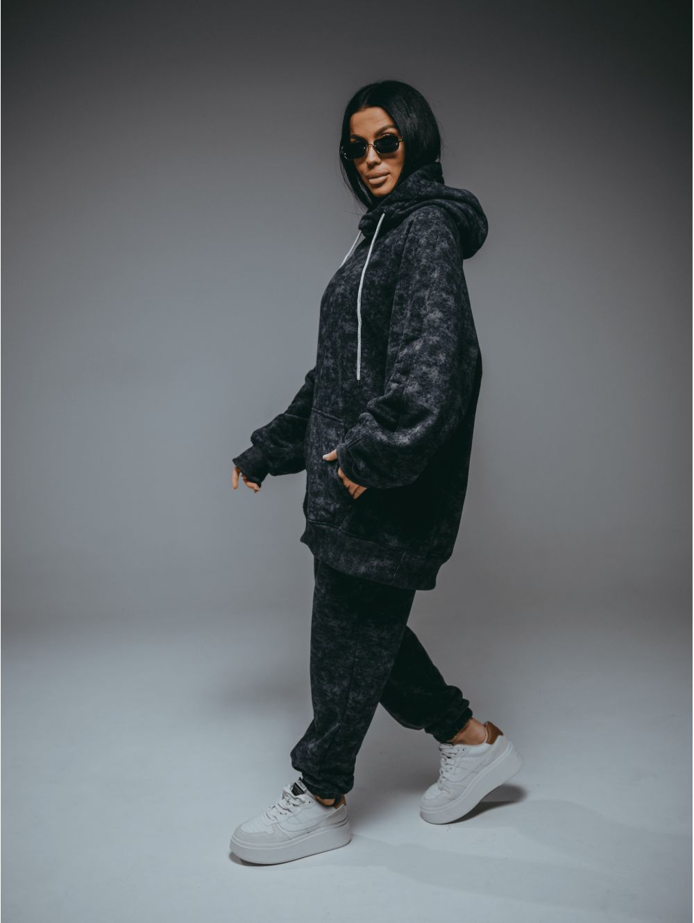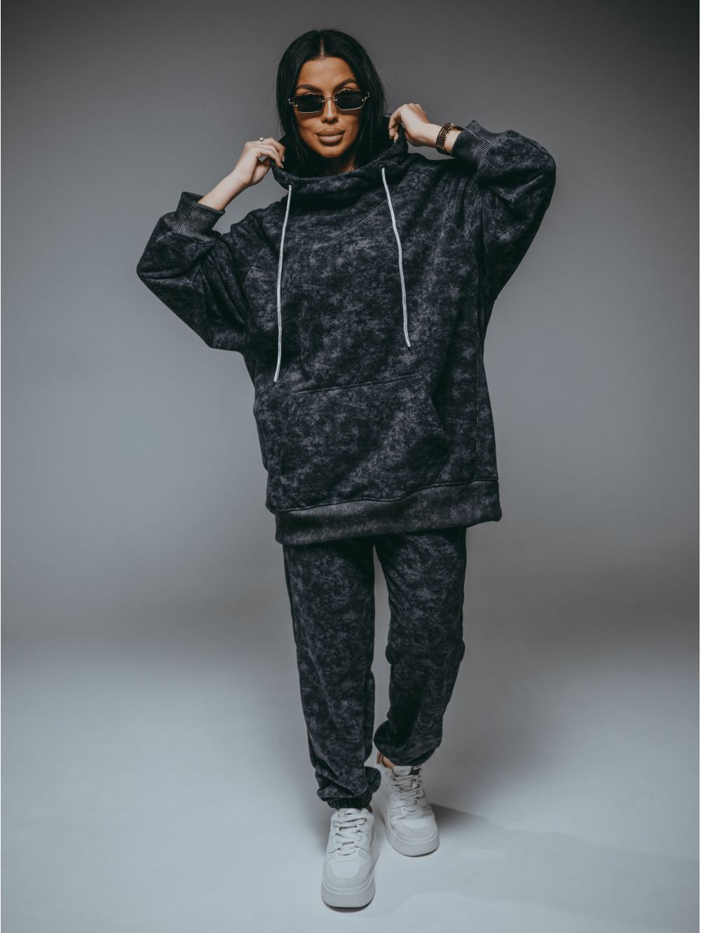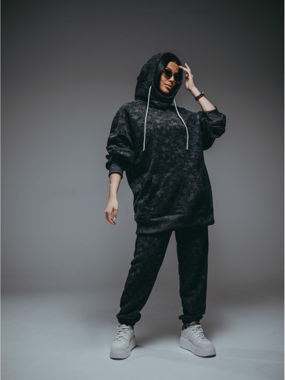 Худи – oversize кроя с притачным поясом по низу, с длинным рукавом реглан на манжете.