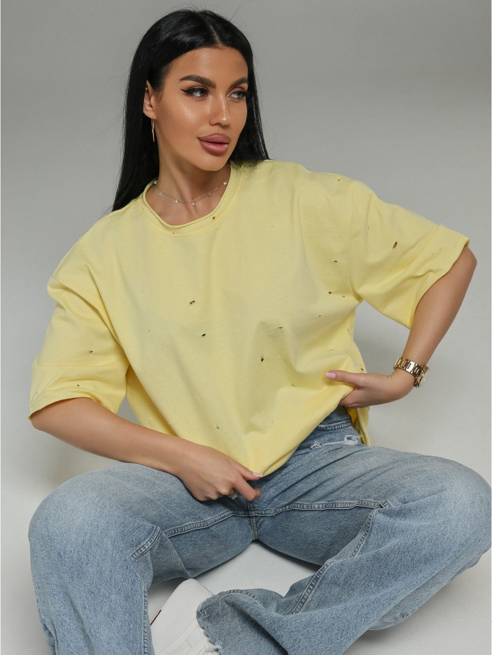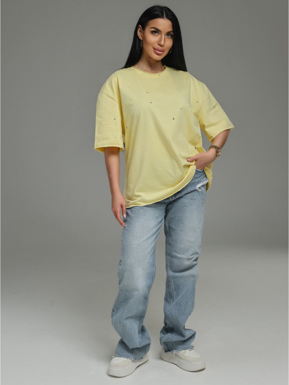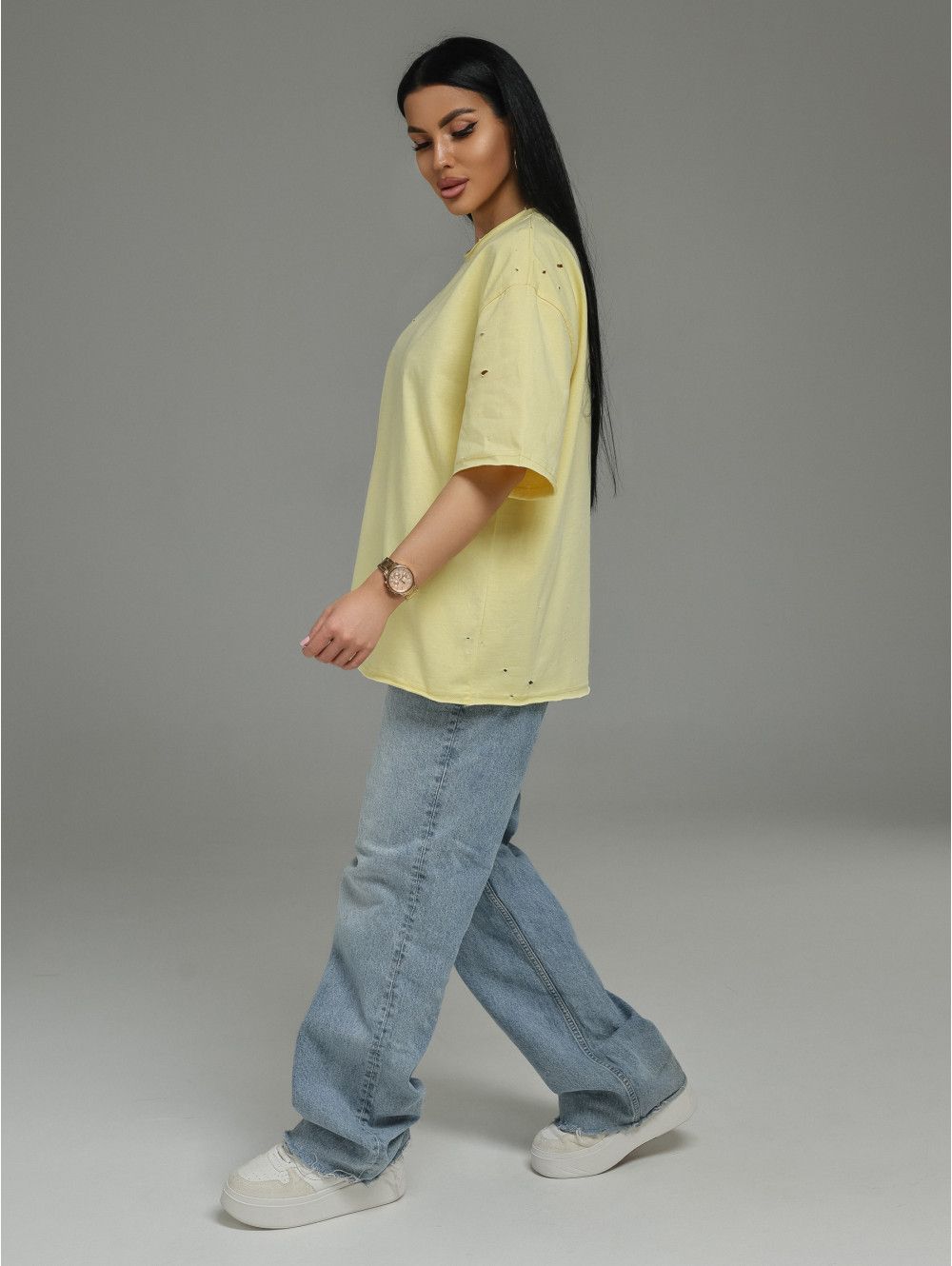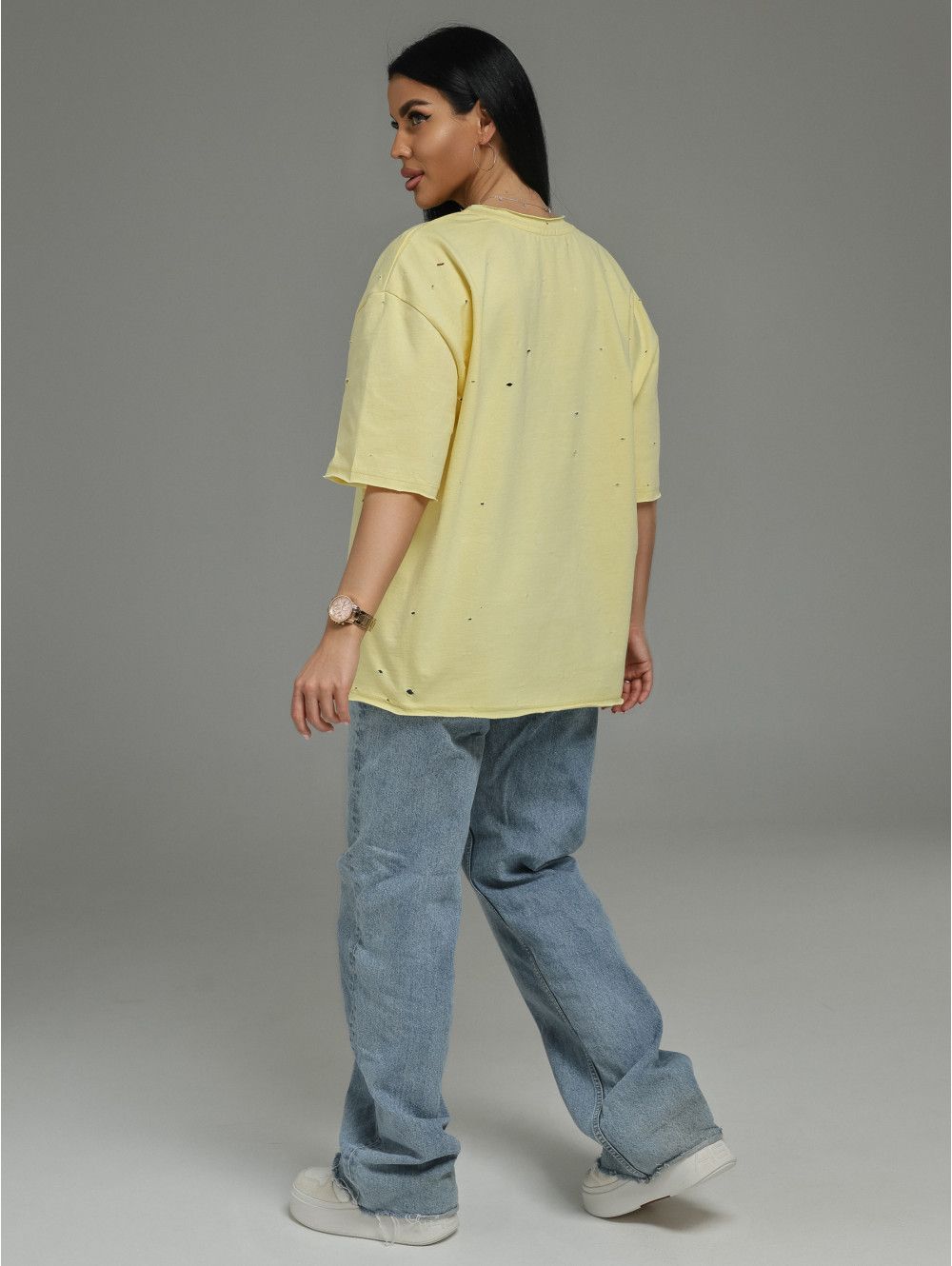 Низ футболки и низ рукавов отстрочены без подгибки. Это современная деталь: край остаётся открытым, но при этом он обработан так, чтобы не осыпаться и не закручиваться. Такой приём создаёт эффект лёгкой небрежности, делает образ более расслабленным и добавляет футболке индивидуальности.